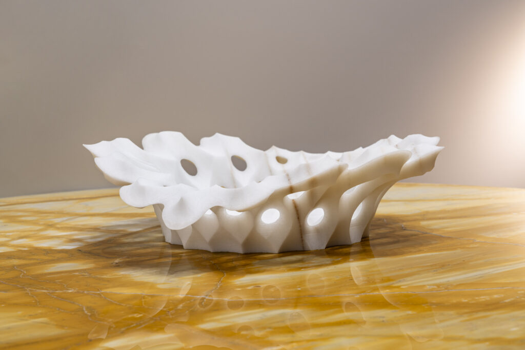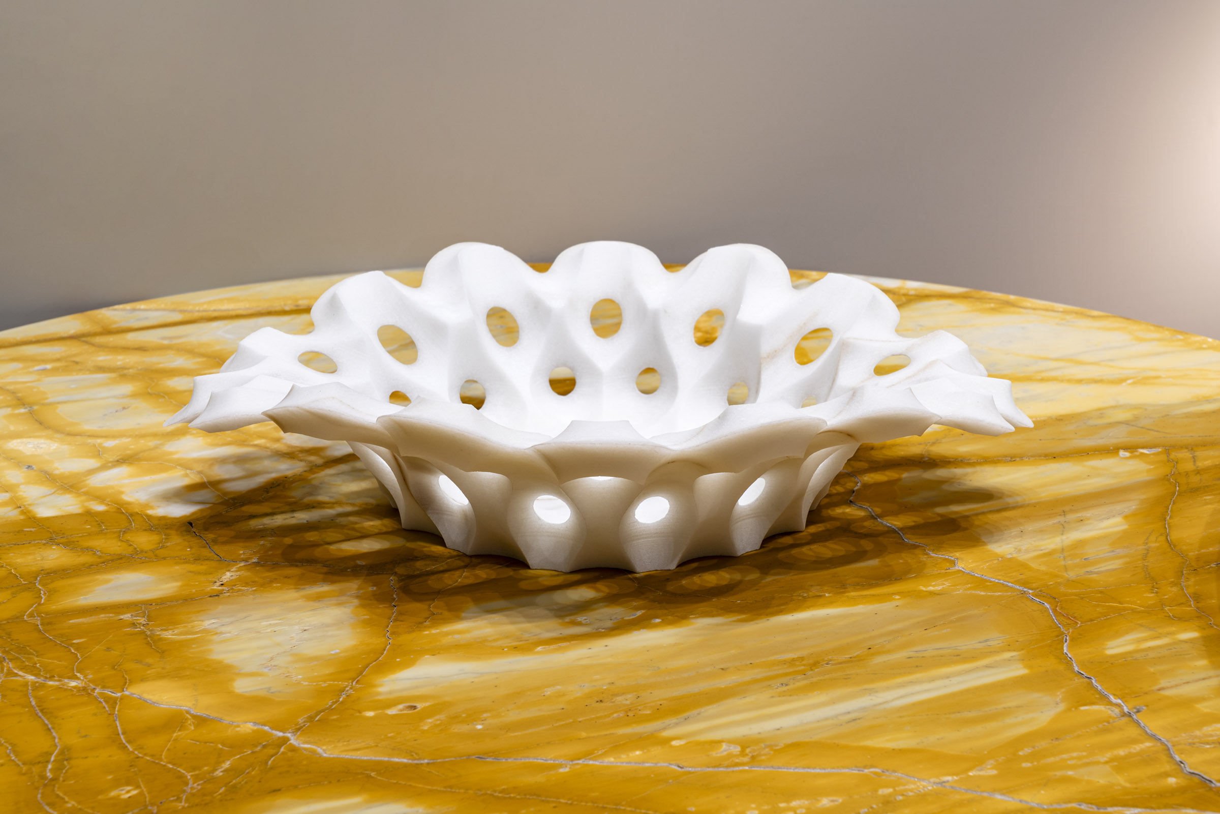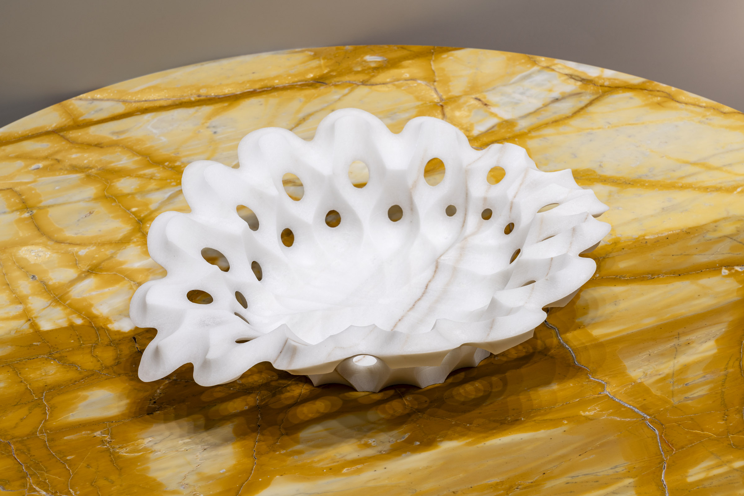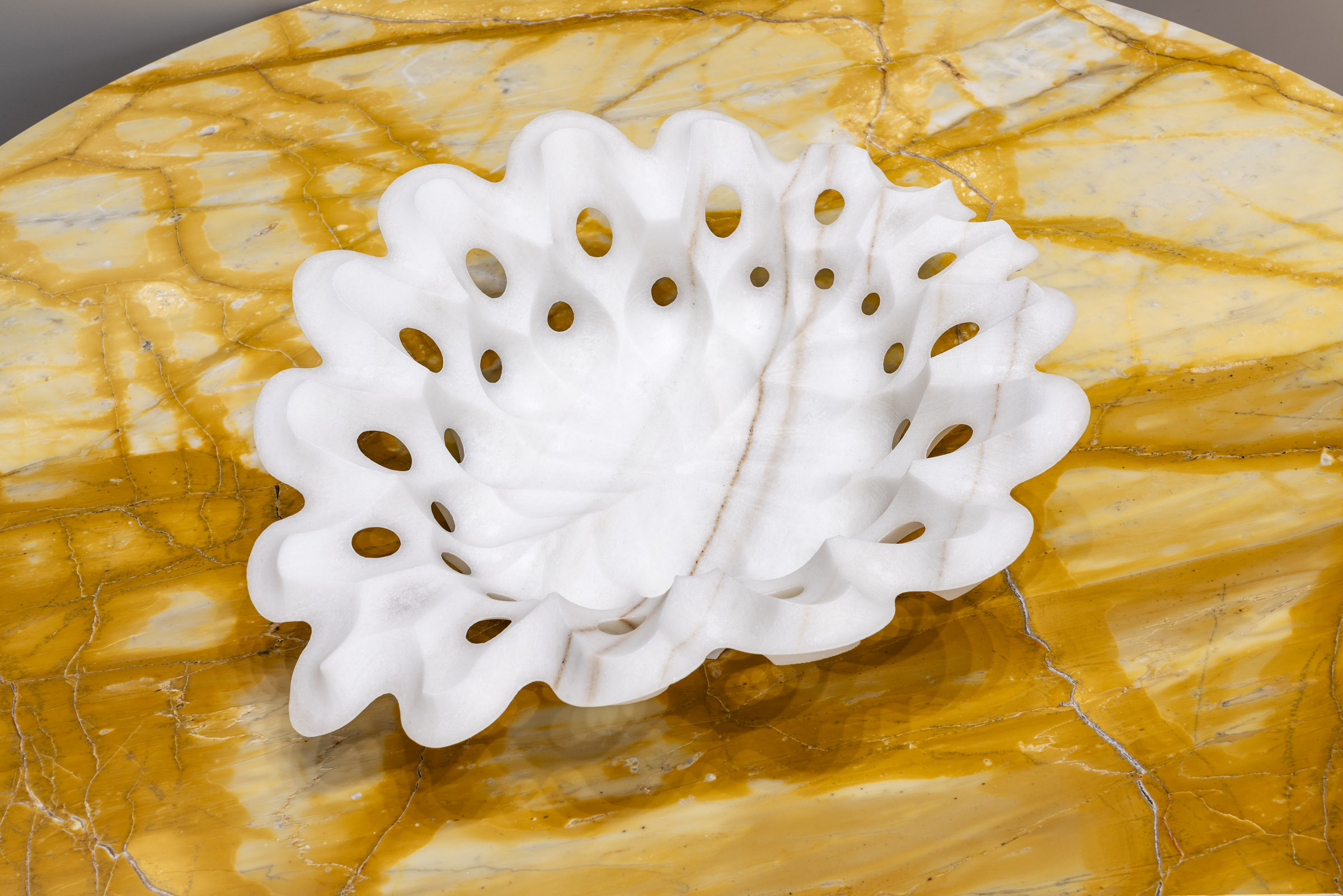 Raffaello GaliottoReticolo explores an architectural language of solids and voids, a lattice that highlights the technical precision behind Sublimis Tabula. The Bianco Lasa Covelano, luminous and veined with elegant patterns, lends an ethereal purity to the piece. The sculpted surfaces interact with the natural grain, forming subtle and refined textures. The Giallo Siena table adds a warm, historic Italian tone. The meeting of crystalline white and golden yellow produces a rich and balanced presence. Reticolo takes on the role of a small domestic architecture, both rigorous and precious.