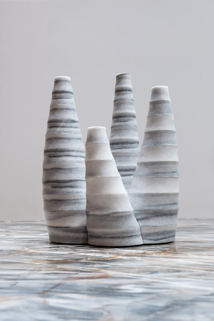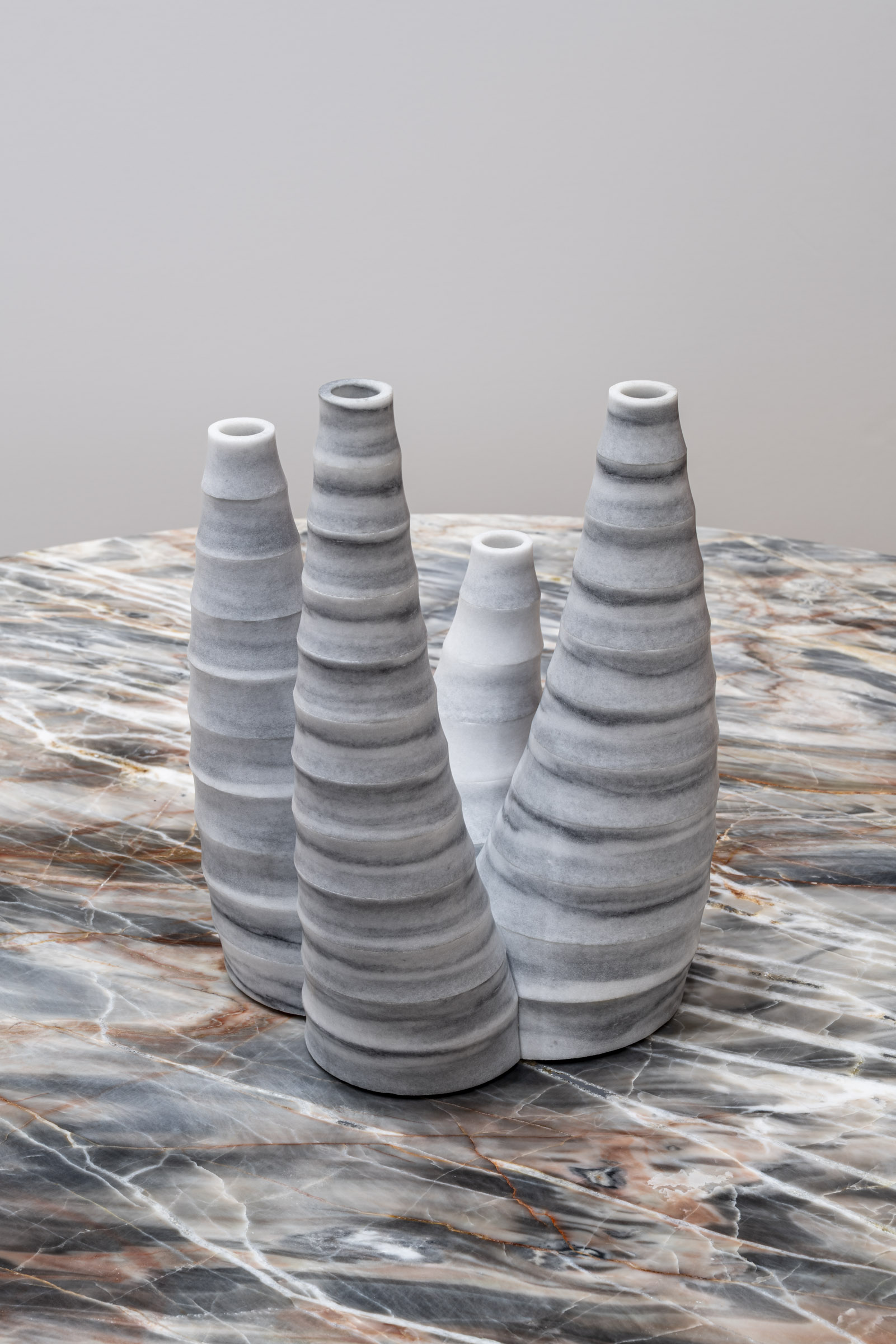 Raffaello GaliottoCulmo stands out for the vertical rhythm of its forms, a dynamic structure that suggests momentum and growth. In line with the Sublimis Tabula approach, it combines technical precision with visual lightness. Striato Olimpico, with its parallel grey and white bands, accentuates the sense of development and continuity. The natural veining guides the eye, perfectly complementing the piece’s geometry. The Confusion Red table adds an energetic, multicolored contrast that amplifies the object’s presence. Culmo merges graphic rigor with chromatic intensity in a contemporary balance.