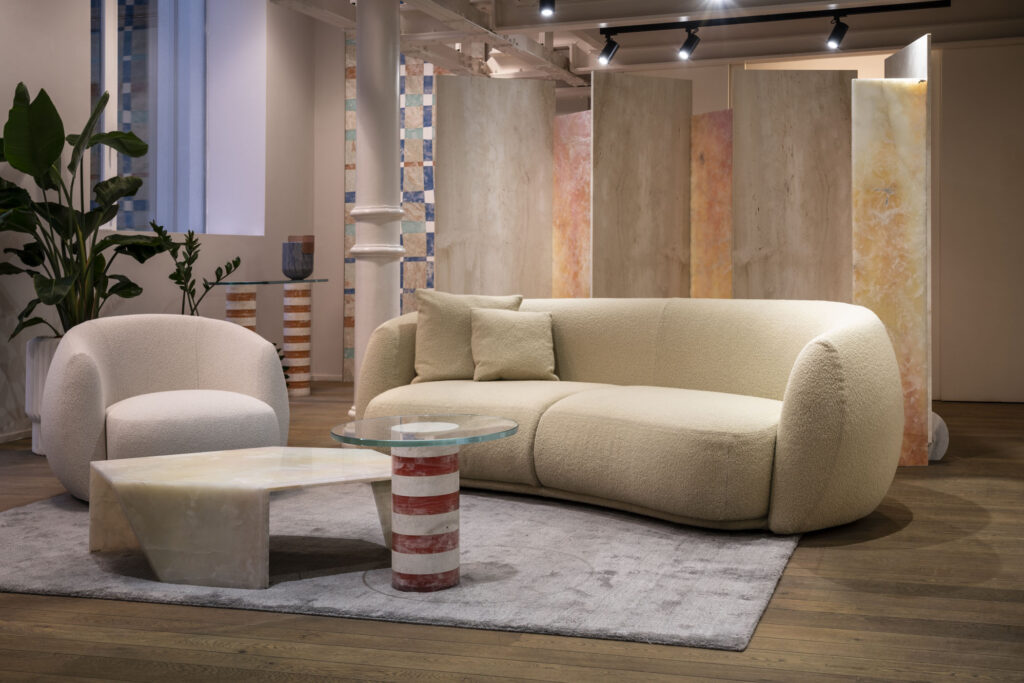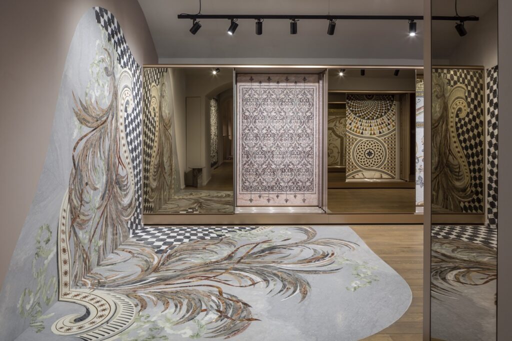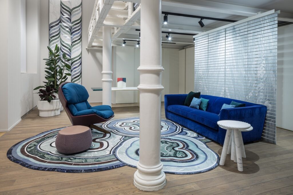 Lo spazio di 350 m2 si sviluppa su tre piani con una specifica disposizione espositiva: il piano terra ospita le collezioni di design, ovvero superfici e complementi d'arredo. Inoltre, un'elegante area lounge si affaccia sul cortile liberty del palazzo.