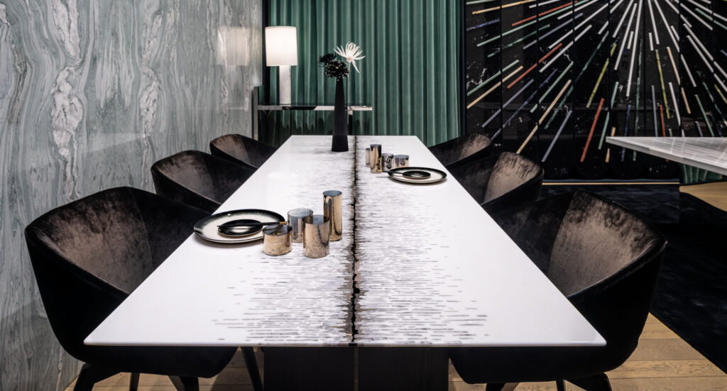 Il concept dello showroom è nato dal desiderio di "dare voce al marmo", ovvero di raccontare un processo che parte dalla materia prima e si trasforma in linguaggi diversi. Il marmo è un materiale apparentemente rigido e austero che, in realtà, si rivela estremamente espressivo. "Sta a noi che lo lavoriamo capirlo e lasciarlo esprimere", afferma Alessandra Malagoli Budri, direttore artistico dell'azienda.