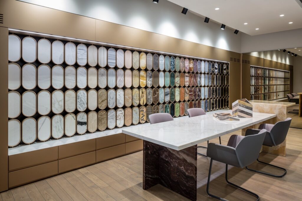 Marmi, Onici, pietre semipreziose, Travertini e Quarziti sono esposti così come le innumerevoli texture e finiture dei materiali.