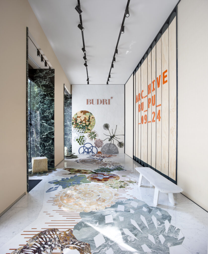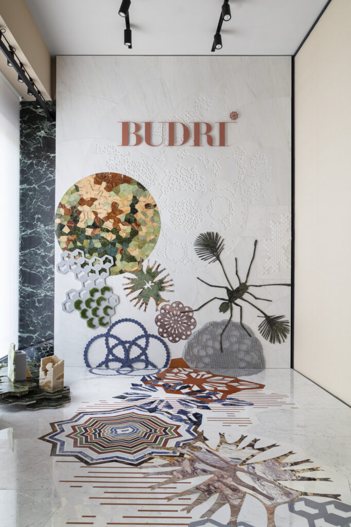 Il percorso affonda le radici nella prima collaborazione tra Budri e Patricia Urquiola: Macrosterias, progetto che ha segnato un  punto di svolta per l’azienda, il cui core business di allora era l’intarsio classico. Nato come “salto nel buio”, Macrosterias ha introdotto un microcosmo digitale-biologico nel mondo dell’intarsio artistico, trasformando la superficie lapidea in un paesaggio tridimensionale  di pattern, geometrie organiche e cromie vibranti. Il marmo si è fatto tappeto, stuoia tropicale, rivestimento verticale capace di sorprendere per profondità e leggerezza visiva.