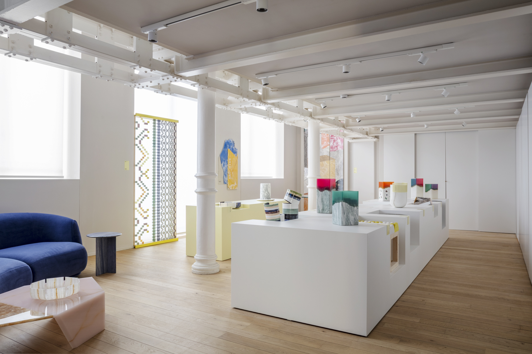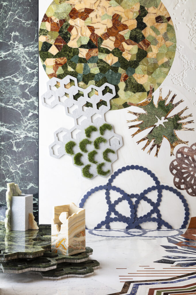 ARC_HIVE raccoglie alcuni dei pezzi più iconici nati da questo dialogo creativo, tra cui il grande “tropical mat” della collezione Macrosterias: un tappeto di marmo lungo undici metri e un rivestimento verticale alto cinque metri, che accolgono i visitatori con un forte impatto scenografico.