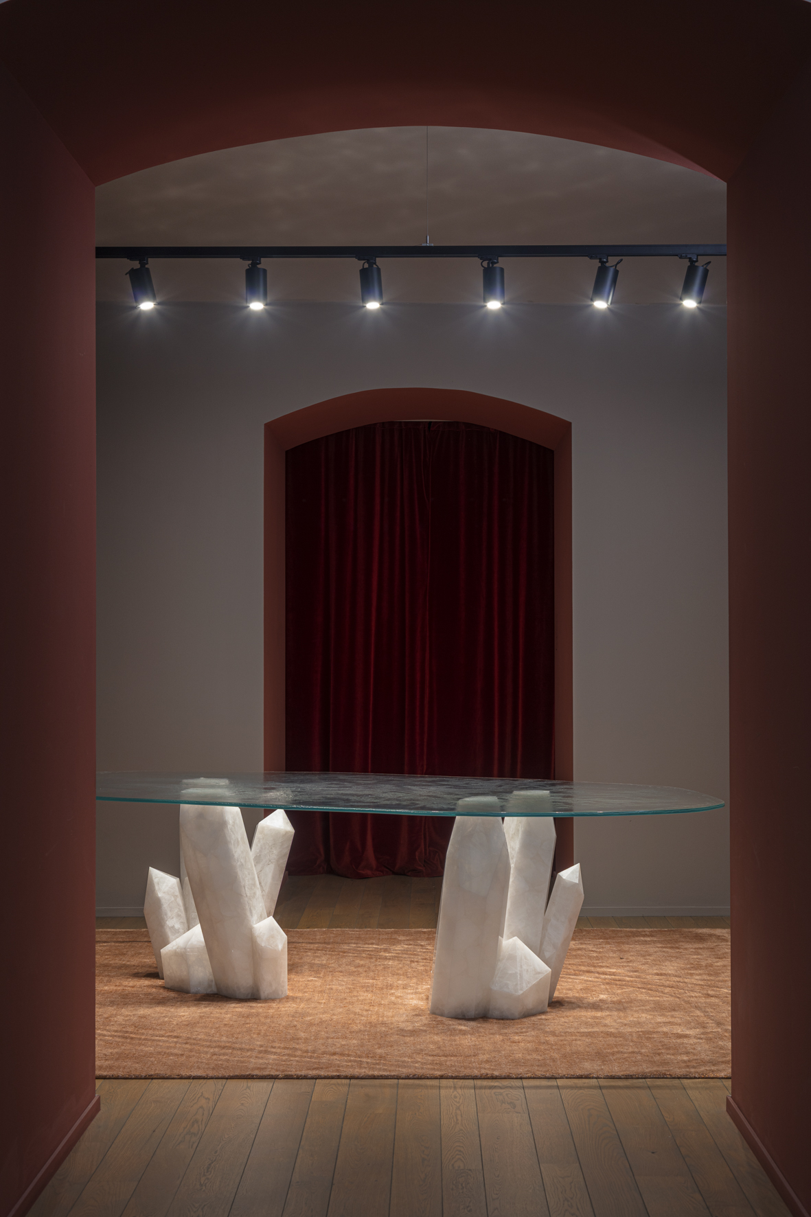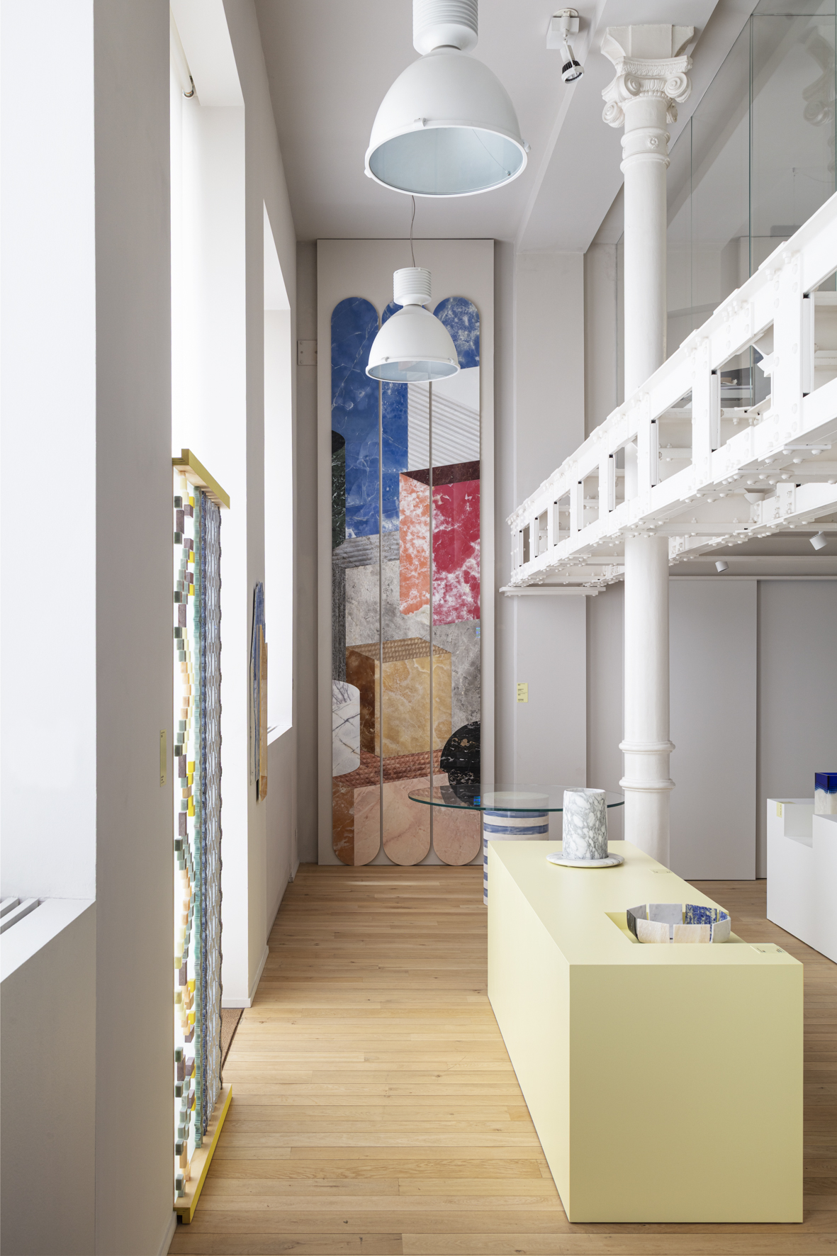 L’allestimento mette in luce la continua sperimentazione di Budri, capace di unire marmo, legno, vetro, resine e altri materiali in forme inedite. Il marmo si trasforma così da materiale classico e rigido a superficie narrativa, dinamica e sorprendente. L’esposizione, dal taglio museale ed essenziale, presenta 20 prodotti di diverse collezioni storiche del brand; completano il percorso quattro superfici decorative dedicate alle collezioni Papiro, Architexture, Nat|f|Use ed Earthquake.