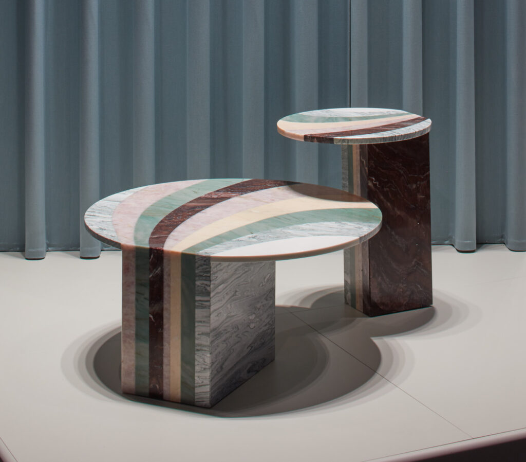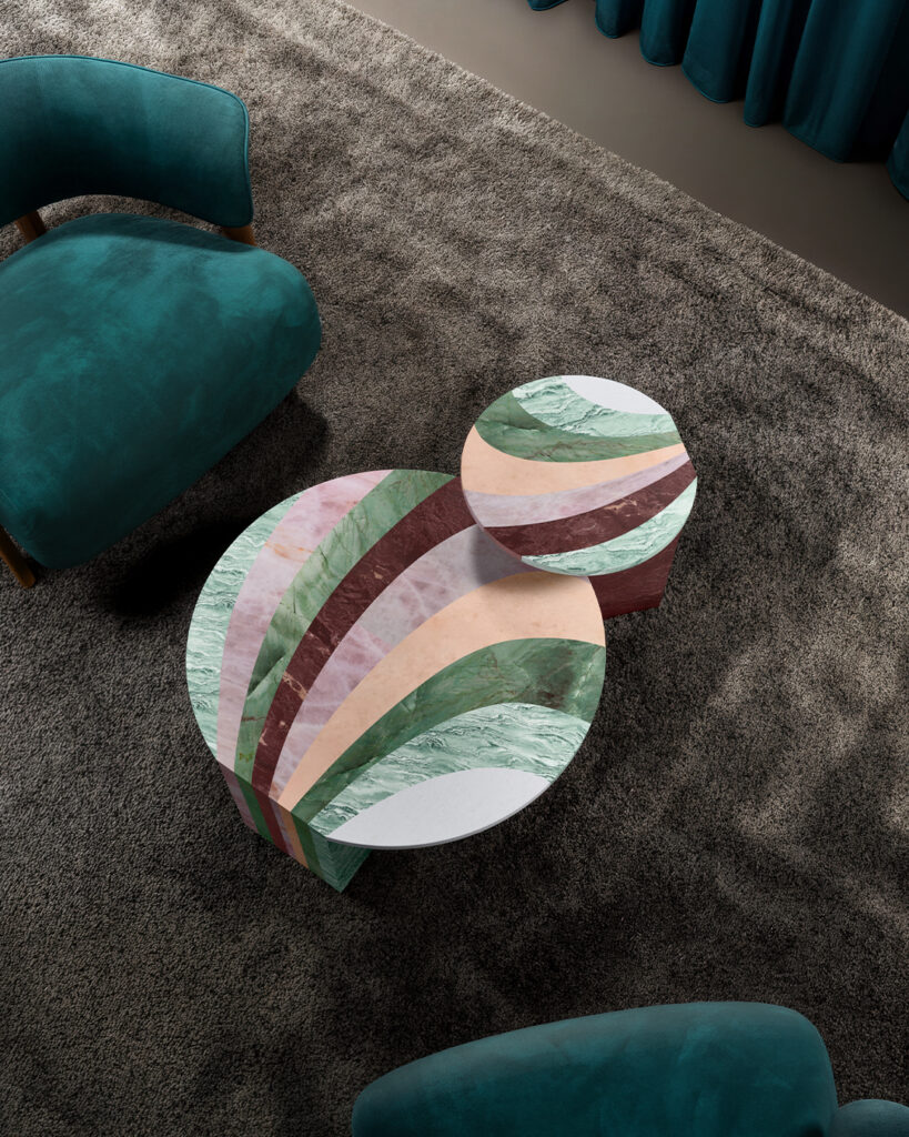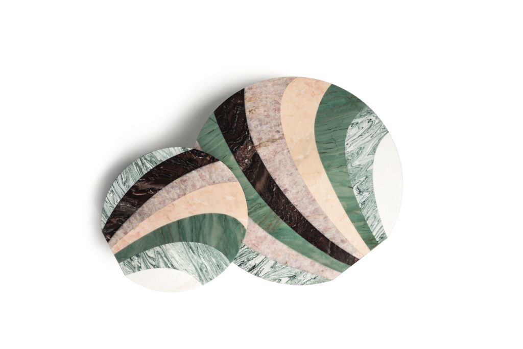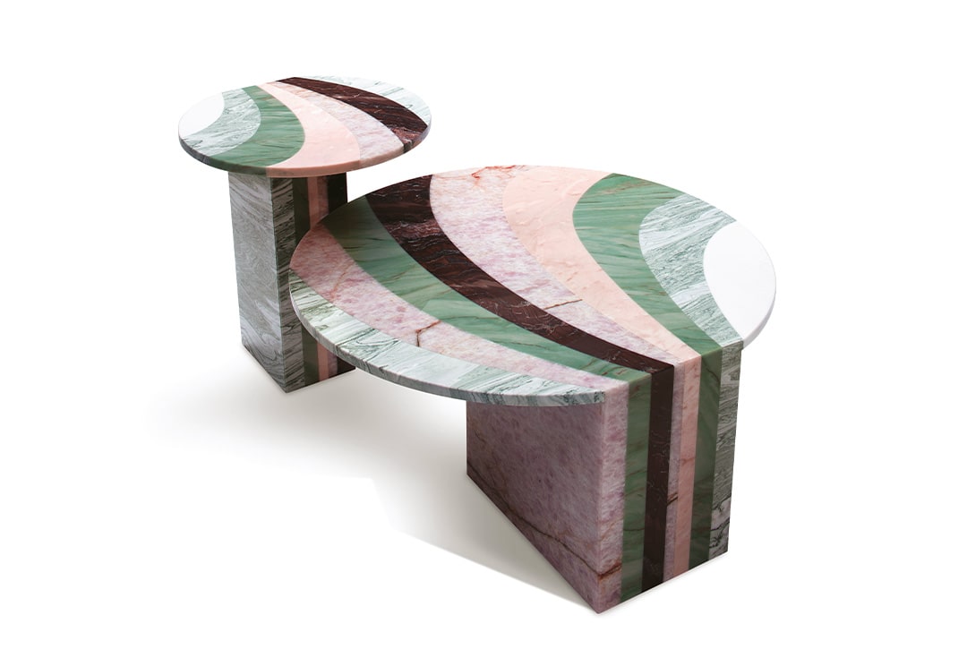 Patricia UrquiolaAn exercise in the use of shades and colour gradations with pastel shades. The coffee tables are presented in pairs with different heights and diameters. Their unique design is distinguished by the graphic continuity of the circular top and monolithic leg. The Aegean Pink, Pink Quartzite, Verde Cipollino, Verde Acquamarina and Sequoia Redwood marbles have vivid veins that make the accessories the standout features of a space.