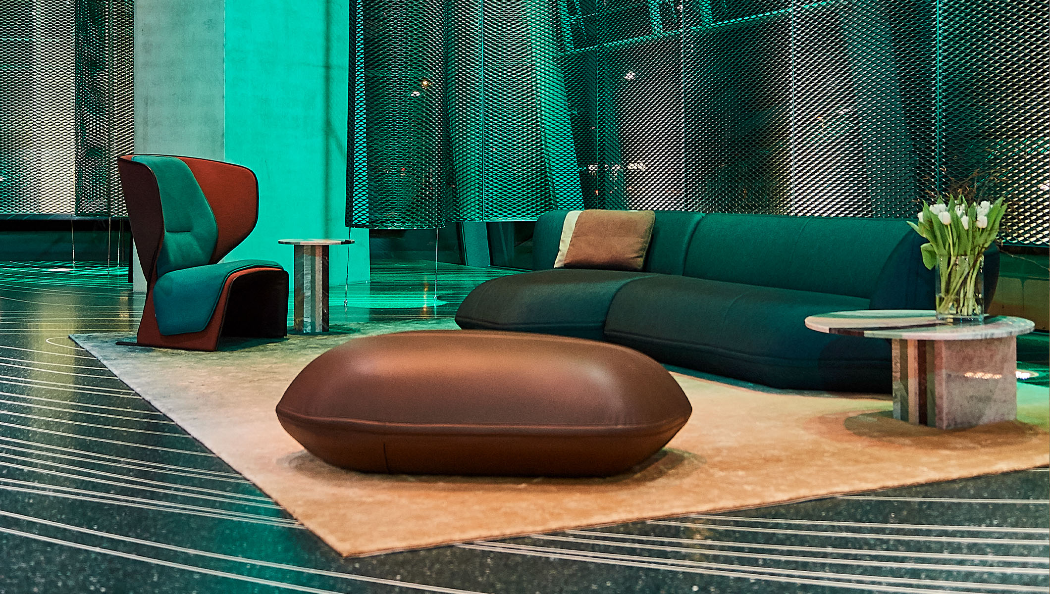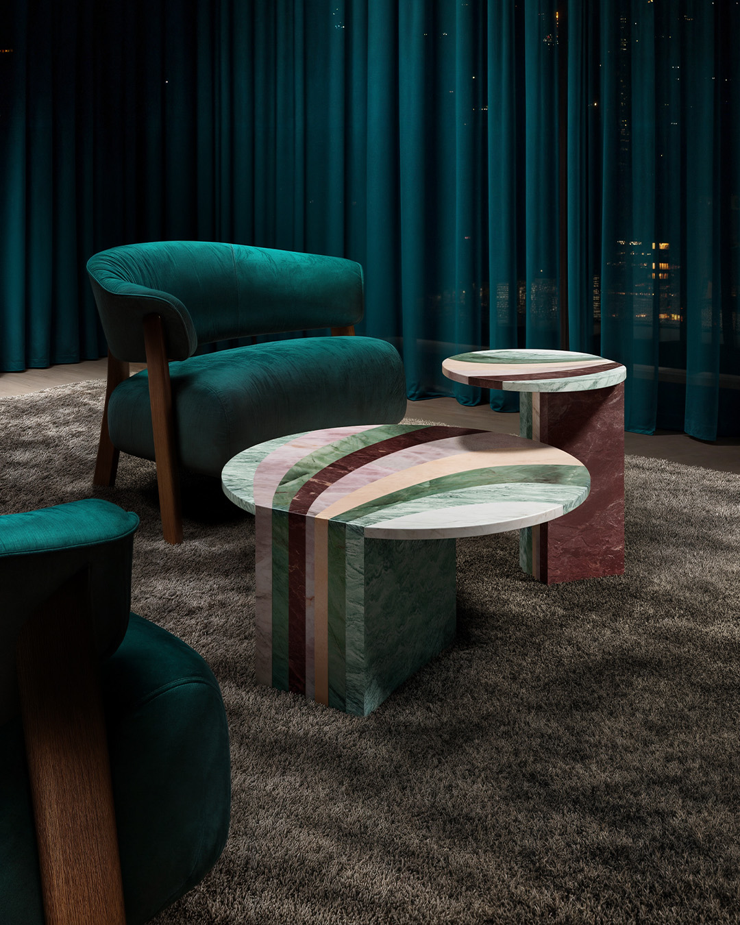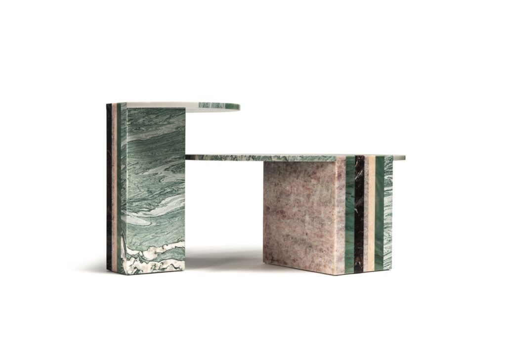 Patricia UrquiolaAn exercise in the use of shades and colour gradations with pastel shades. The coffee tables are presented in pairs with different heights and diameters. Their unique design is distinguished by the graphic continuity of the circular top and monolithic leg. The Aegean Pink, Pink Quartzite, Verde Cipollino, Verde Acquamarina and Sequoia Redwood marbles have vivid veins that make the accessories the standout features of a space.