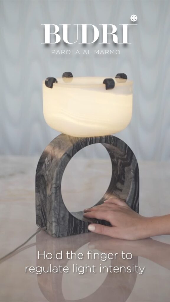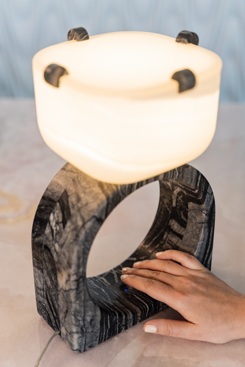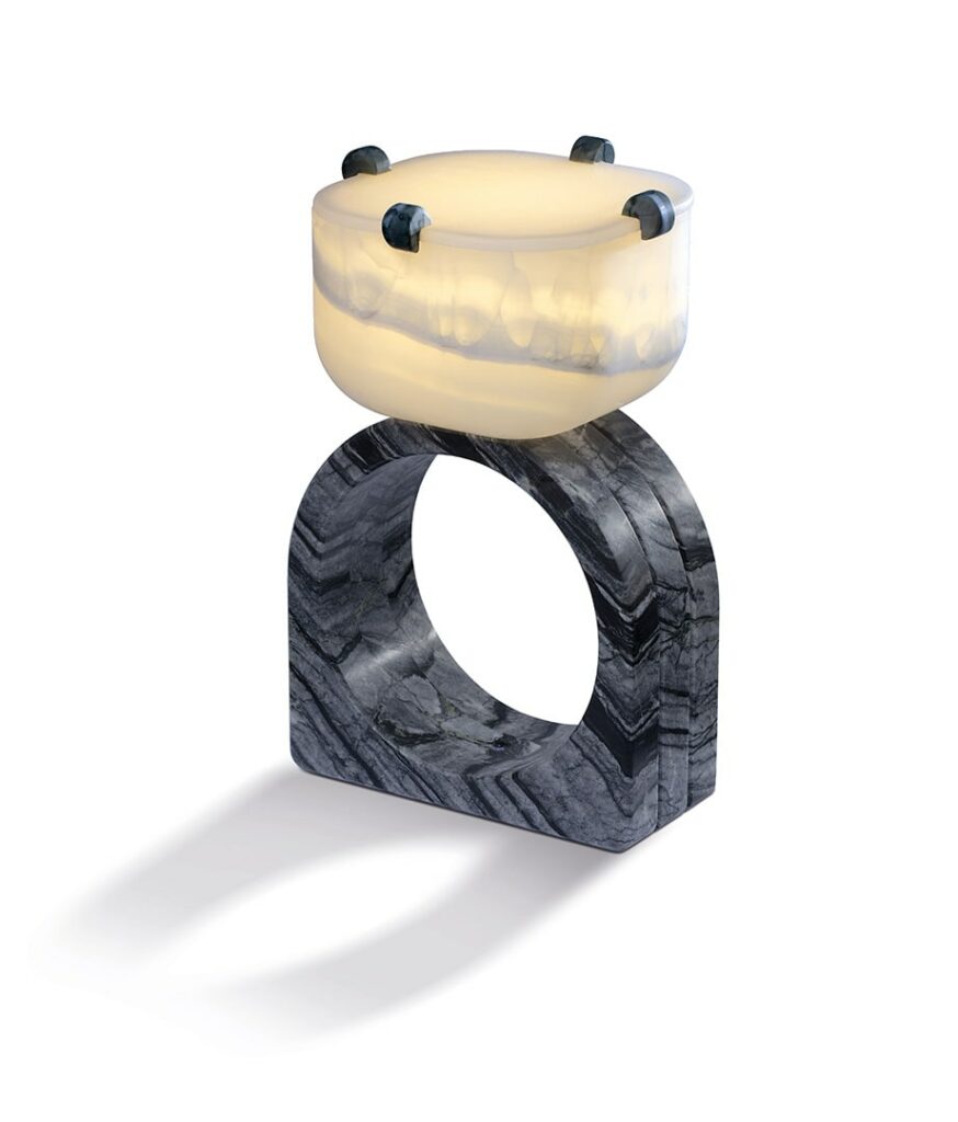 The lamp with dimmable light is not switched on by means of a standard switch but using a touch system. It is operated by a gesture that calls to mind the act of putting a ring; when the hand is placed inside the base of the ring the onyx gem illuminates creating a surprising and warm light.