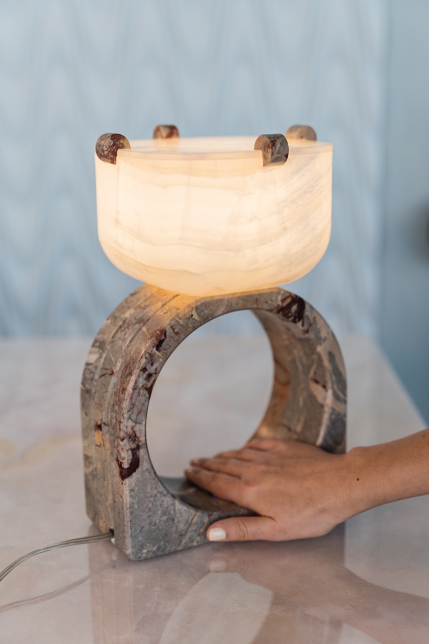 The lamp with dimmable light is not switched on by means of a standard switch but using a touch system. It is operated by a gesture that calls to mind the act of putting a ring; when the hand is placed inside the base of the ring the onyx gem illuminates creating a surprising and warm light.