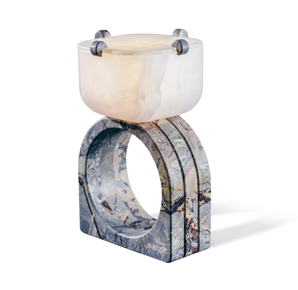Cristina CelestinoThe base of the “Alice” lamp is available in different types of marble: Blackwood, Sarrancolin Versailles, and Verde Antigua. The “gems” are all in onyx, in pastel shades.