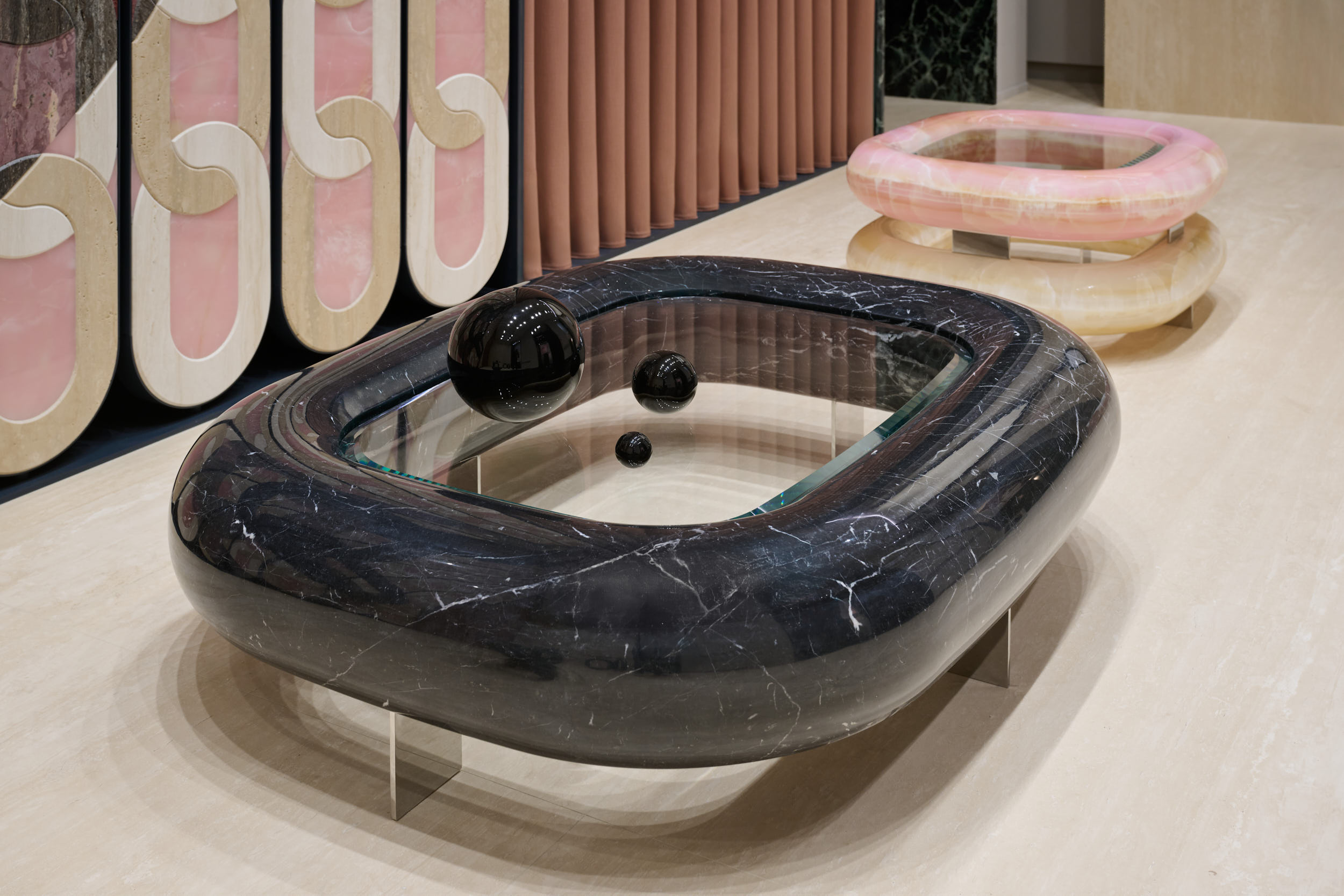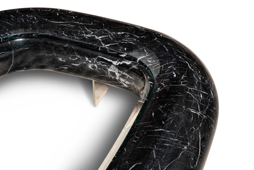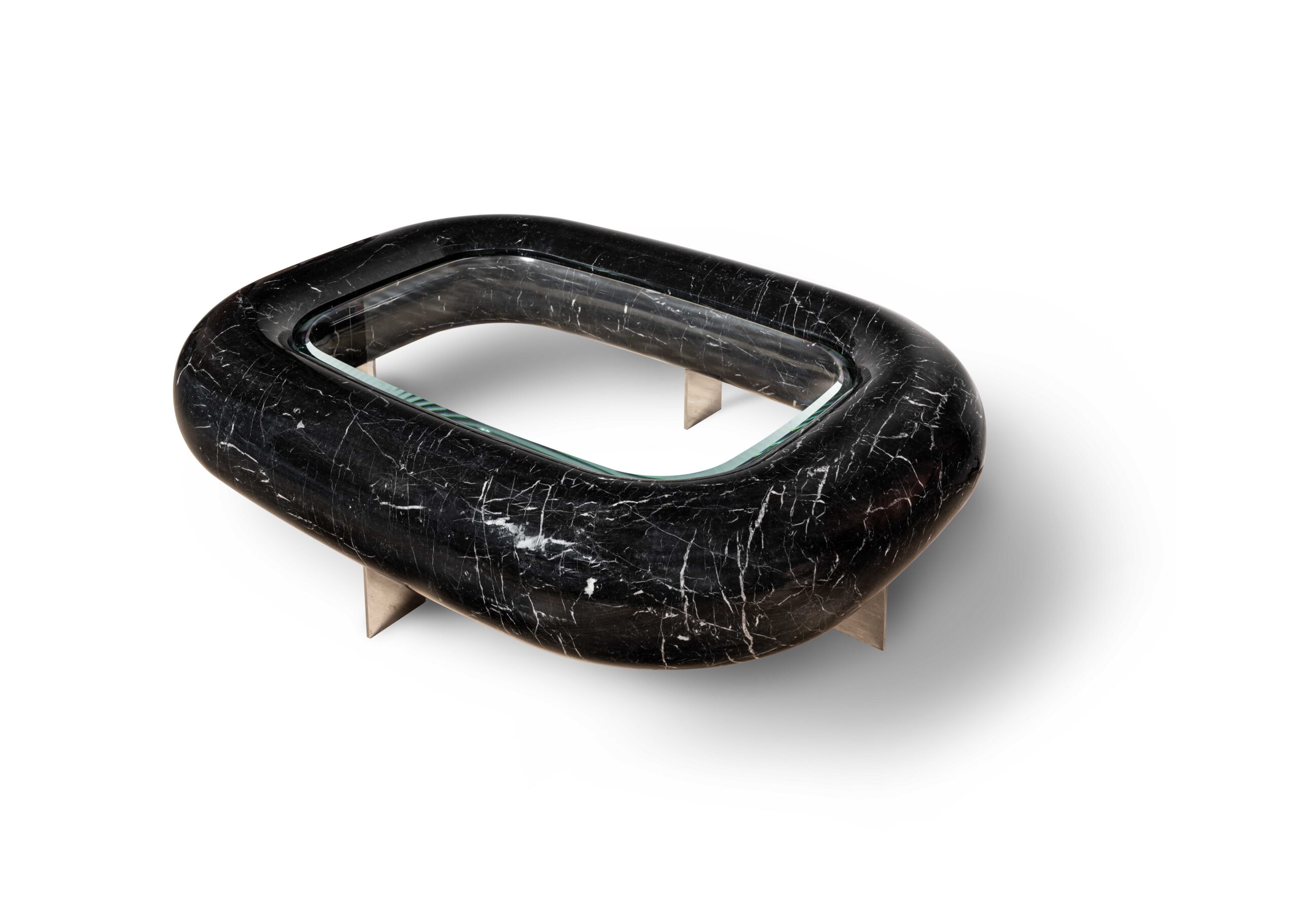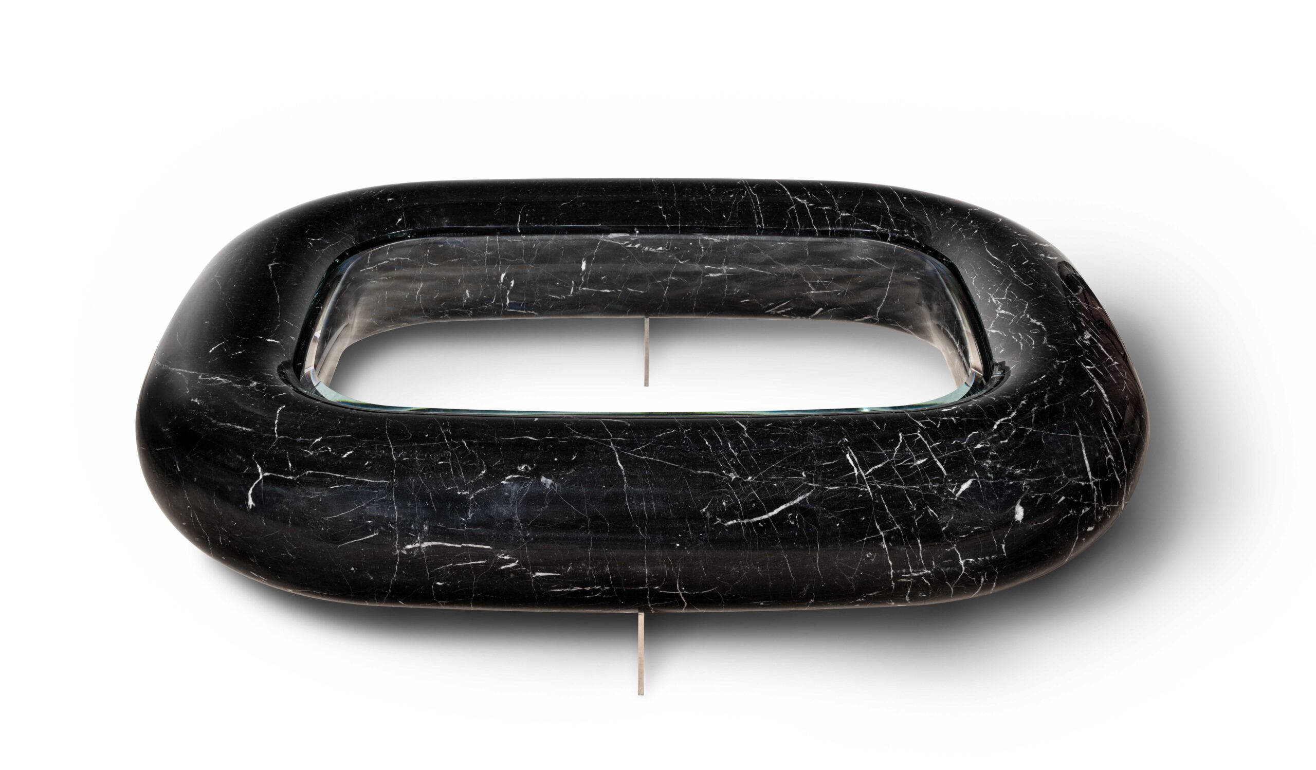 Eric Carlson – CarbondaleANNEAU Coffee Table, featuring a single ring shape, shares the same form as the Double Anneau and is carved from a solid block of Nero Marquina marble. The white veining stands out against the dark background, enhanced by an extra glossy finish. The extra-clear glass top reveals the large, painterly marble ring. The table’s base is made of curved, high-gloss metal.
