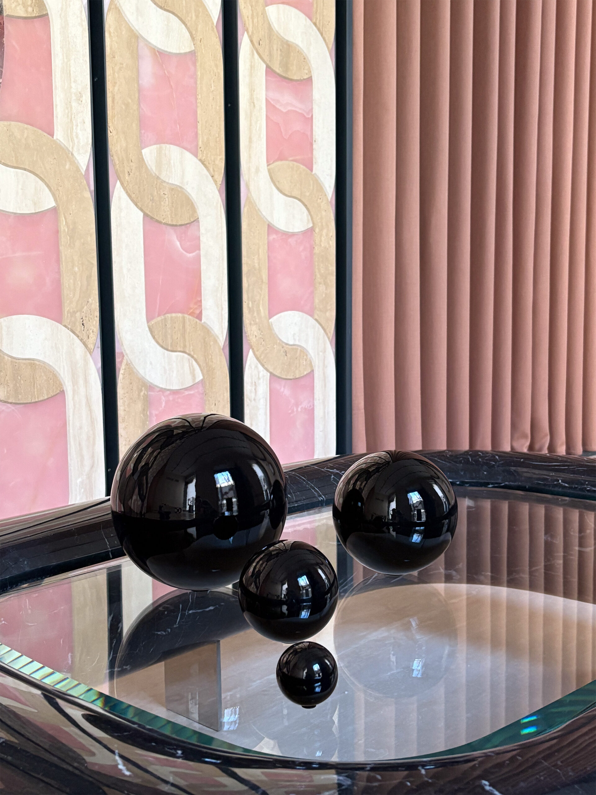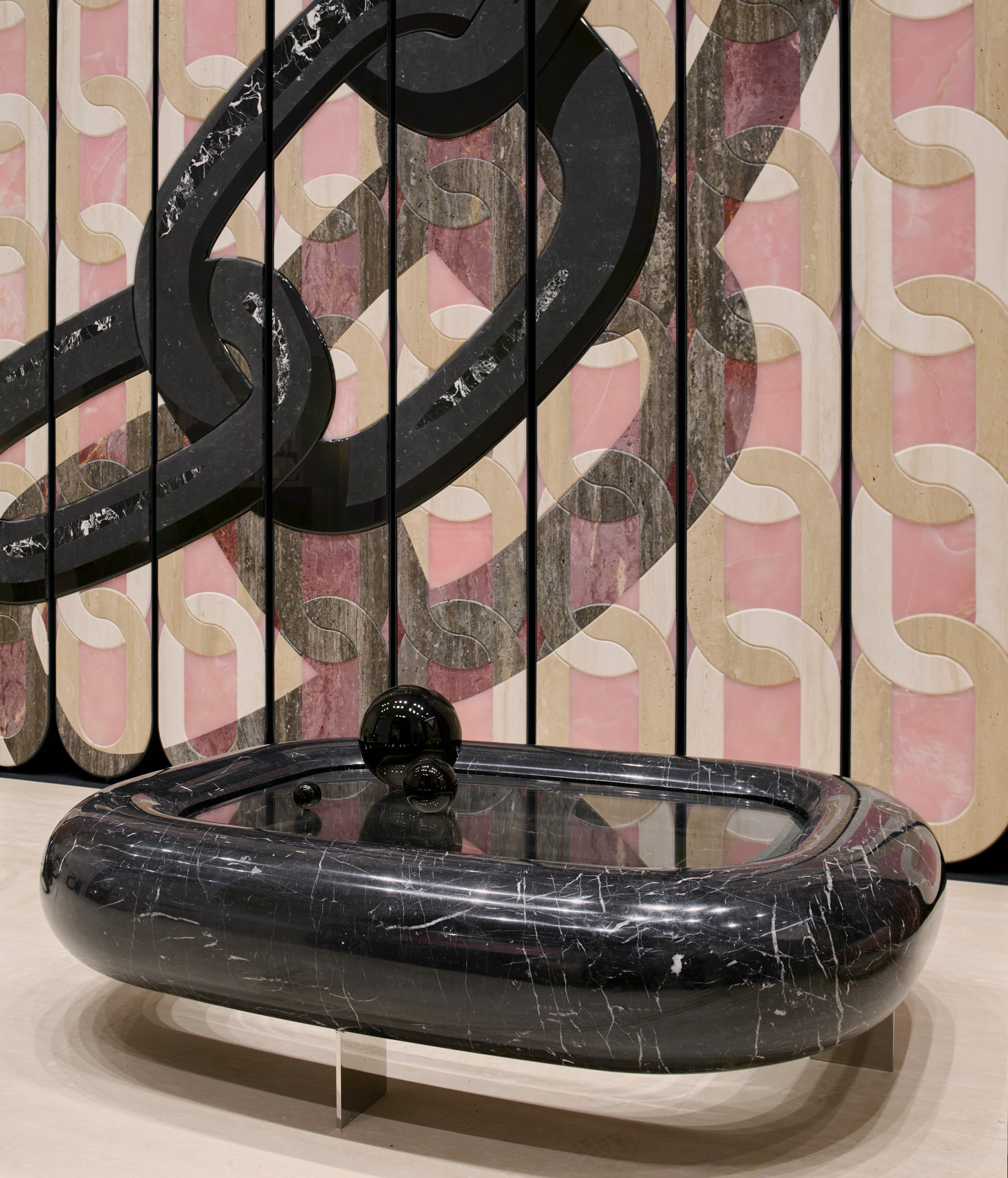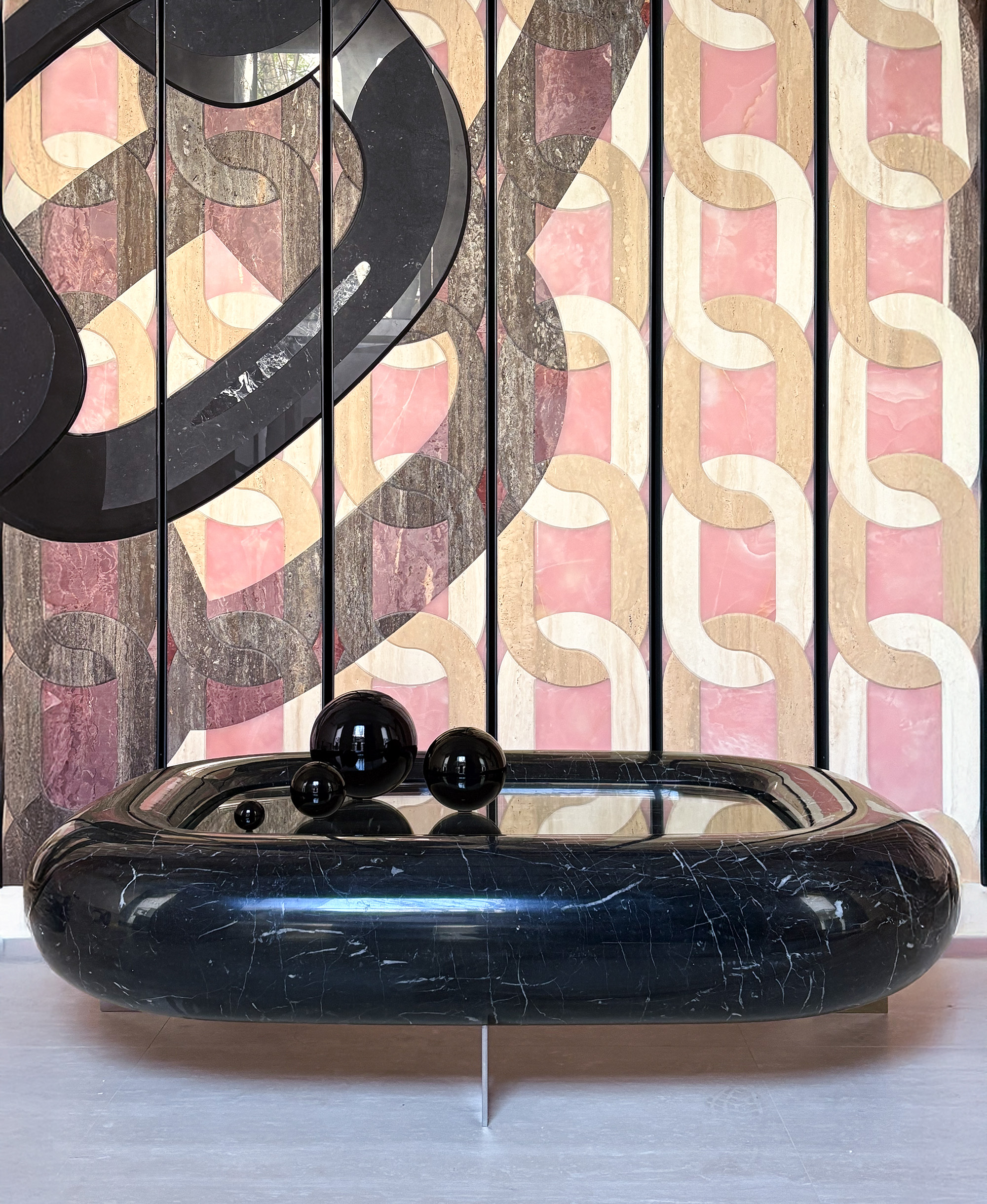 Eric Carlson – CarbondaleANNEAU Coffee Table, featuring a single ring shape, shares the same form as the Double Anneau and is carved from a solid block of Nero Marquina marble. The white veining stands out against the dark background, enhanced by an extra glossy finish. The extra-clear glass top reveals the large, painterly marble ring. The table’s base is made of curved, high-gloss metal.