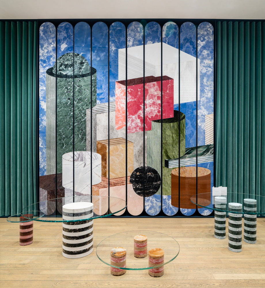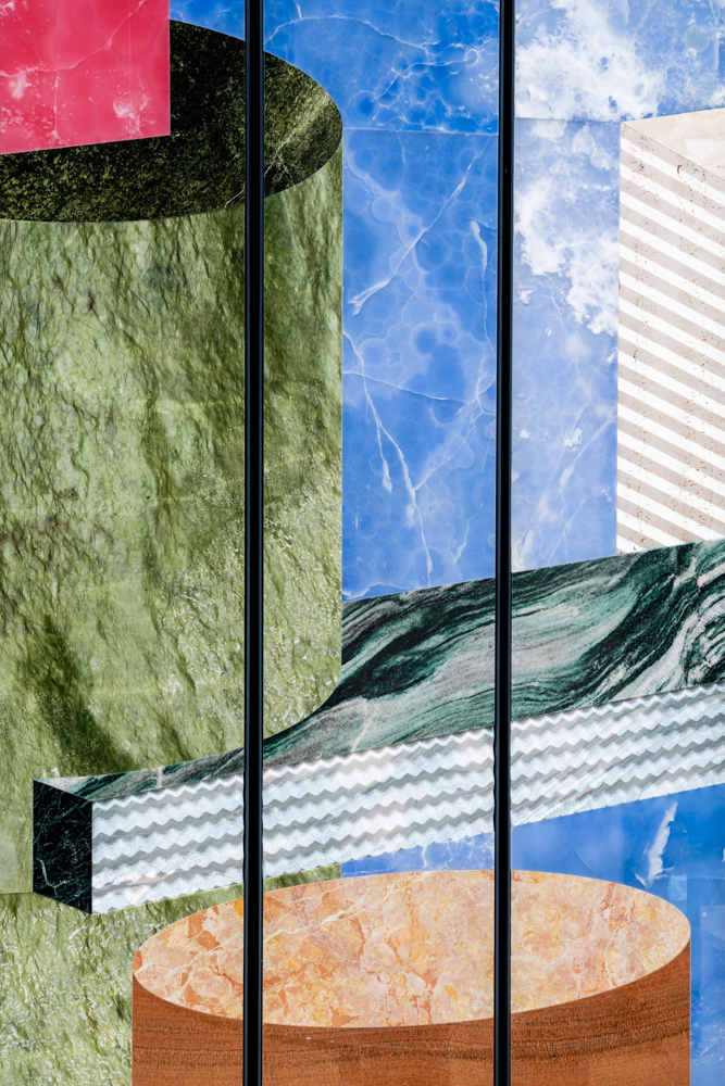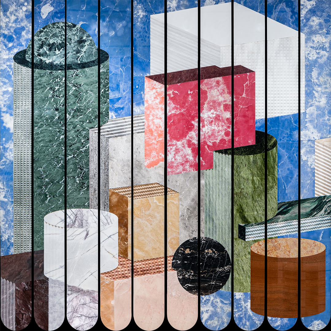 The artwork "Architexture" dialogues with the space, creating depth in a dimension composed of volumes of architecture. Cylinders, parallelepipeds and spheres create a imaginary that highlights colors in absolutely unique gradations and veins. The airy sky in Iranian Aquarel Onyx dominates the architecture of the imaginary city. To make the work even more unique, three different textures have been crafted: diamond, plissé and grooved, which create, thanks to the bas-relief effect, plays of depth; the three textures are inspired by Italian architecture, including the Palazzo dei Diamanti in Ferrara, thus contributing to the dialogue between matter and history.