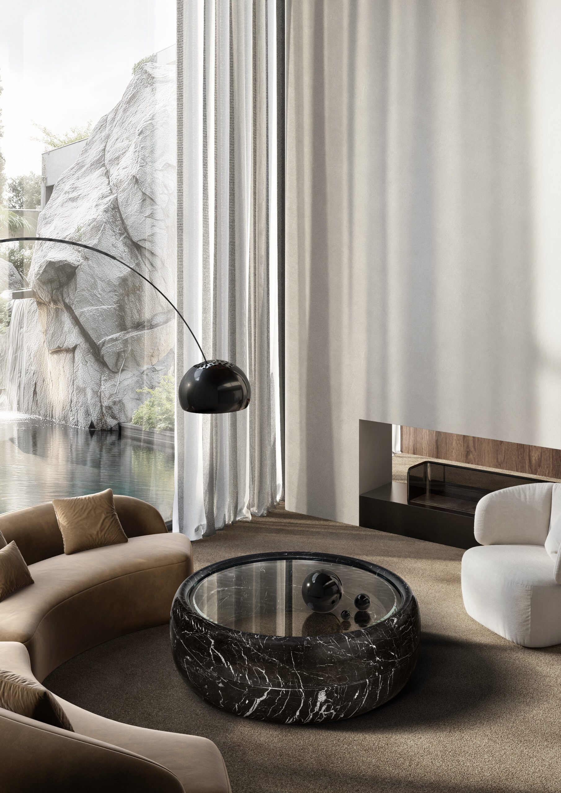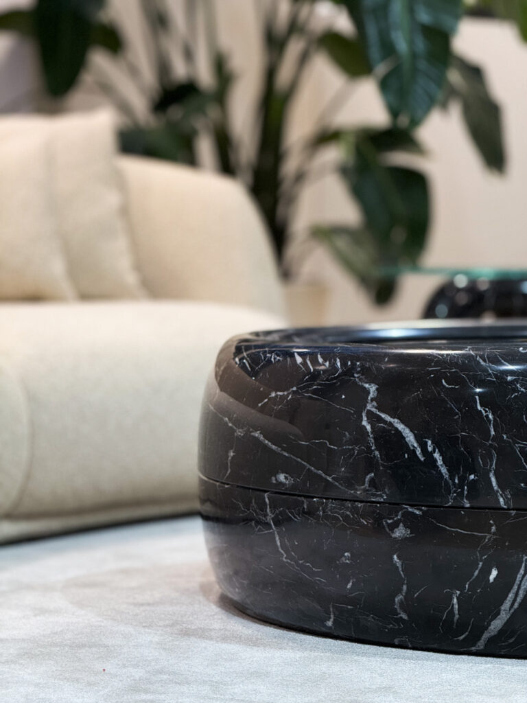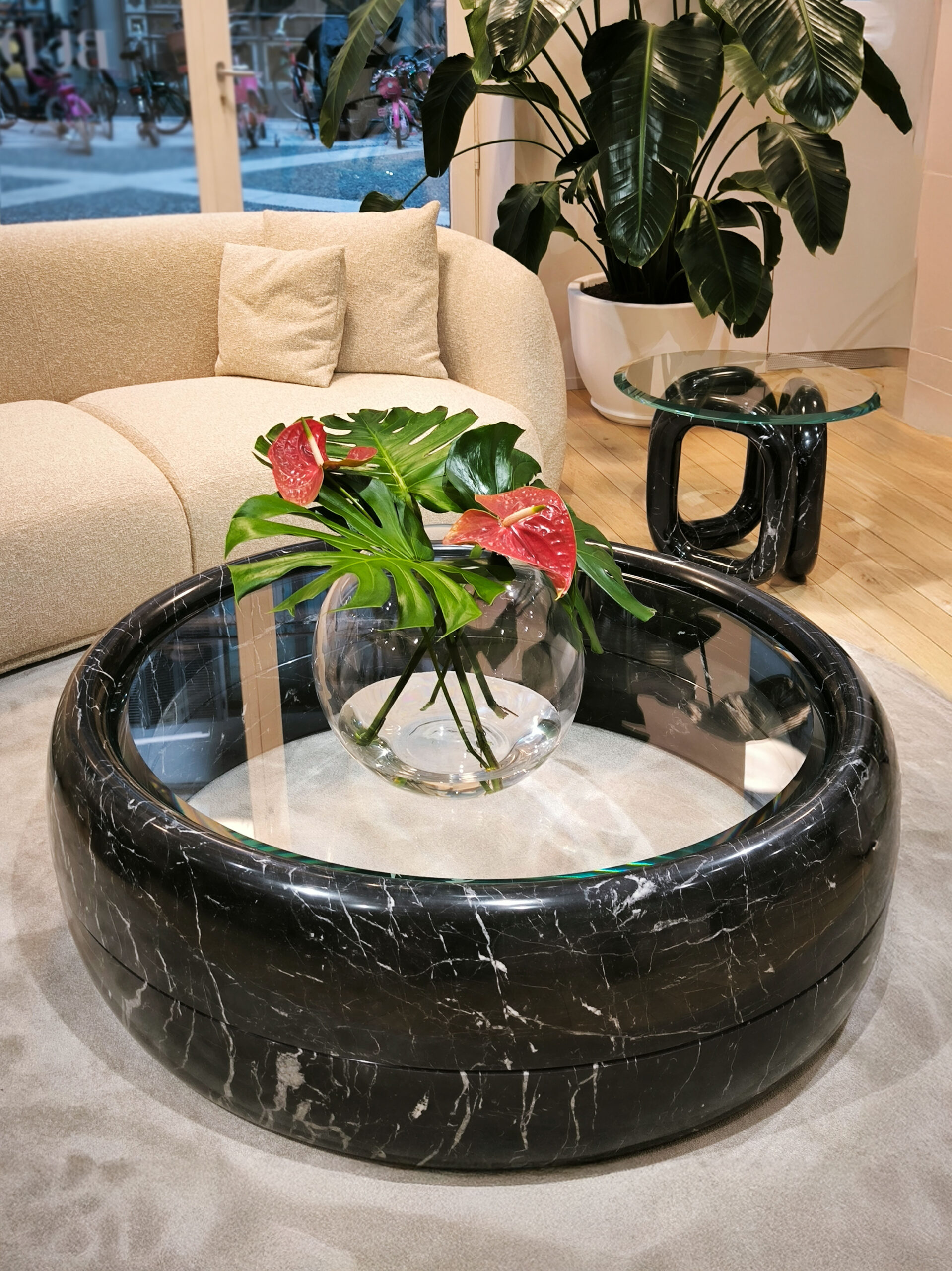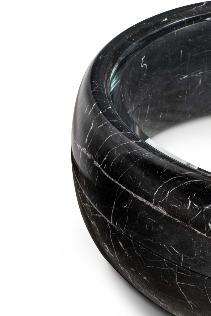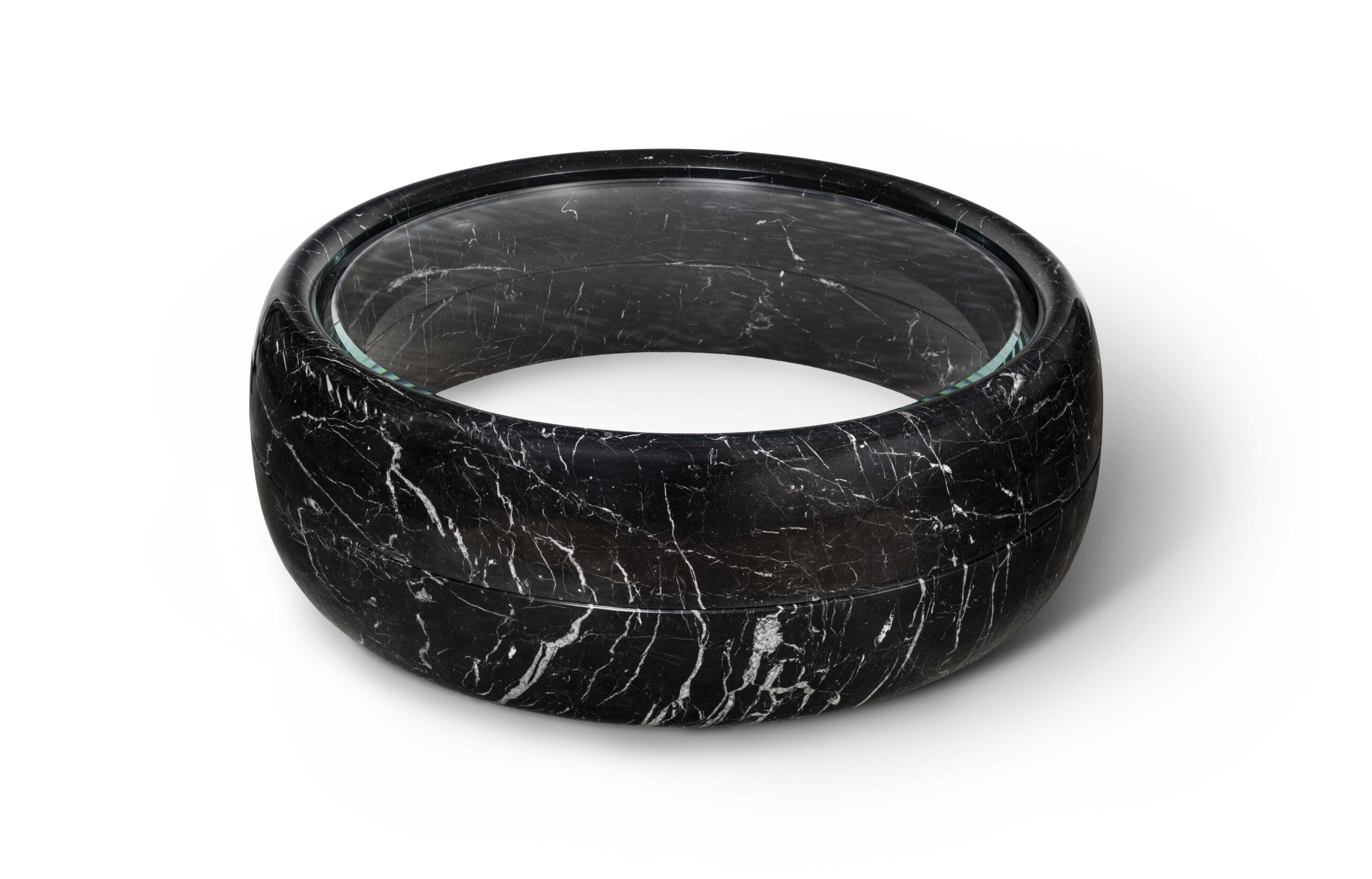 Eric Carlson – CarbondaleBAGUE Coffee & Side Table, inspired by rings and wedding bands with pure, soft shapes. Crafted from a solid block of Nero Marquina marble, later hollowed out, with an extra glossy finish. The pair, differing in size and height, represents the sculptural beauty of form. The extra-clear glass top on both versions highlights the piece’s painterly interior. BAGUE Coffee and Side Table are bold and contemporary jewels for the living area.