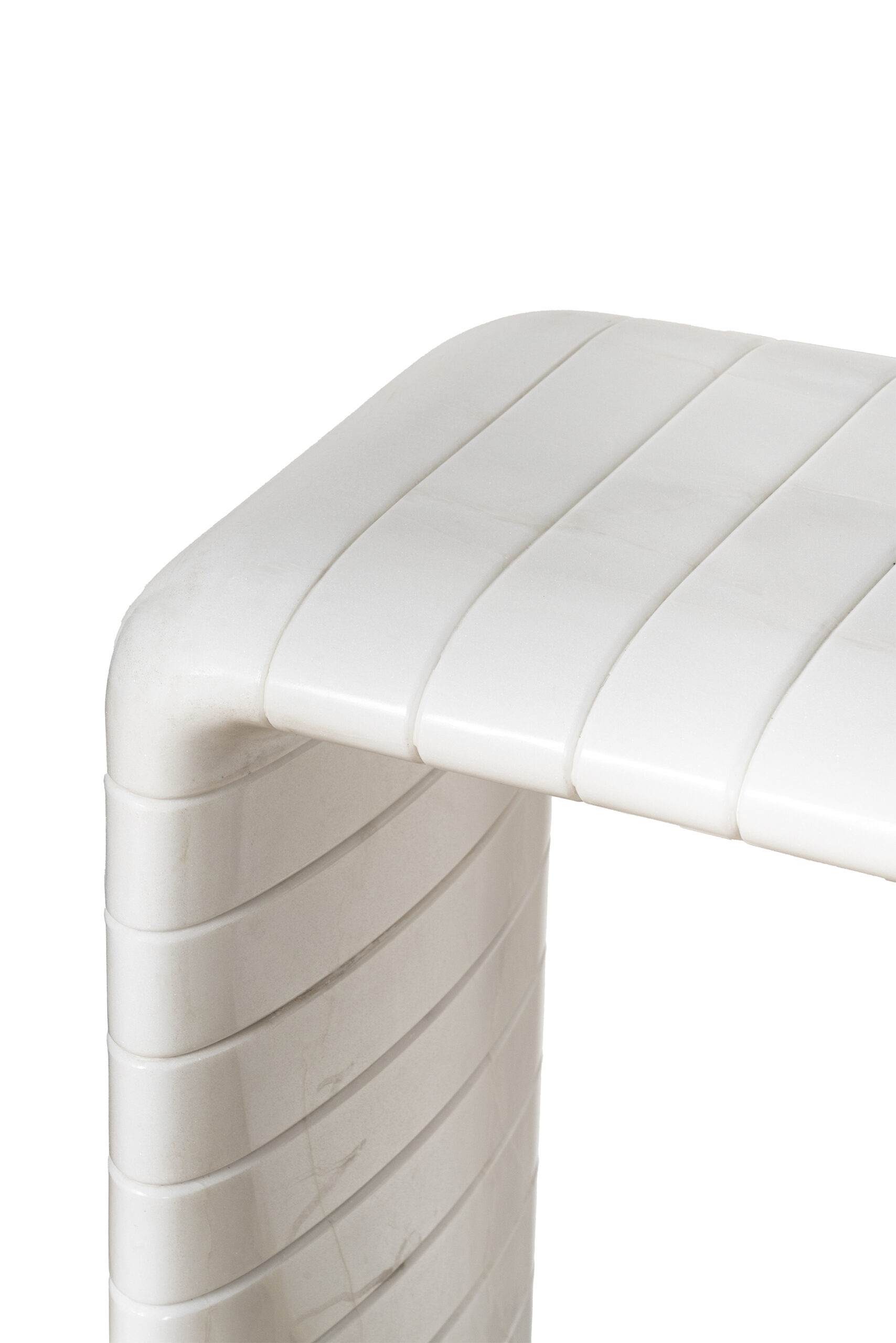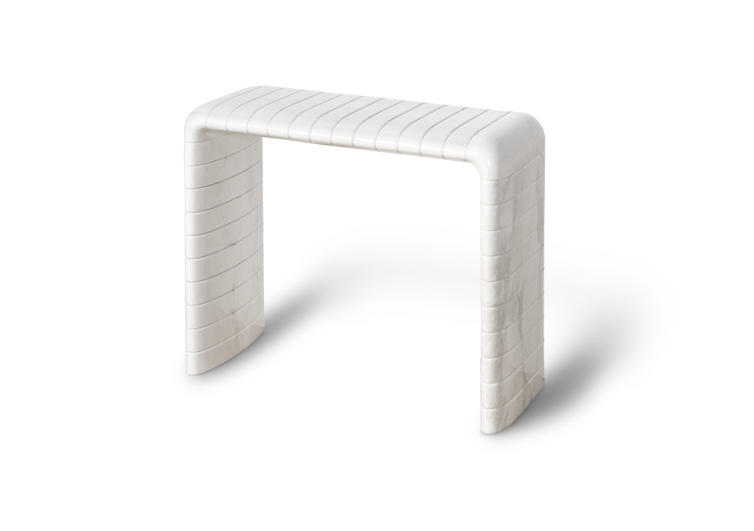 Eric Carlson – CarbondaleThe Bracelet consolle crafted in White Namibia marble draws inspiration in both shape and design from an iconic gold bracelet of high-end Italian jewelry from the 1970s—once a favorite of actress Liz Taylor. Like a band with rounded edges, the delicate and distinctive engravings form a signature pattern that flows seamlessly across the top and legs of the consolle, creating a cohesive and sculptural whole.