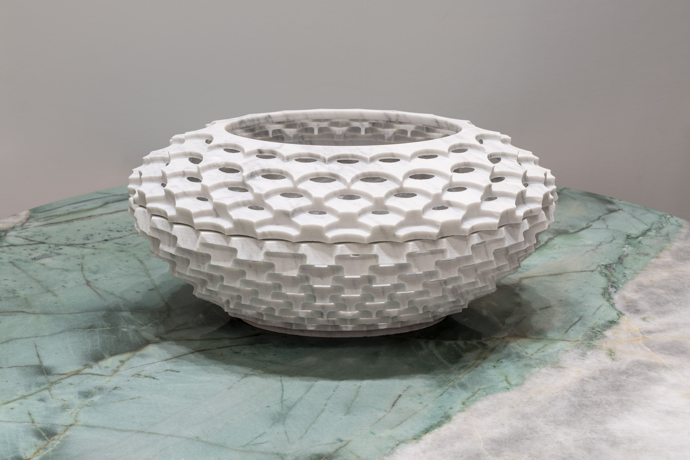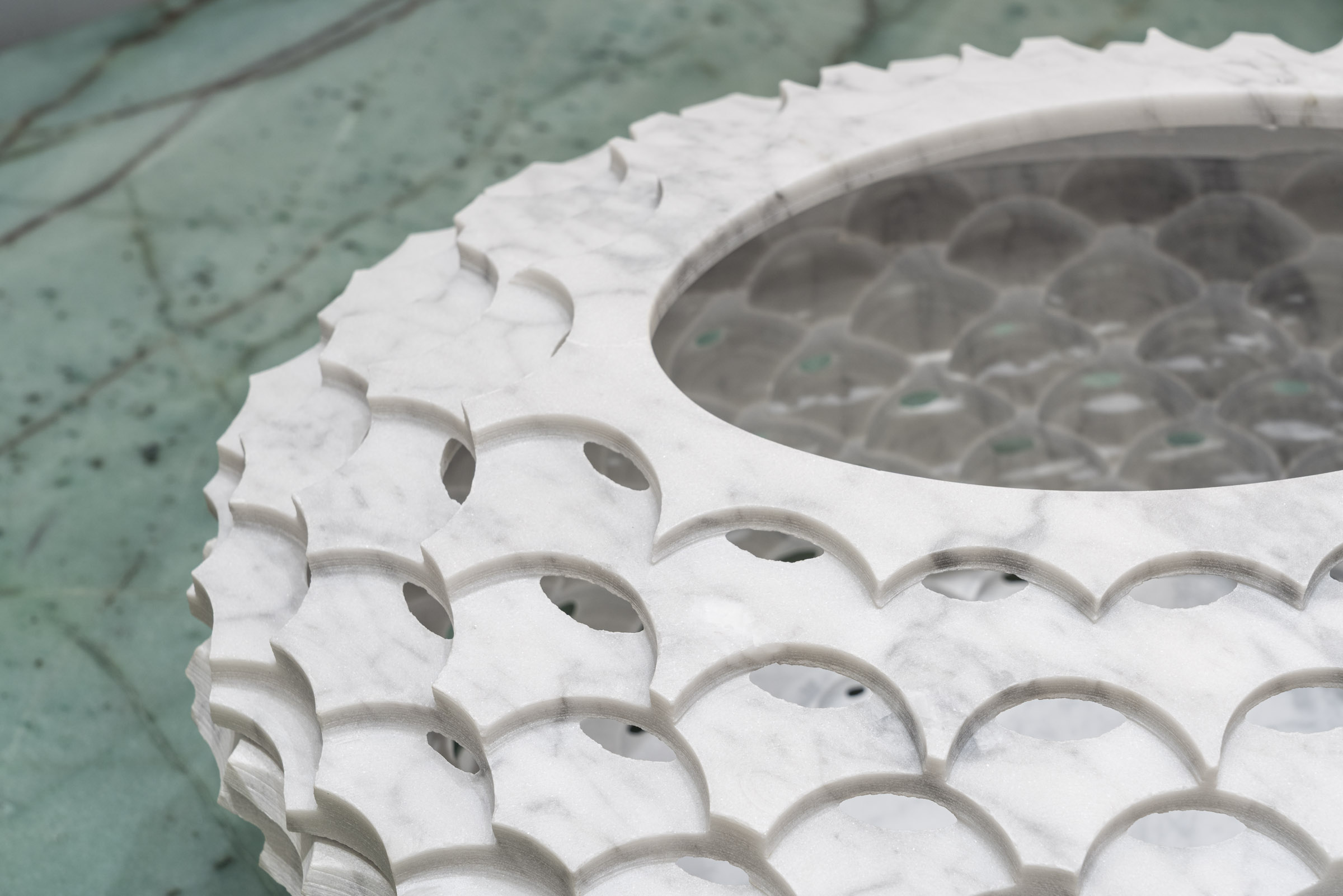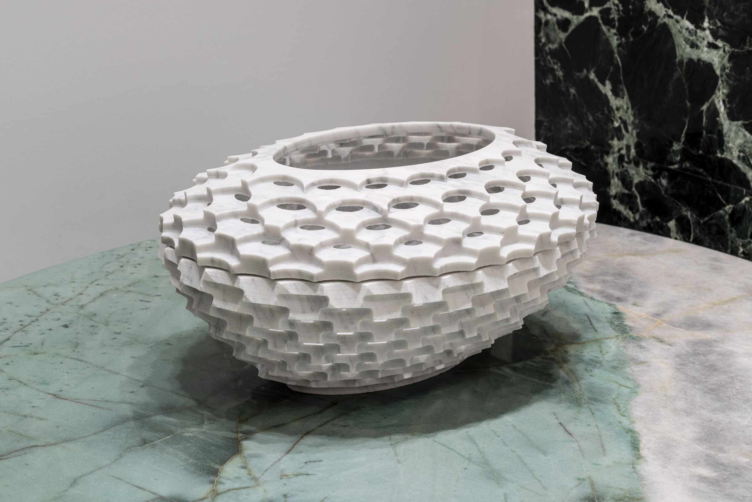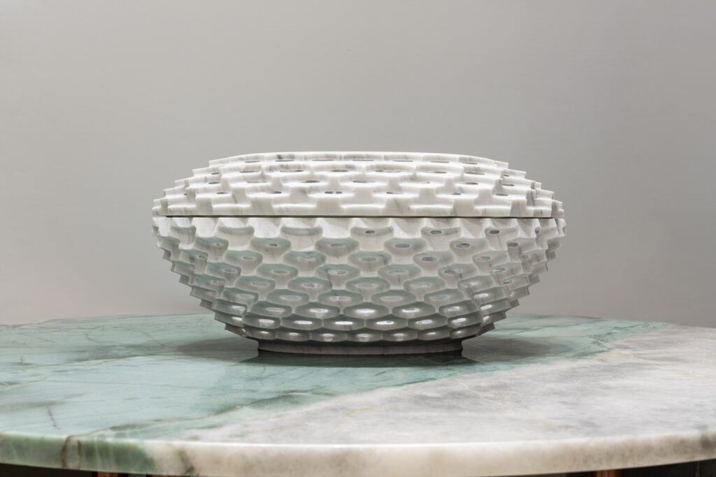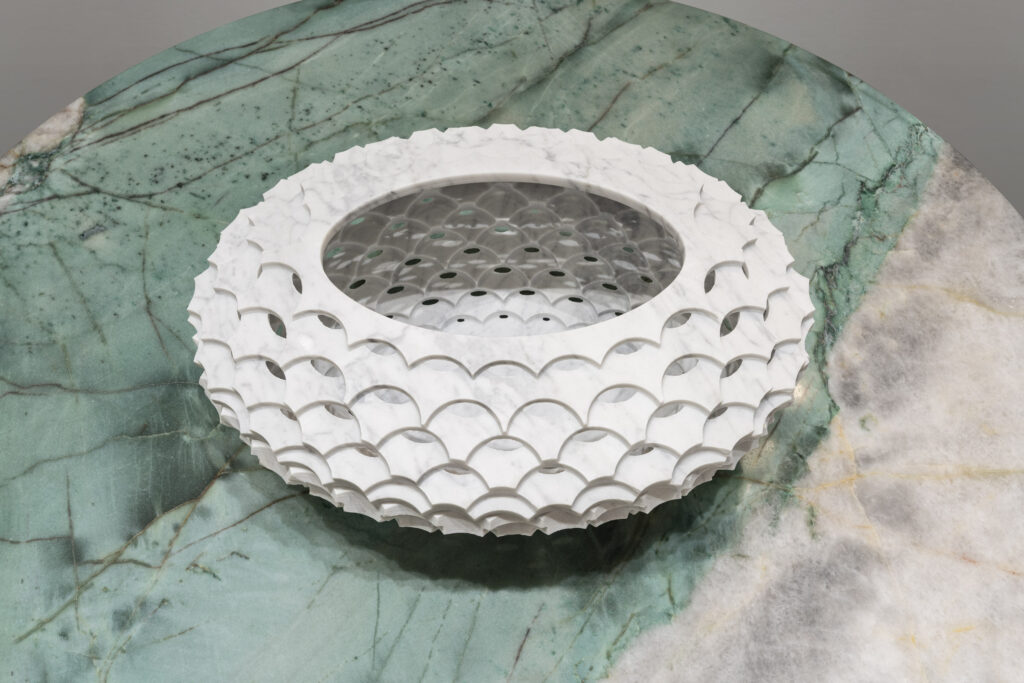 Raffaello GaliottoCanestro interprets the theme of interwoven forms through surfaces that gently open and wrap around one another. Within the Sublimis Tabula collection, it presents itself as a luminous and harmonious volume. Bianco Carrara, iconic and pure, lends a timeless elegance to the piece. Its soft veining accompanies the geometry with understated refinement. The Emerald Quarzite table introduces a deep, radiant green that provides a natural yet luxurious contrast. The pairing conveys freshness, balance, and modernity. Canestro emerges as an essential object enriched by subtle craftsmanship.