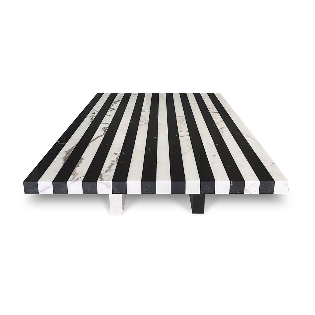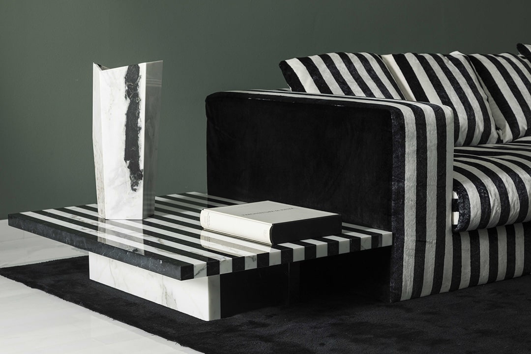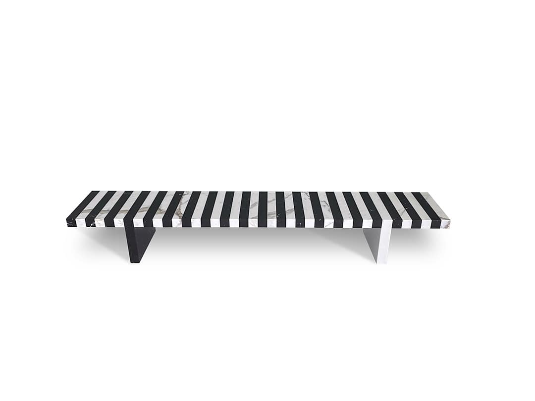 Gwenael NicolasContinuus side table, in Nero Marquina and Bianco Statuarietto, features a stark geometric design with a symmetrical pattern of black and white stripes. Resting on legs in Bianco Statuarietto, the coffee tables and the bench, in this instance, propose graphic continuity with the striped velvet of the sofa. An original game of camouflage between fabric and stone, highlighting the lightness of the latter.