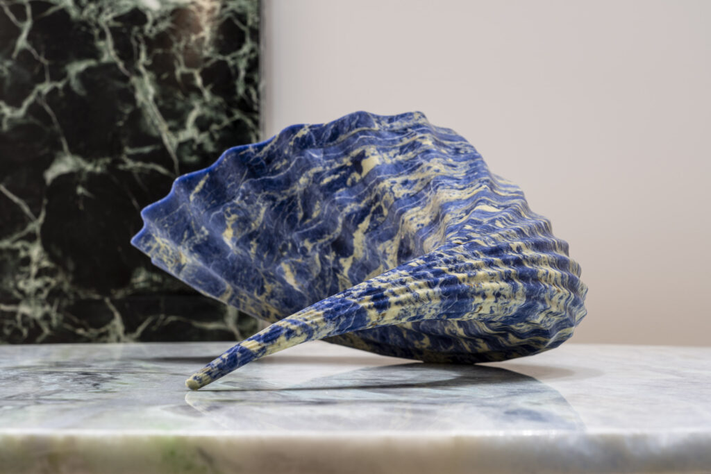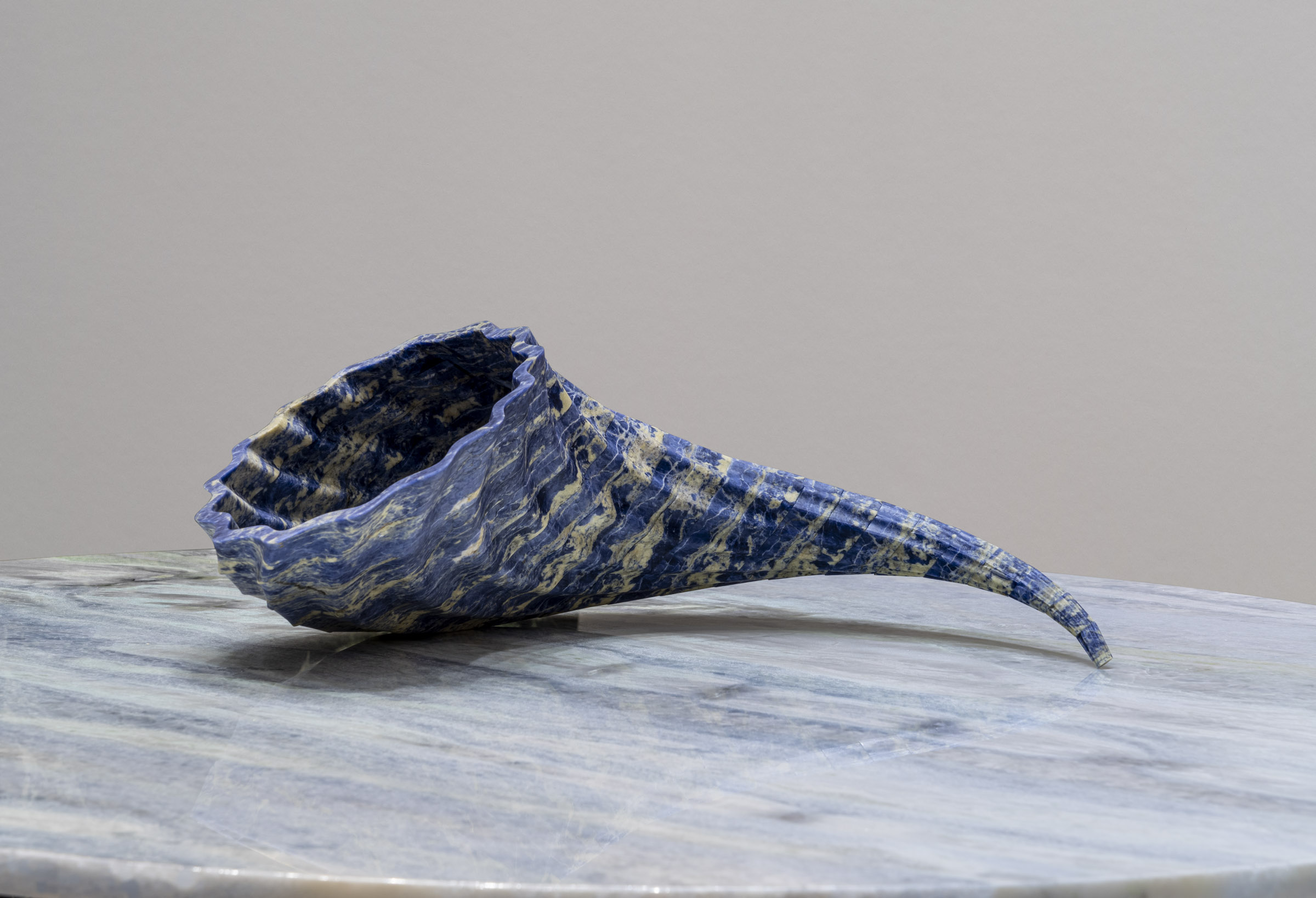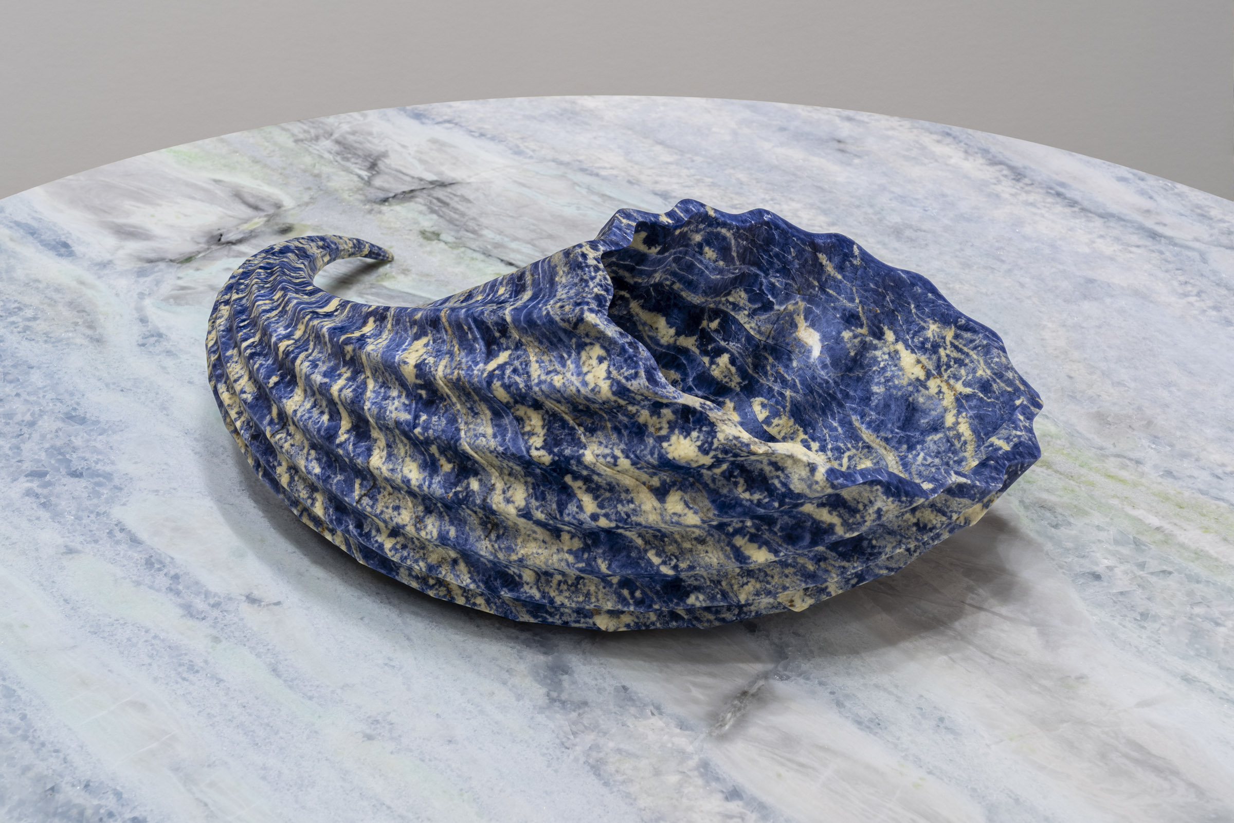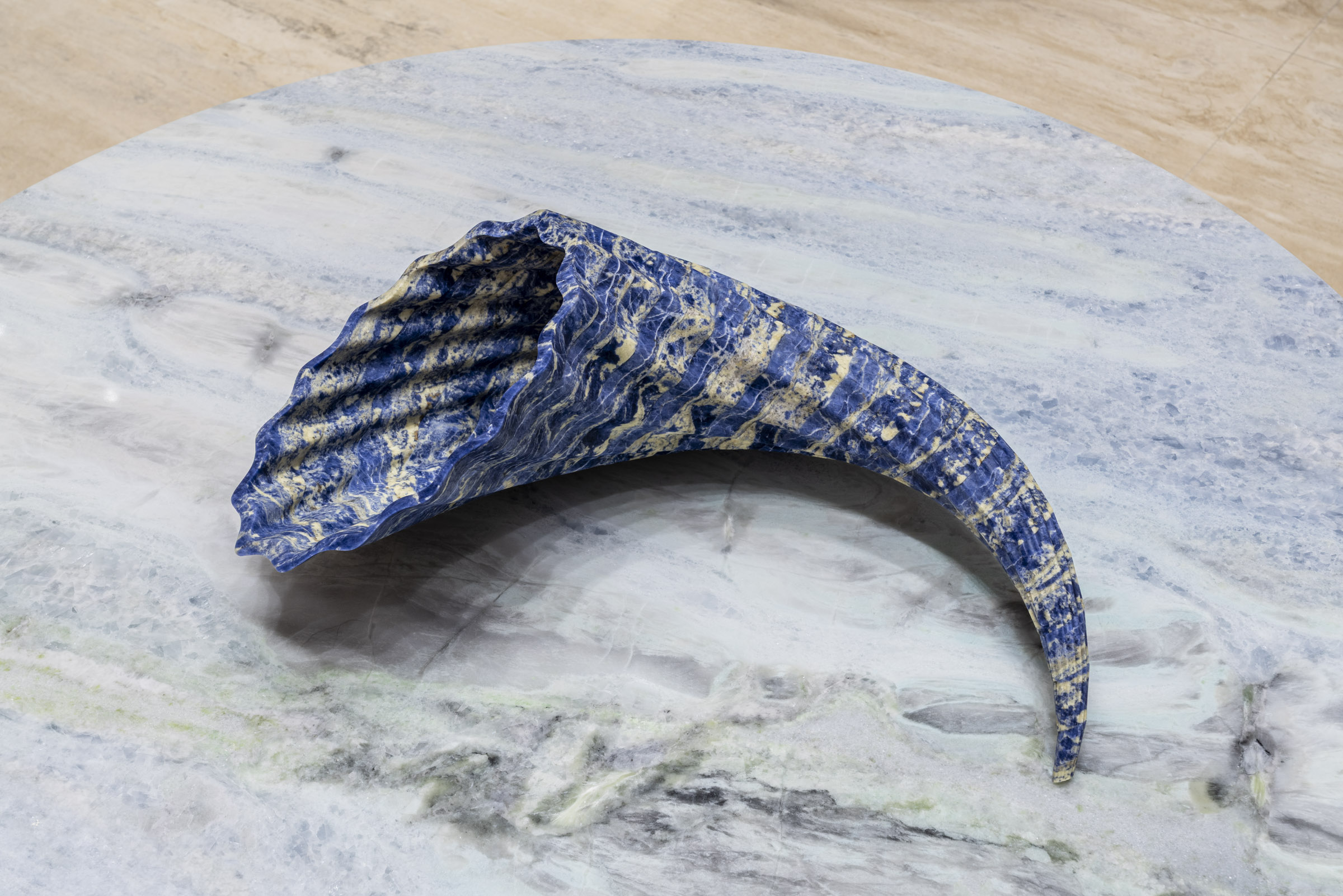 Cornucopia reinterprets the traditional cornucopia theme in a contemporary key, evoking a gesture of abundance and openness. Its soft lines reinforce the concept of the center as a point of balance, in harmony with the philosophy of Sublimis Tabula. Sodalite, with its deep blue crossed by white veins, gives the piece a noble, almost celestial presence. The sculpted cavities reveal striking inner reflections and light dynamics. The Azul Cielo table, lighter and more delicate, creates tonal harmony that enhances the depth of the blue. The result is poetic, sophisticated, and visually captivating. Cornucopia stands as an iconic piece within the collection.