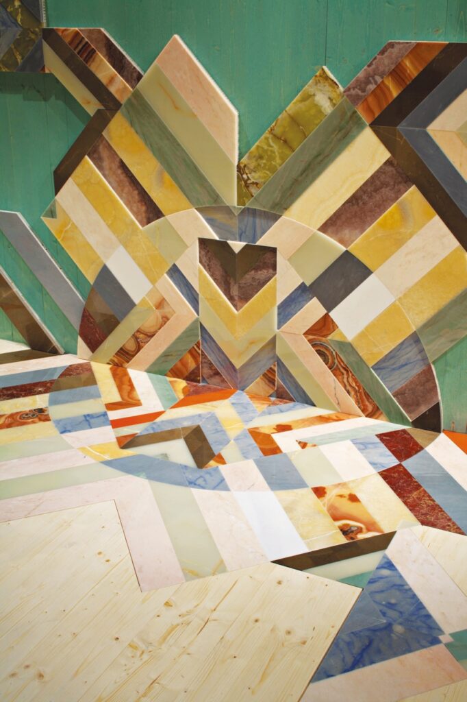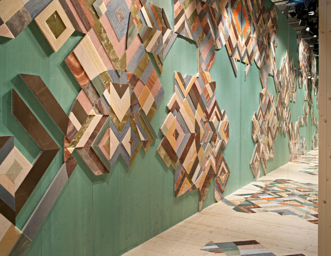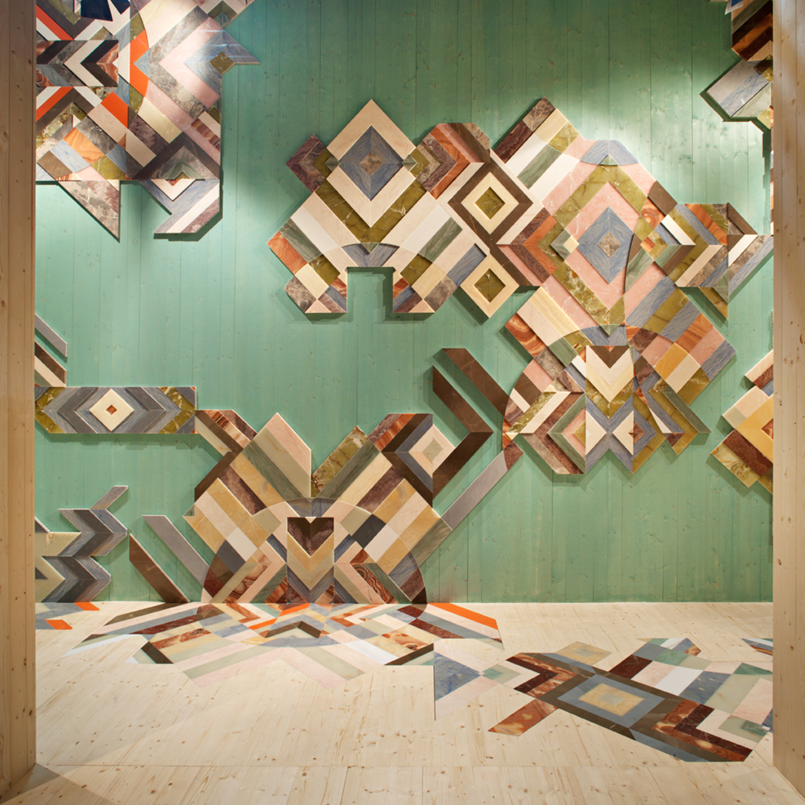 The large lenticular-effect decoration covers the wall in alternating fields while part of the inlay slips to the ground like a "kilim" rug.