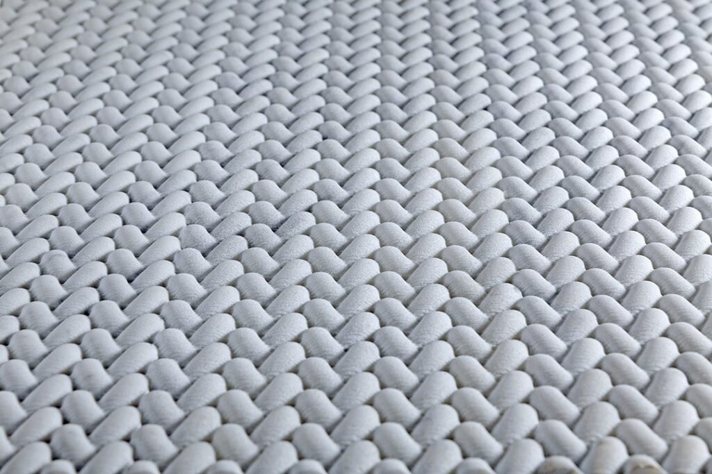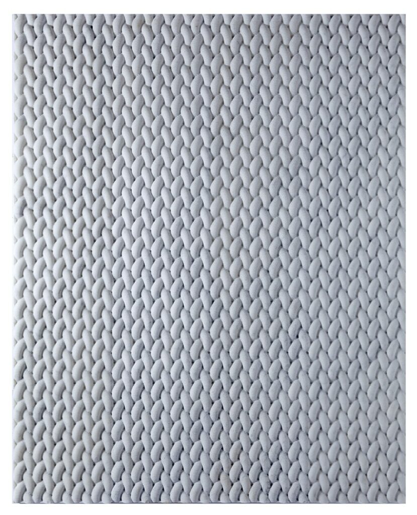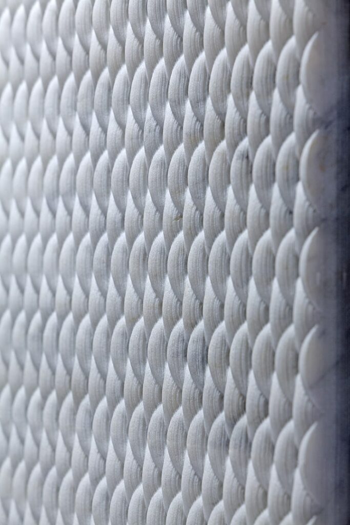 Patricia UrquiolaTricot "Knit" is a modular bas-relief boiserie of Bianco Carrara marble (Bianco Lasa, Striato Olimpico). Colours are delicate and the weave resembles knitted wool: a mutant spirit that turns the stones’ hardness into an idea of softness and warmth.