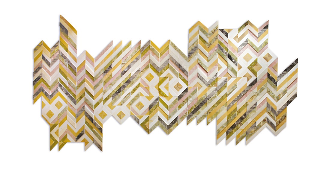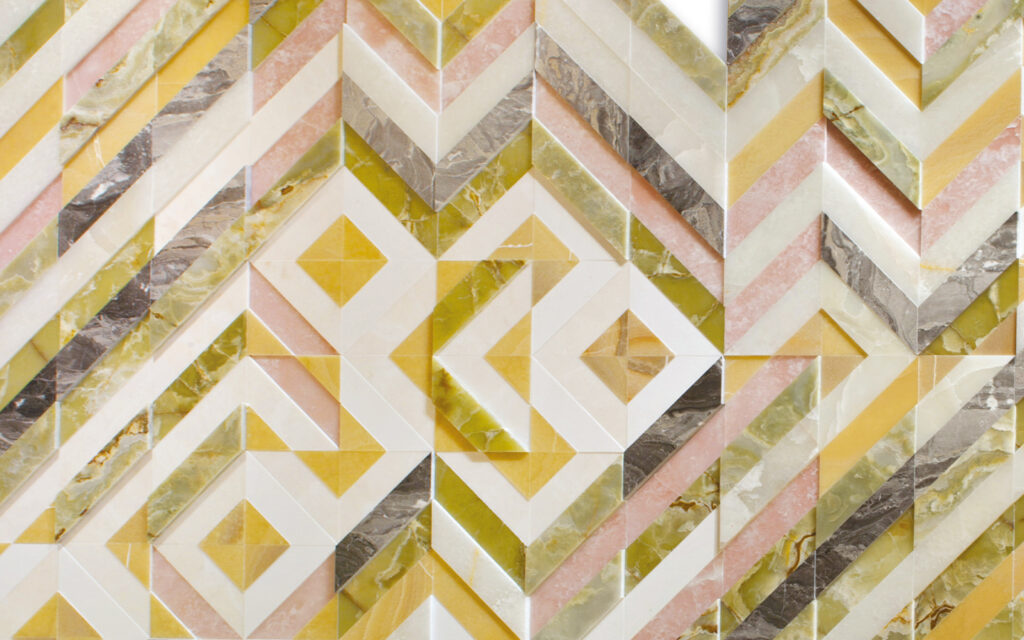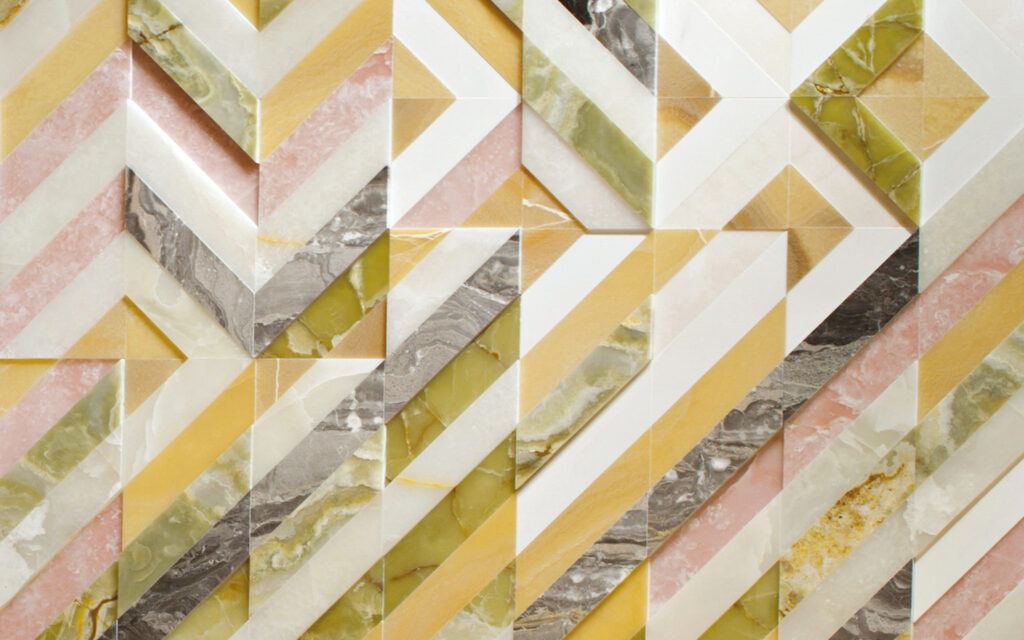 Patricia UrquiolaModular and compoundable artistic inlay with a 3D effect, characterized by a geometric graphic fishbone. Made of precious marbles and onyxes such as Onice Pink, Onice Bianco, Onice Nuvolato, Onice Pakistan, Grigio Orobico and Bianco Lasa.