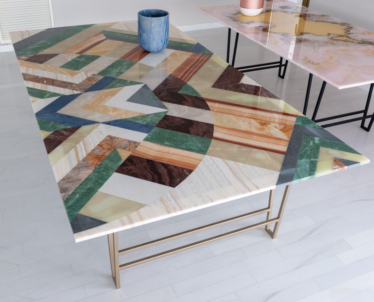 Patricia UrquiolaLarge table whose preciousness is enhanced by a geometric pattern with a lens effect, juxtaposing precious marbles and onyx to cream-coloured resins. The table top leans onto iron aquamarine green coated legs.