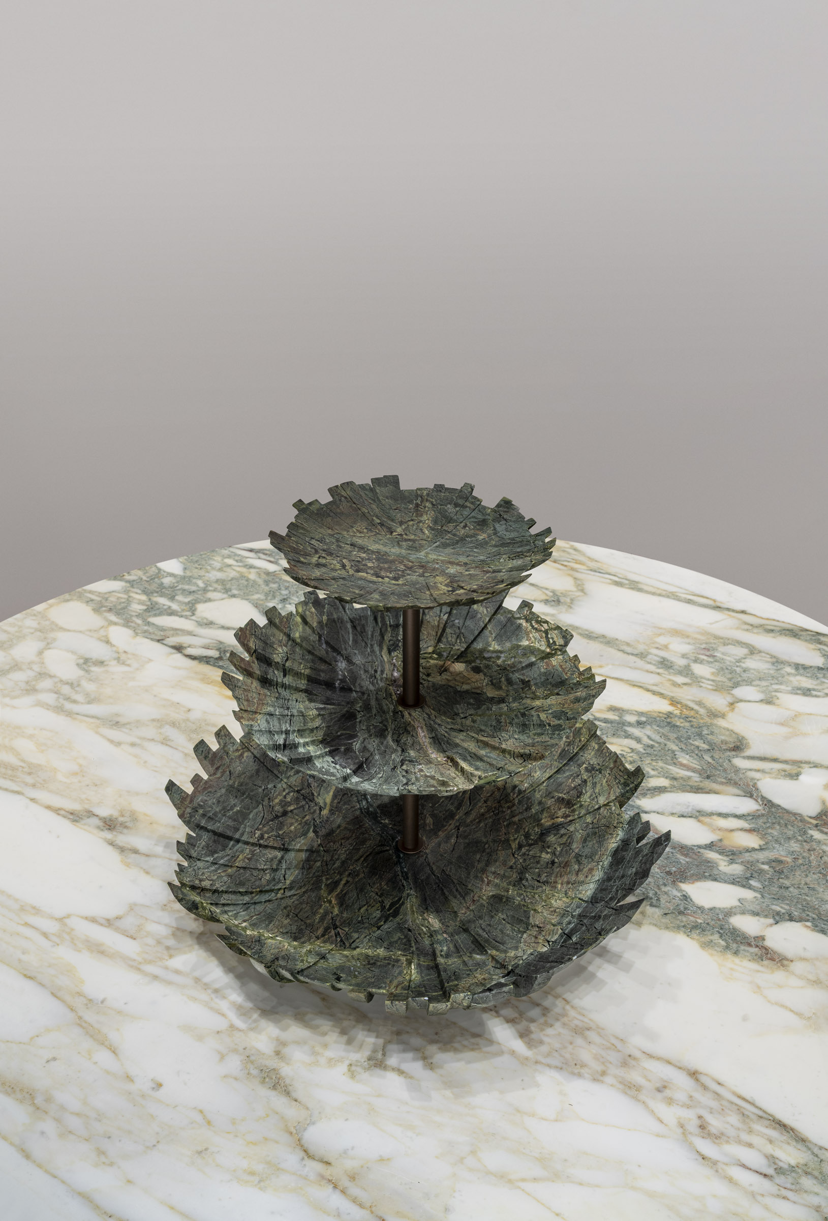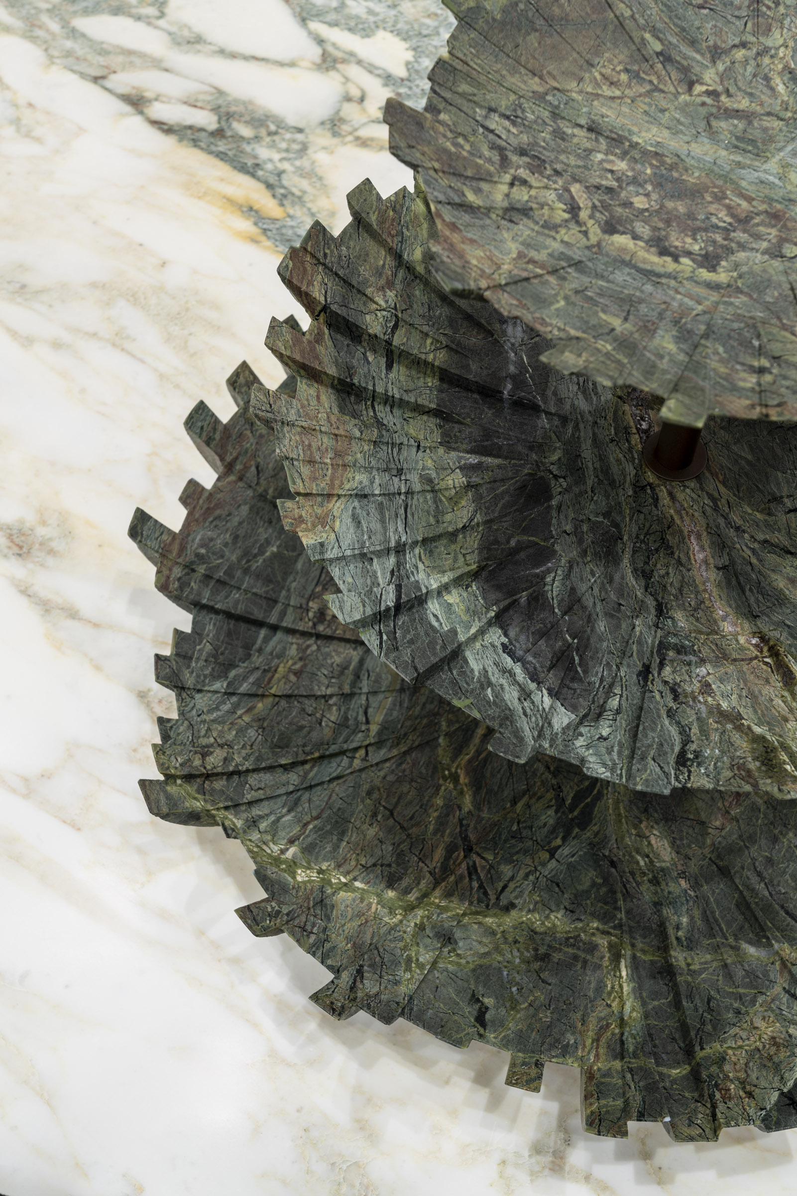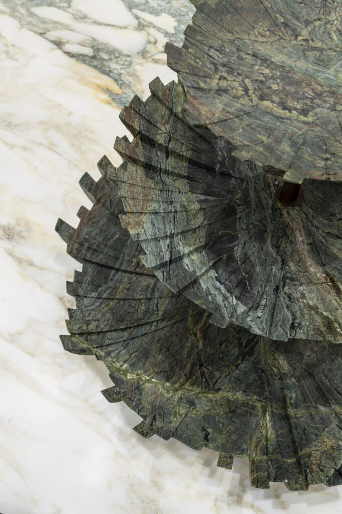 Raffaello GaliottoEquiseto recalls delicate, rhythmic natural structures, transforming stone into a piece with a poetic, measured cadence. Its form follows a harmonious motion aligned with Sublimis Tabula, blending technology with material sensitivity. Verde Borgogna, deep and velvety, gives the piece a refined and mysterious atmosphere. Lighter veins accentuate the sculpted surfaces, adding dynamism. The Calacatta Antico table, bright and crossed by golden lines, introduces an elegant contrast. The final composition is balanced, tactile, and layered. Equiseto becomes a contemplative and precious object.