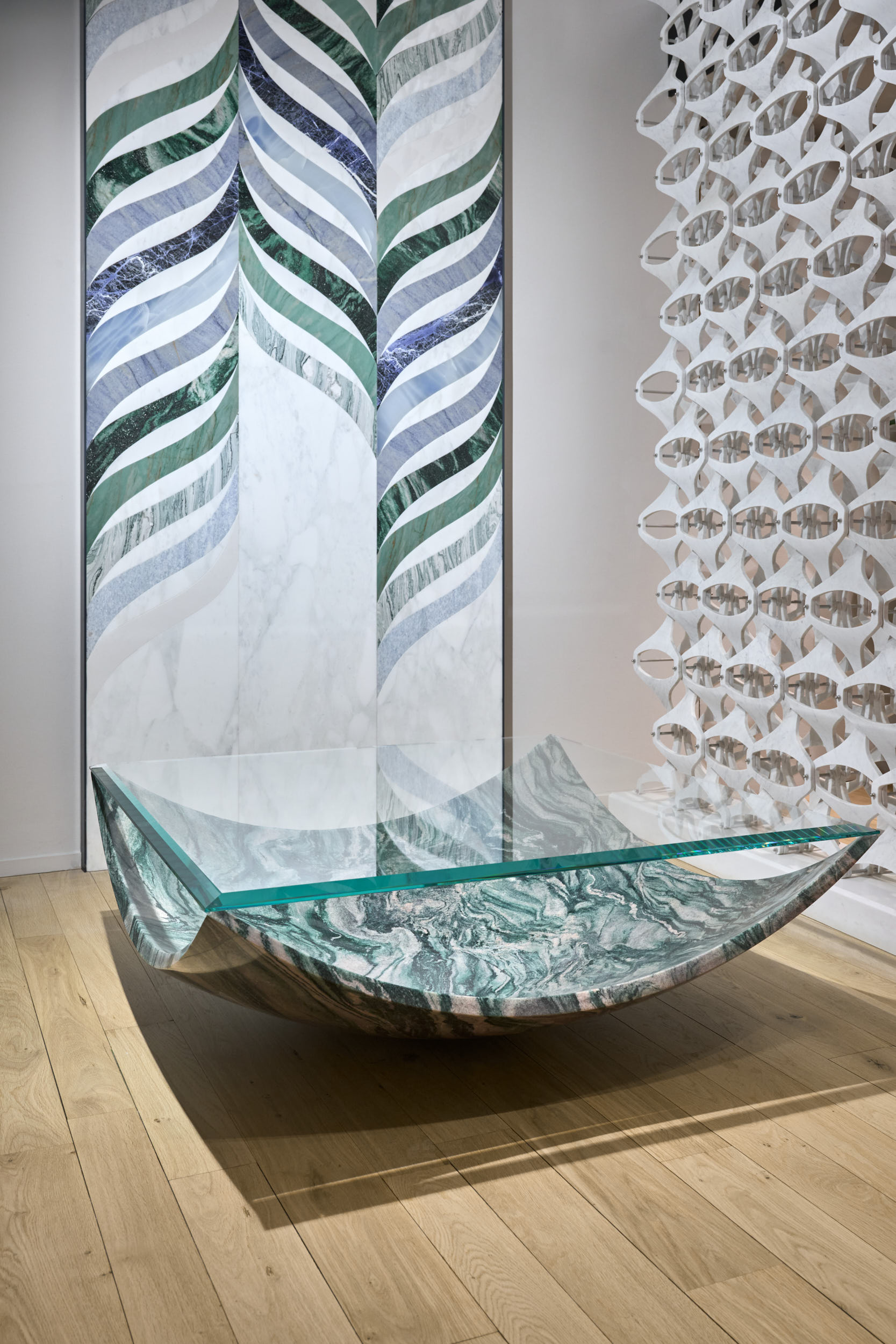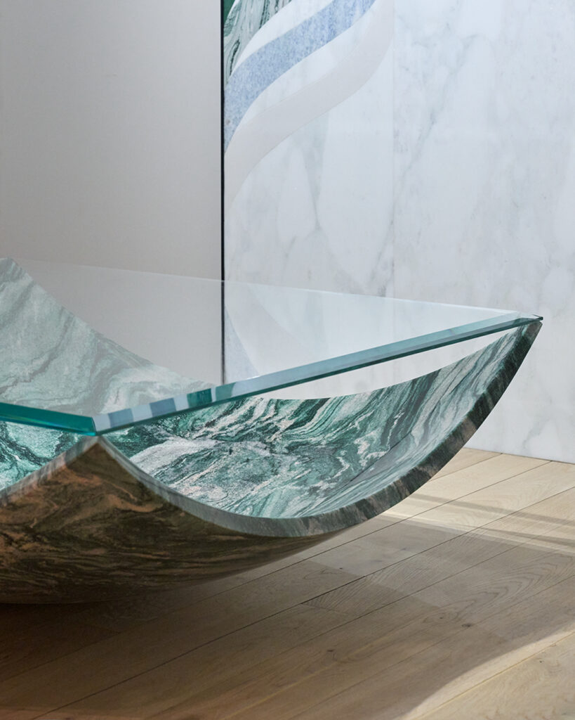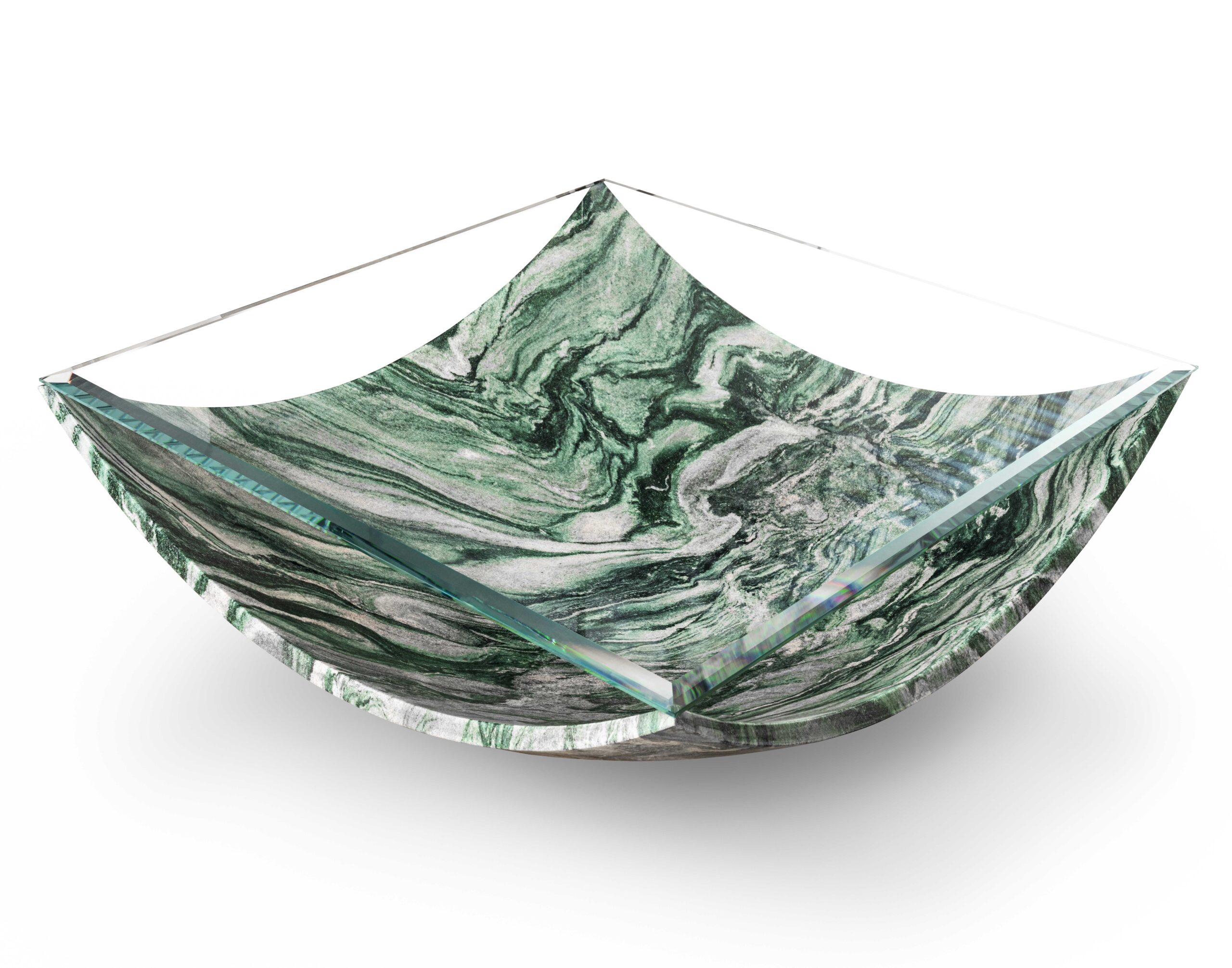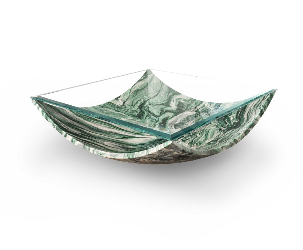 CharmeCoffee Table crafted from an impressive solid block of Verde Lapponia, a marble with incredible veining that fades from pale green to emerald. Inspired by the gesture of a magician lifting the veil to reveal the surprise beneath, its shape is square yet defined by a flowing, curved movement. Light and seemingly suspended, the extra-clear glass top fully showcases the beauty of the stone.