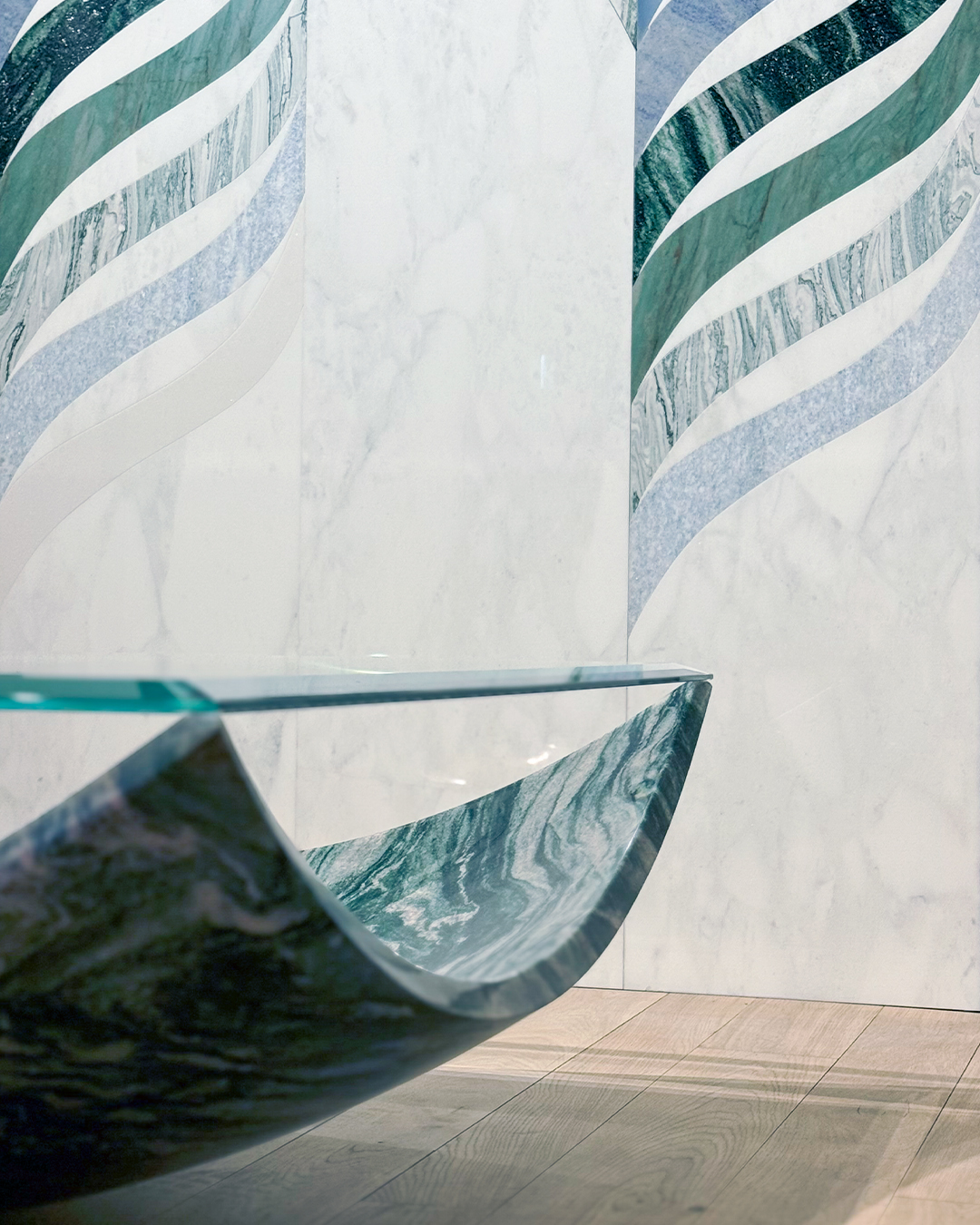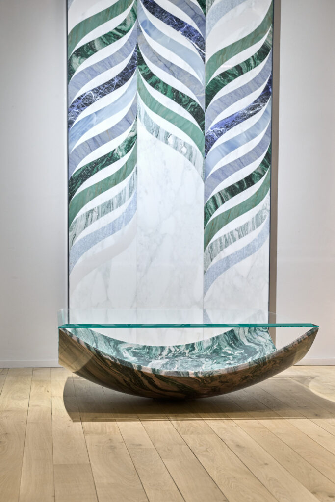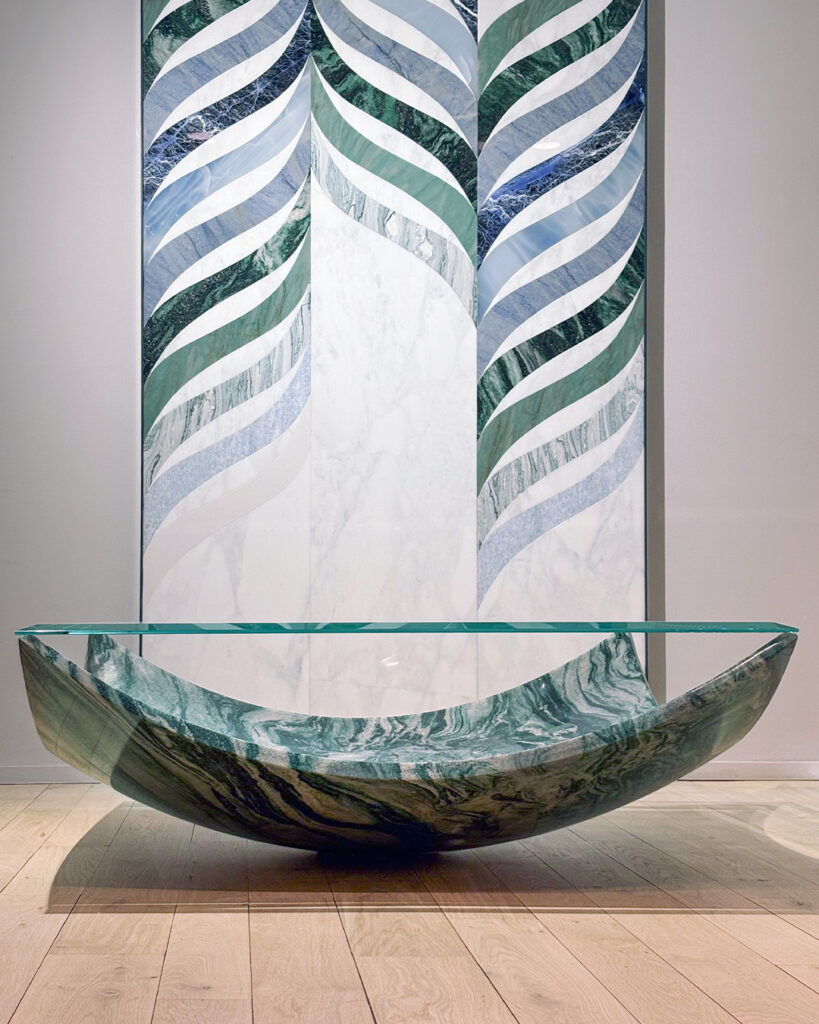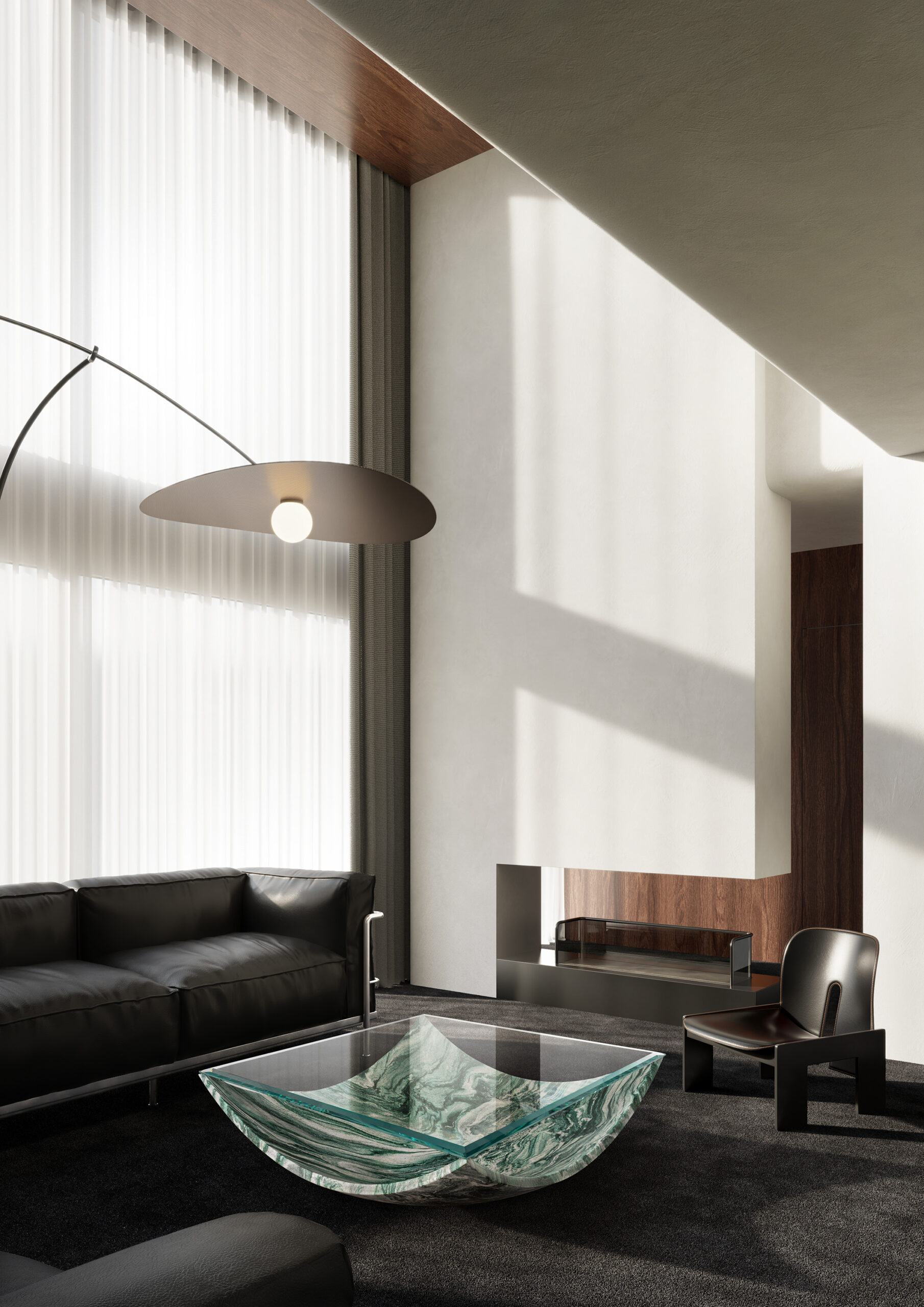 CharmeCoffee Table crafted from an impressive solid block of Verde Lapponia, a marble with incredible veining that fades from pale green to emerald. Inspired by the gesture of a magician lifting the veil to reveal the surprise beneath, its shape is square yet defined by a flowing, curved movement. Light and seemingly suspended, the extra-clear glass top fully showcases the beauty of the stone.