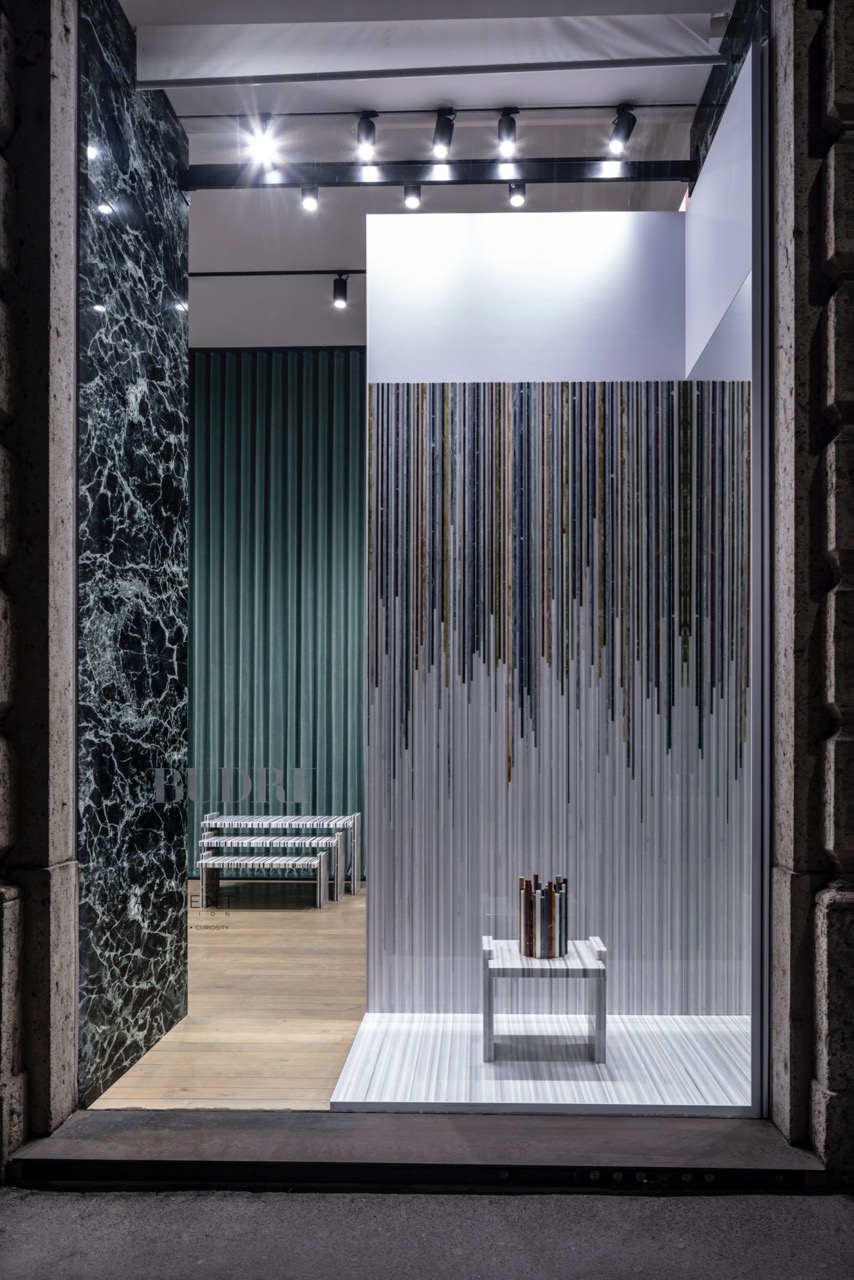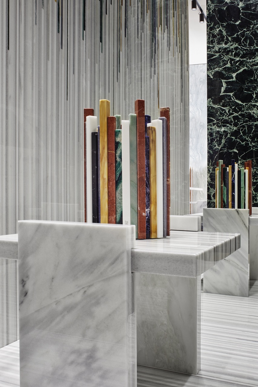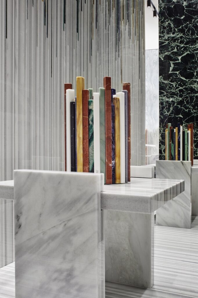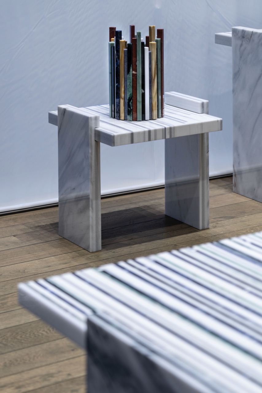 Gwenael NicolasModular Coffee Table with striped pattern in marble in shades of white and gray, with feet made up of 4 small slabs coupled with different materials. The sober combinations of the precious Striato Olimpico, Bianco Sivec, Bianco Namibia and Bianco Covelano marbles confer preciousness and elegance. The Coffee Table can be combined with the size S Fragment Coffee Table White.