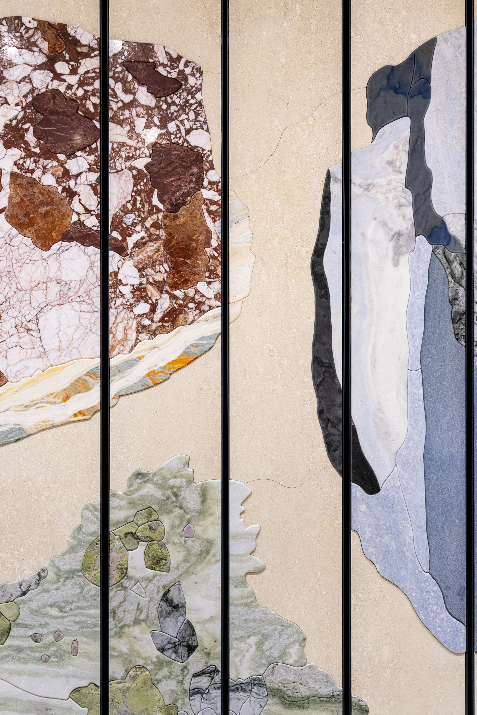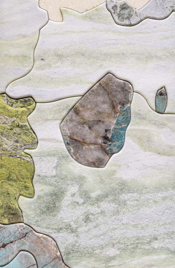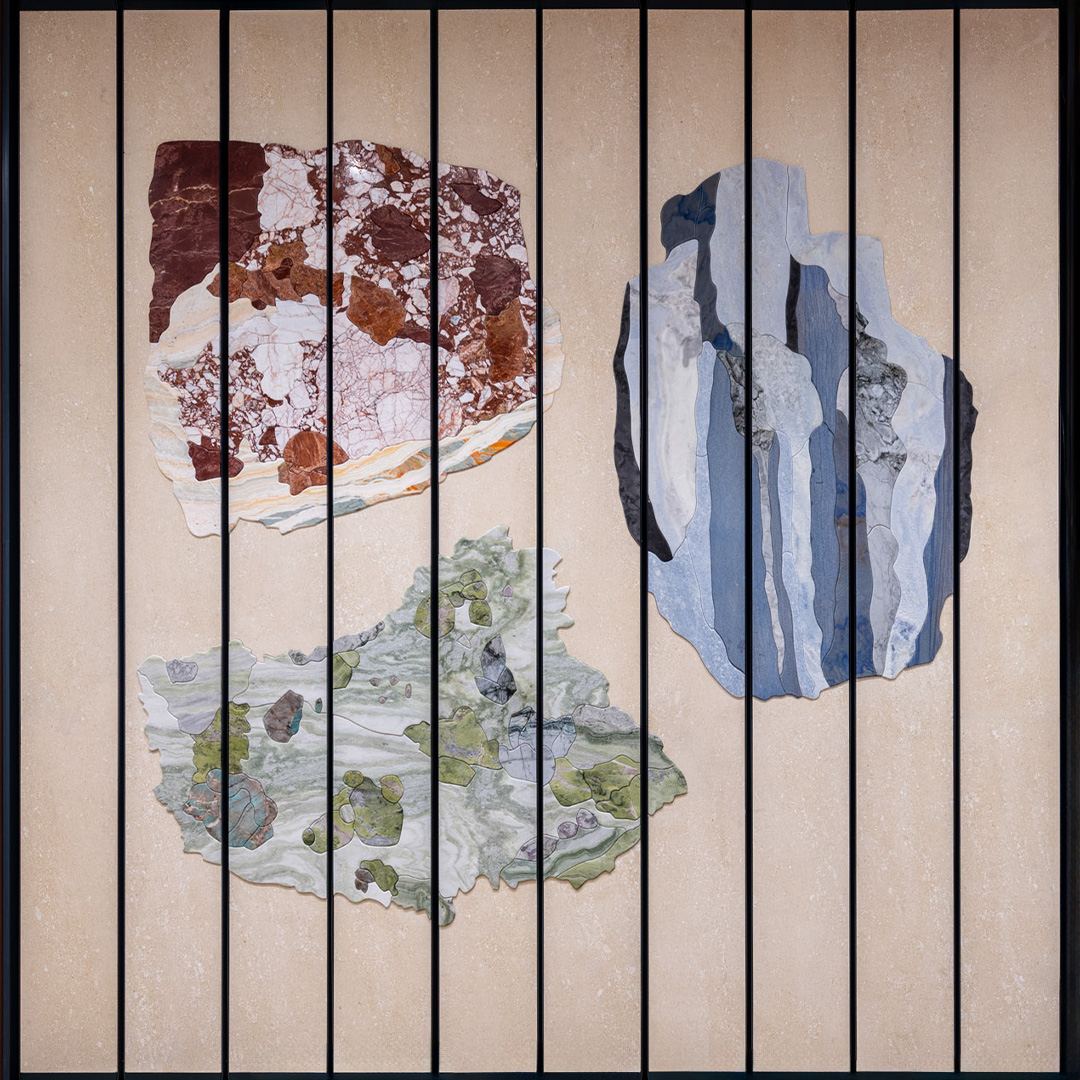 I nostri artwork sono interpretazioni pittoriche, realizzate in marmi, onici e pietre semipreziose, attraverso cui i designer esprimono, in grande scala, nuove forme di linguaggio artistico. Come quadri, gli artwork sono vere e proprie opere d’arte per unicità, ricerca e complessità.The large Geodies Artwork represents three large stones emerging from the sand-colored Limestone background. The stones, in shades of blue, green and earthy red, are represented by different thicknesses and textures to represent the surfaces of boulders in nature. Brecciated and veined marbles, which make up the large inlay, release crystalline or washed-out parts to leave traces of erosion over time.