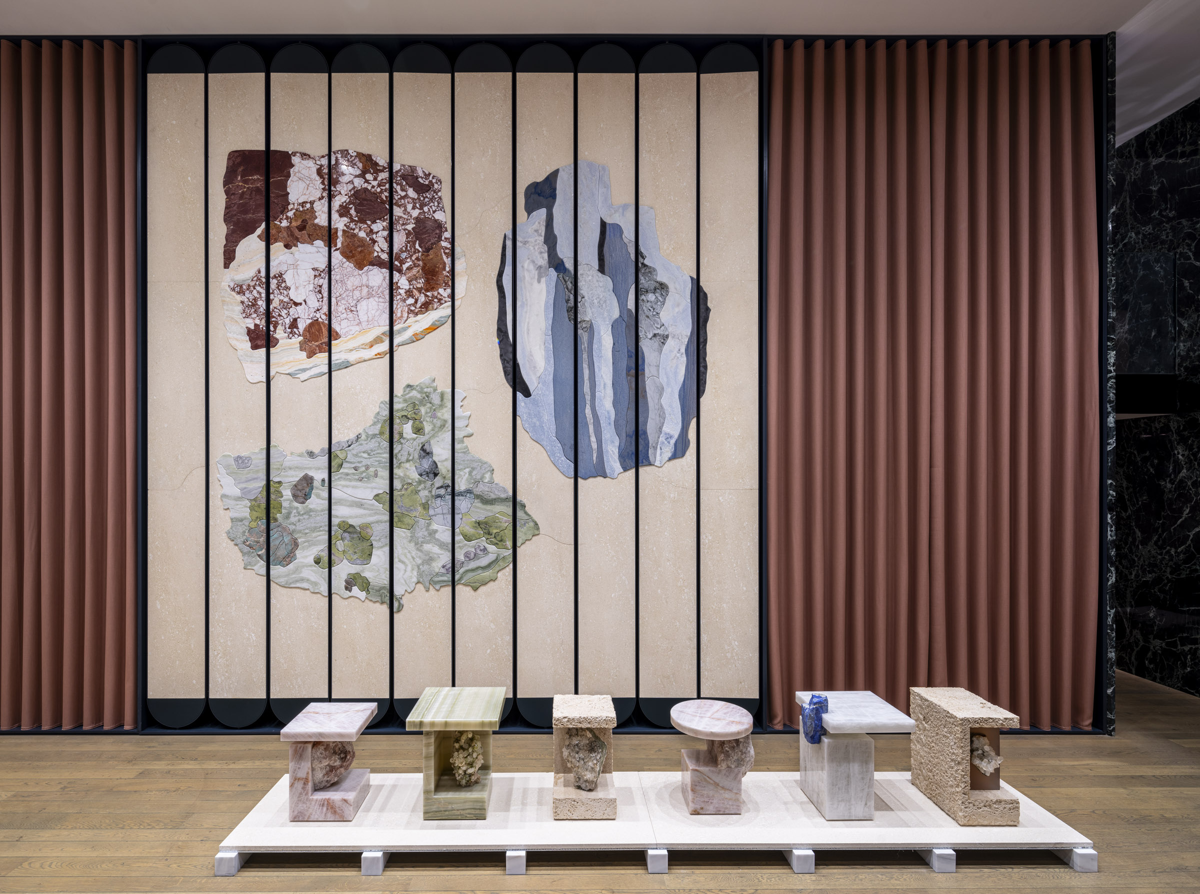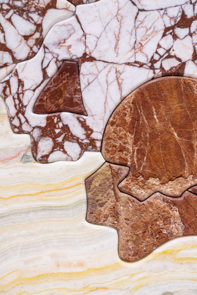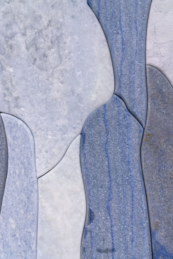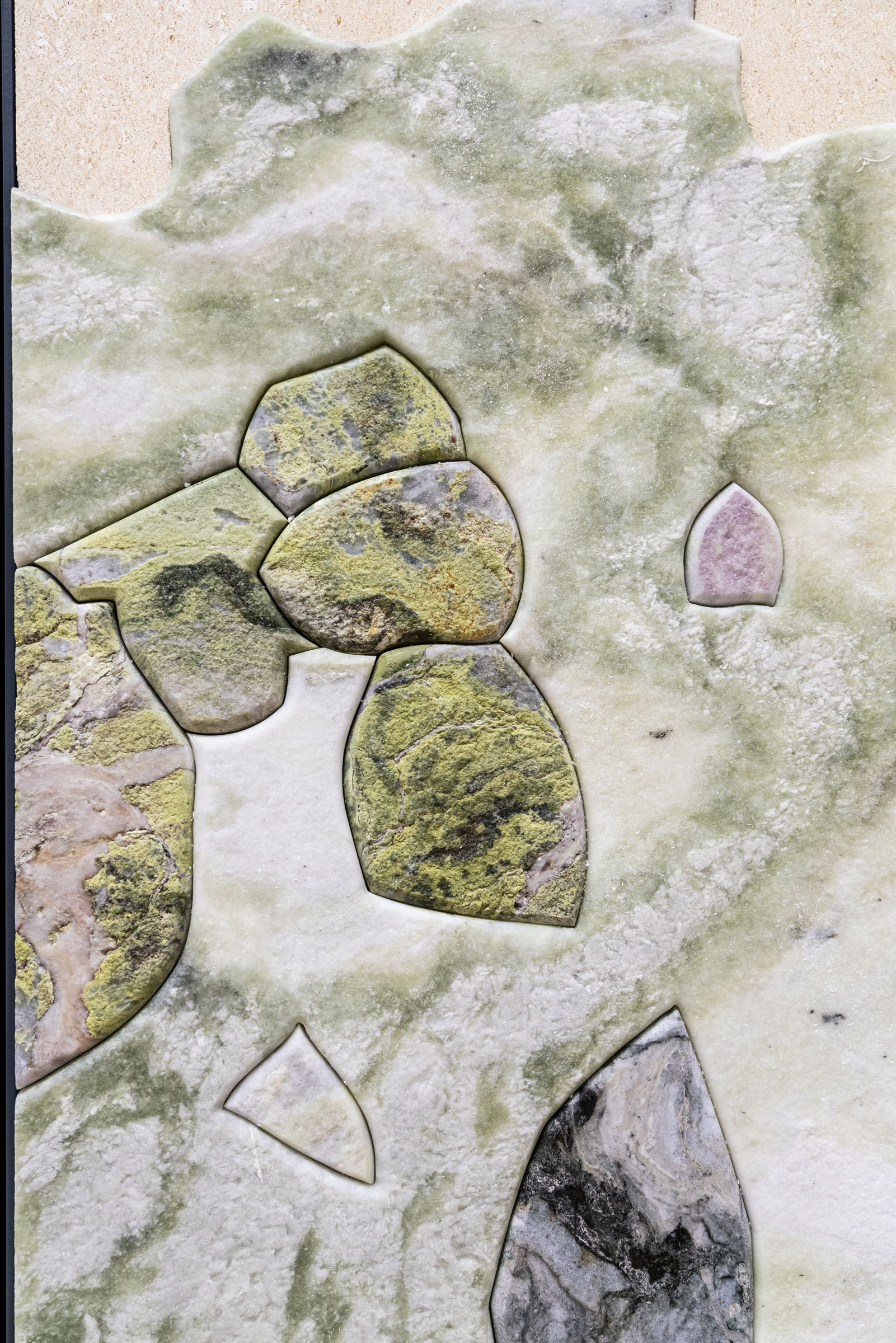I nostri artwork sono interpretazioni pittoriche, realizzate in marmi, onici e pietre semipreziose, attraverso cui i designer esprimono, in grande scala, nuove forme di linguaggio artistico. Come quadri, gli artwork sono vere e proprie opere d’arte per unicità, ricerca e complessità.The large Geodies Artwork represents three large stones emerging from the sand-colored Limestone background. The stones, in shades of blue, green and earthy red, are represented by different thicknesses and textures to represent the surfaces of boulders in nature. Brecciated and veined marbles, which make up the large inlay, release crystalline or washed-out parts to leave traces of erosion over time.