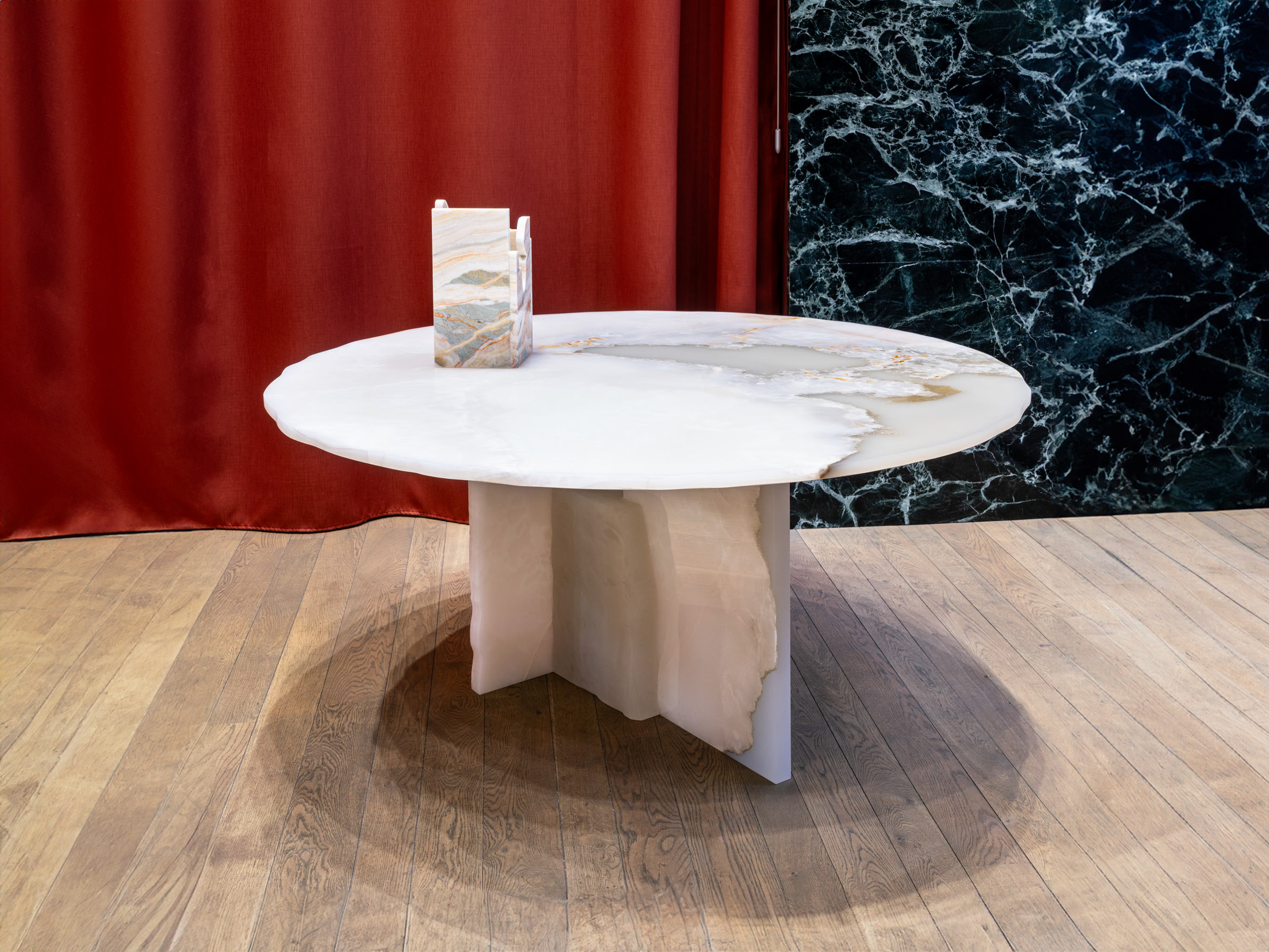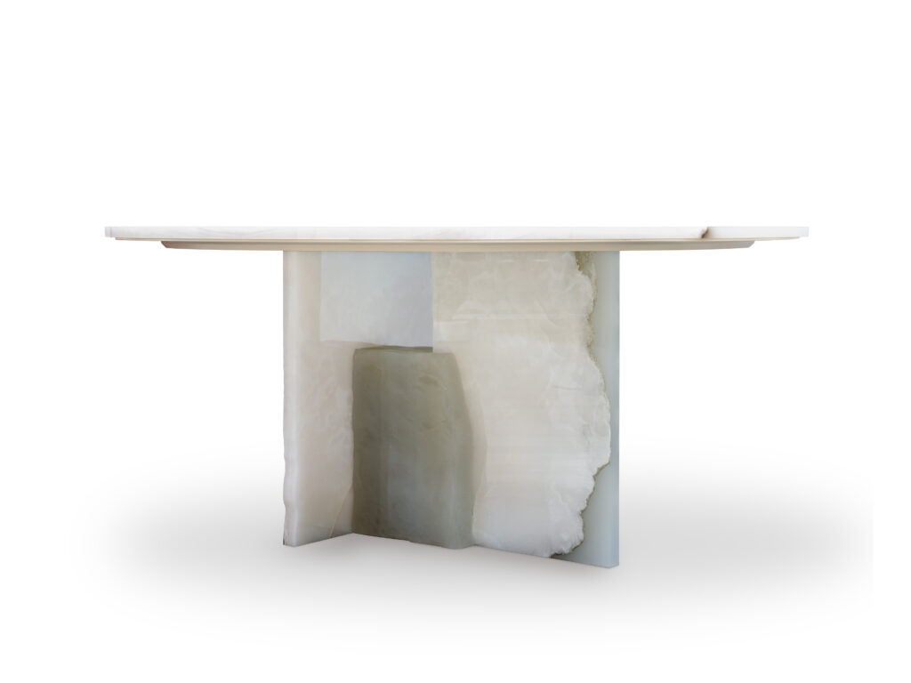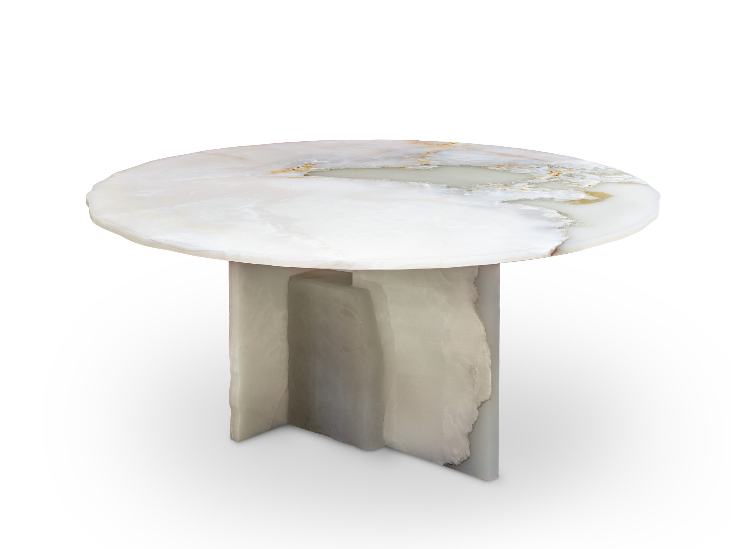 Corteza Living Table is not just a designer table, but a unique work in terms of form and language. The table top is made from a large slab, a crust of white onyx; imperfect in its natural form, it becomes perfection through resin extensions that integrate the parts eroded by the evolution of the quarry. The table legs, made with the same crust, have resin extensions.type of marble