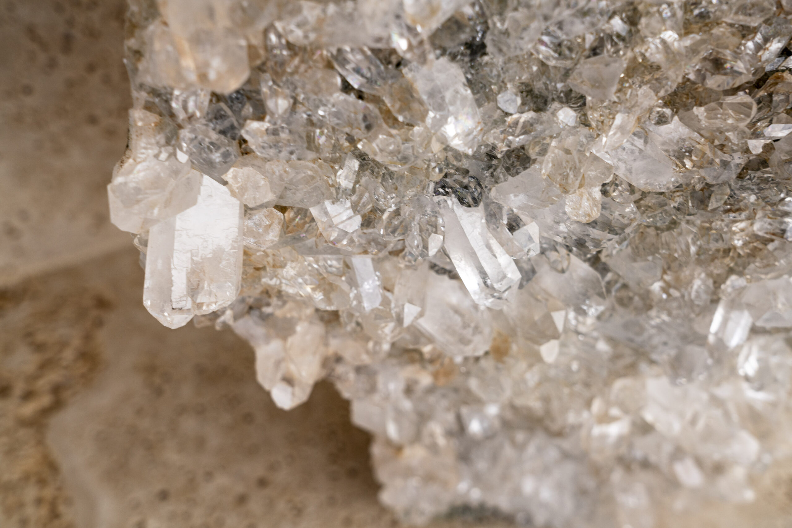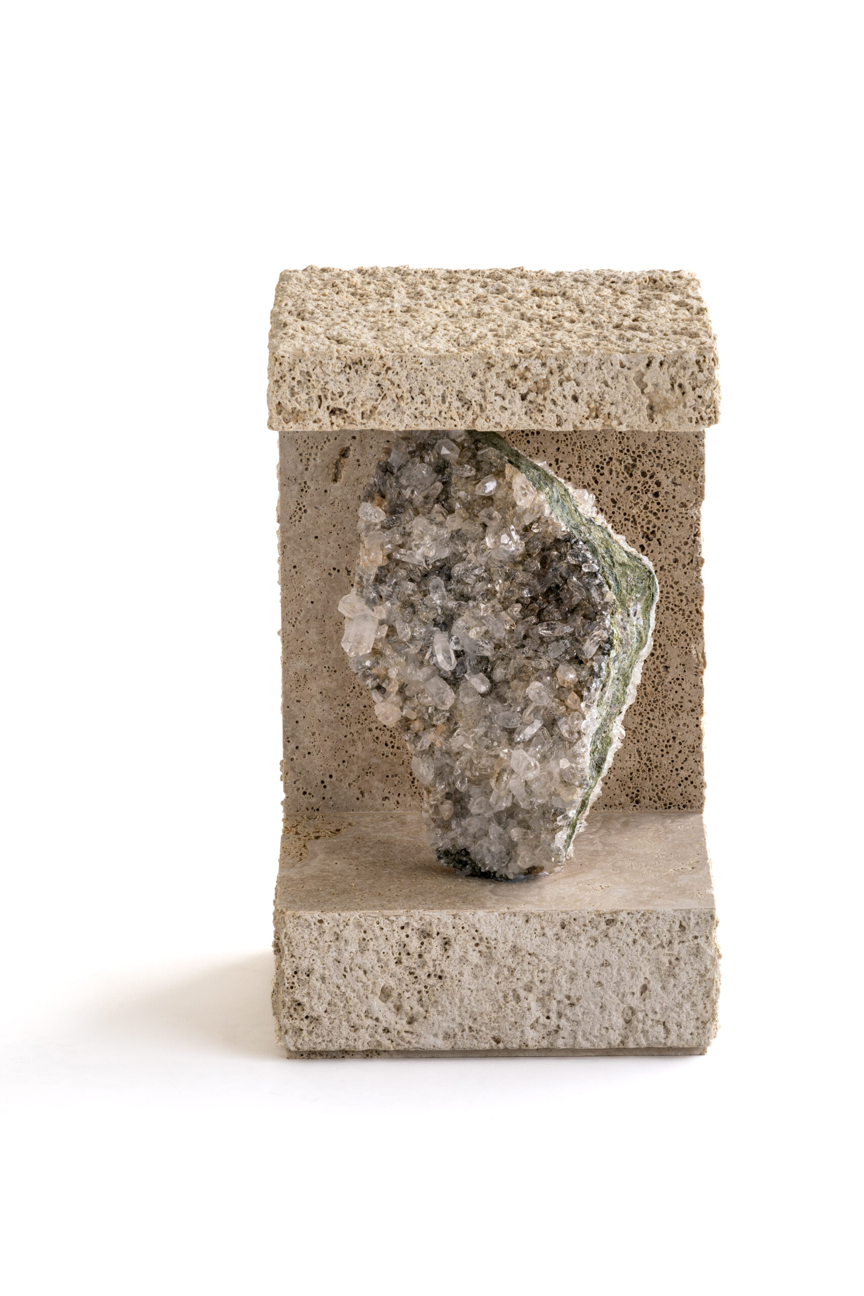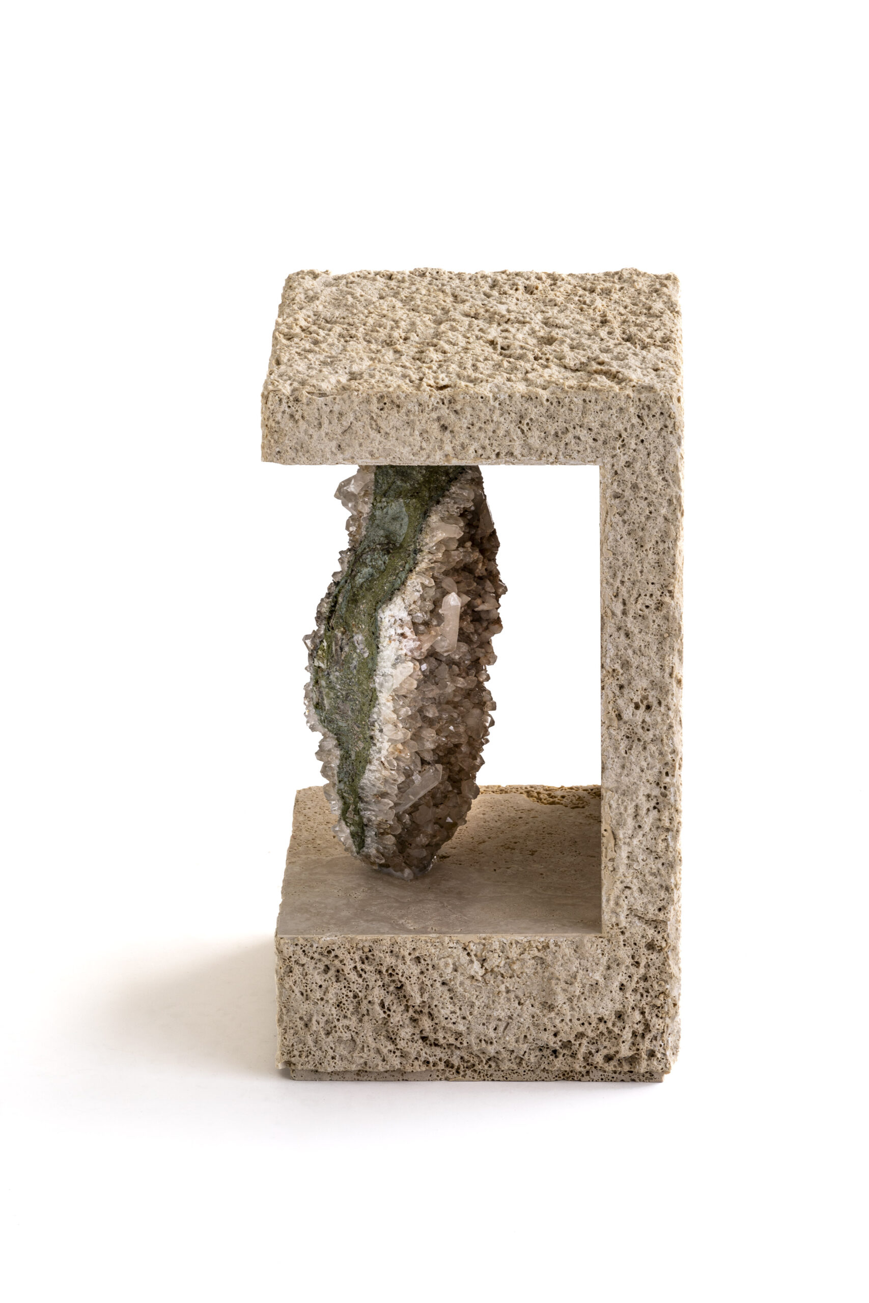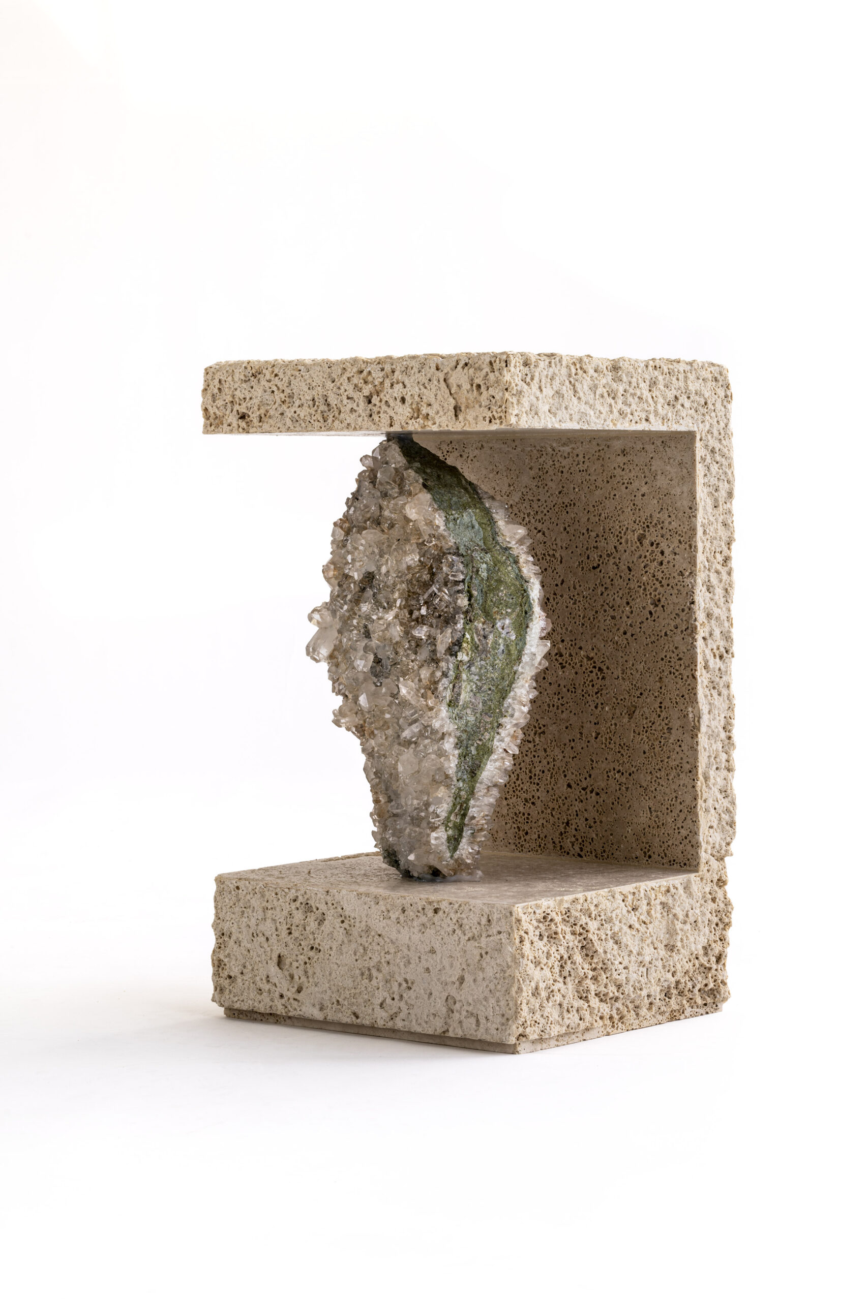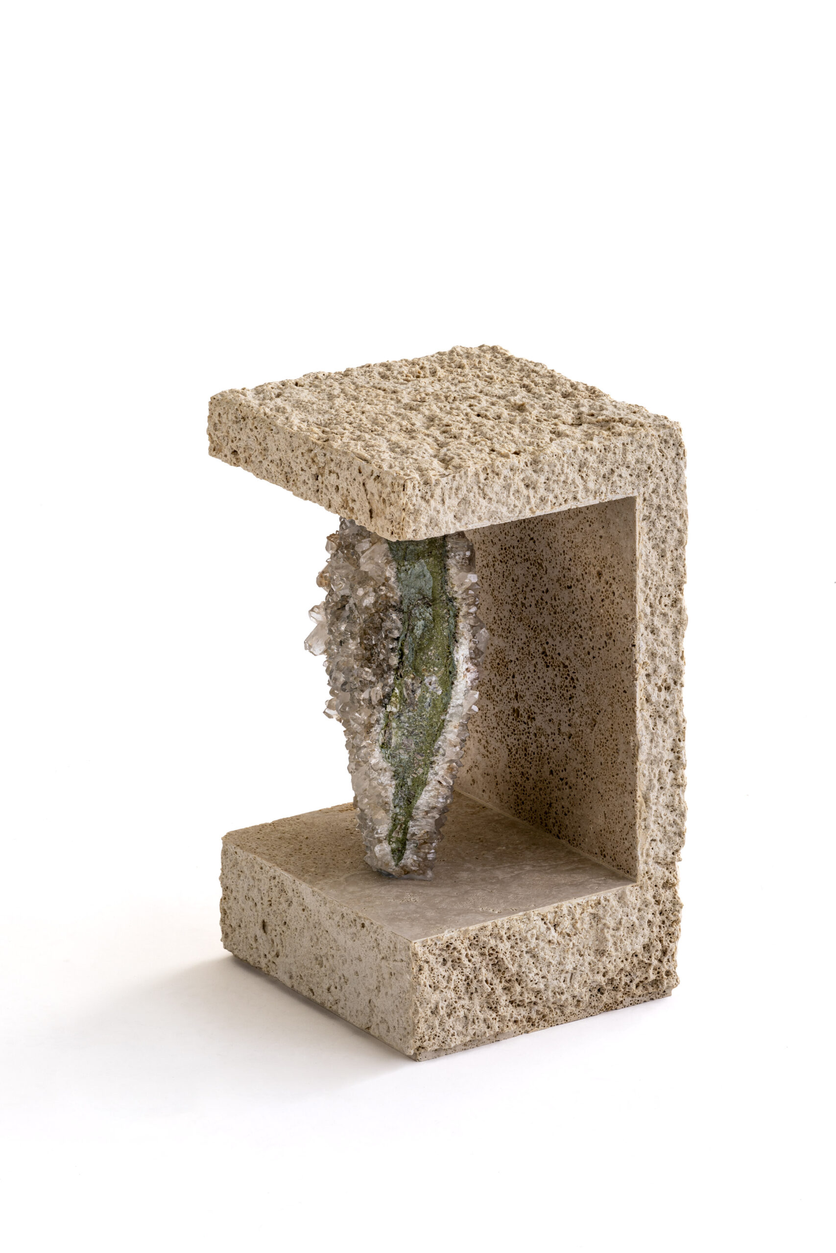 This one-of side table is made of Rock Travertine, with a rigorous, "T" shape. The peculiarity which makes this complement absolutely unique is the large, precious white quartz geode in nuanced tones of white. Like a treasure chest, the travertine encloses the geode, which is seen at natural height. The large geode represents the expression of natural perfection in its most spectacular, precious and sparkling declination.type of marble