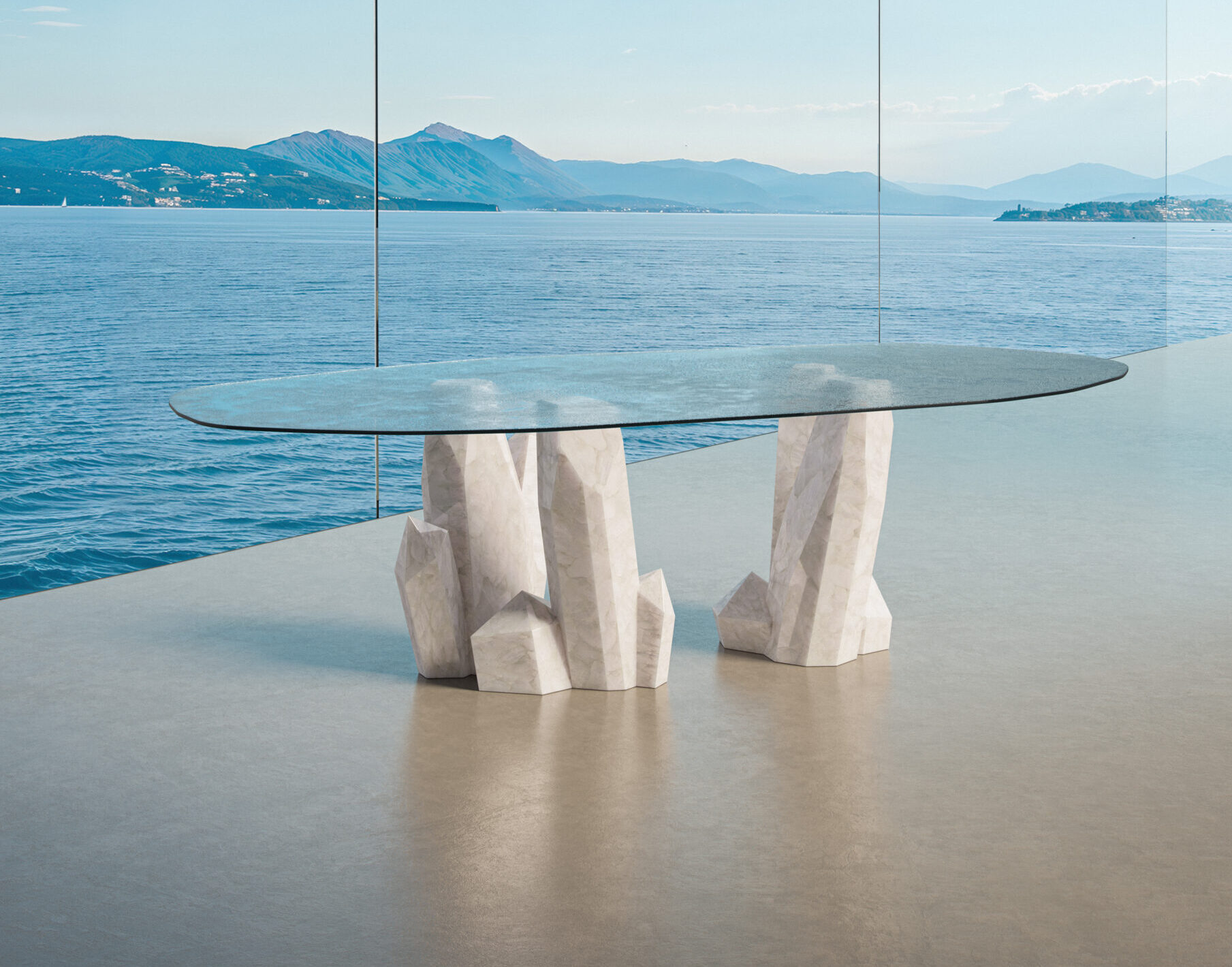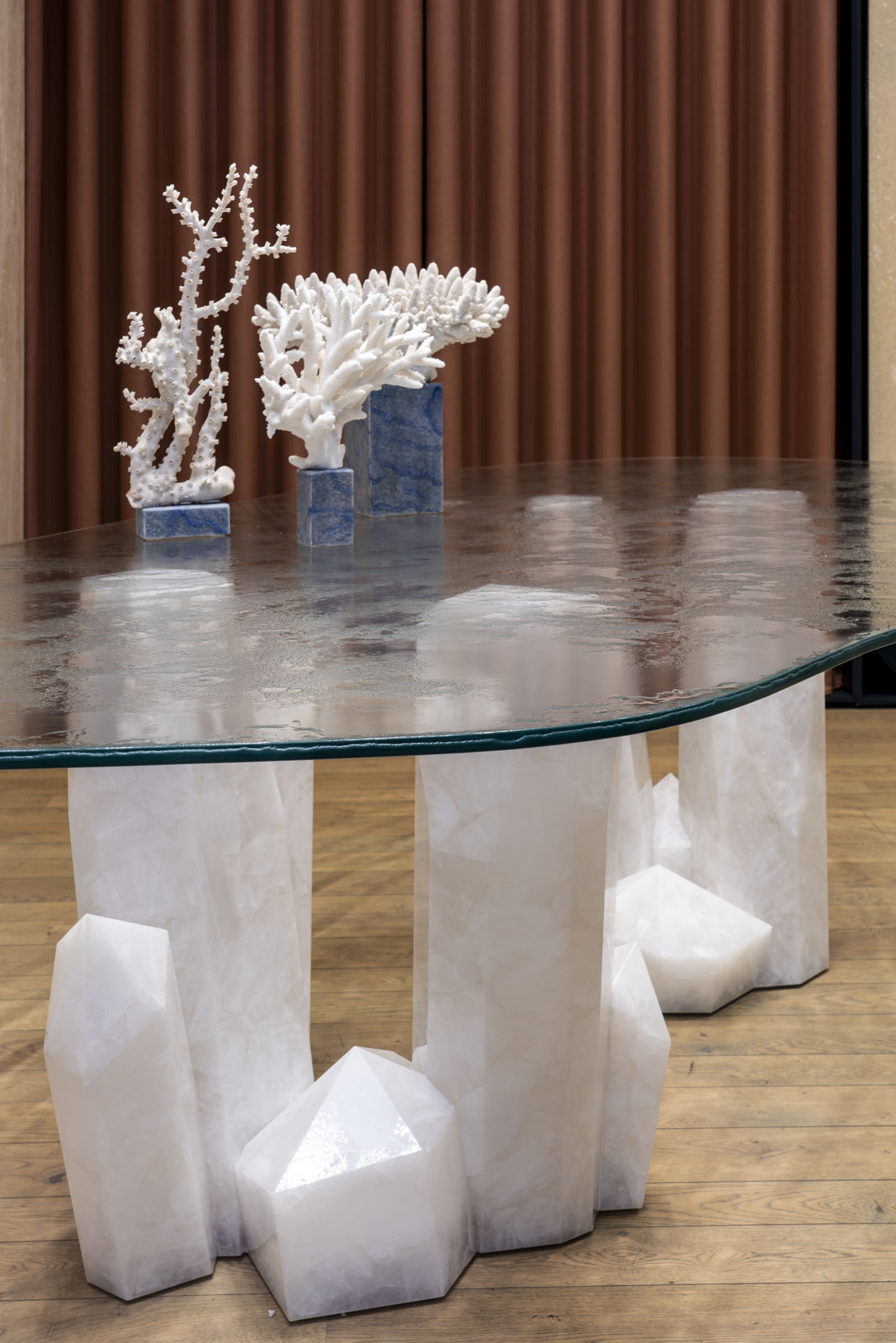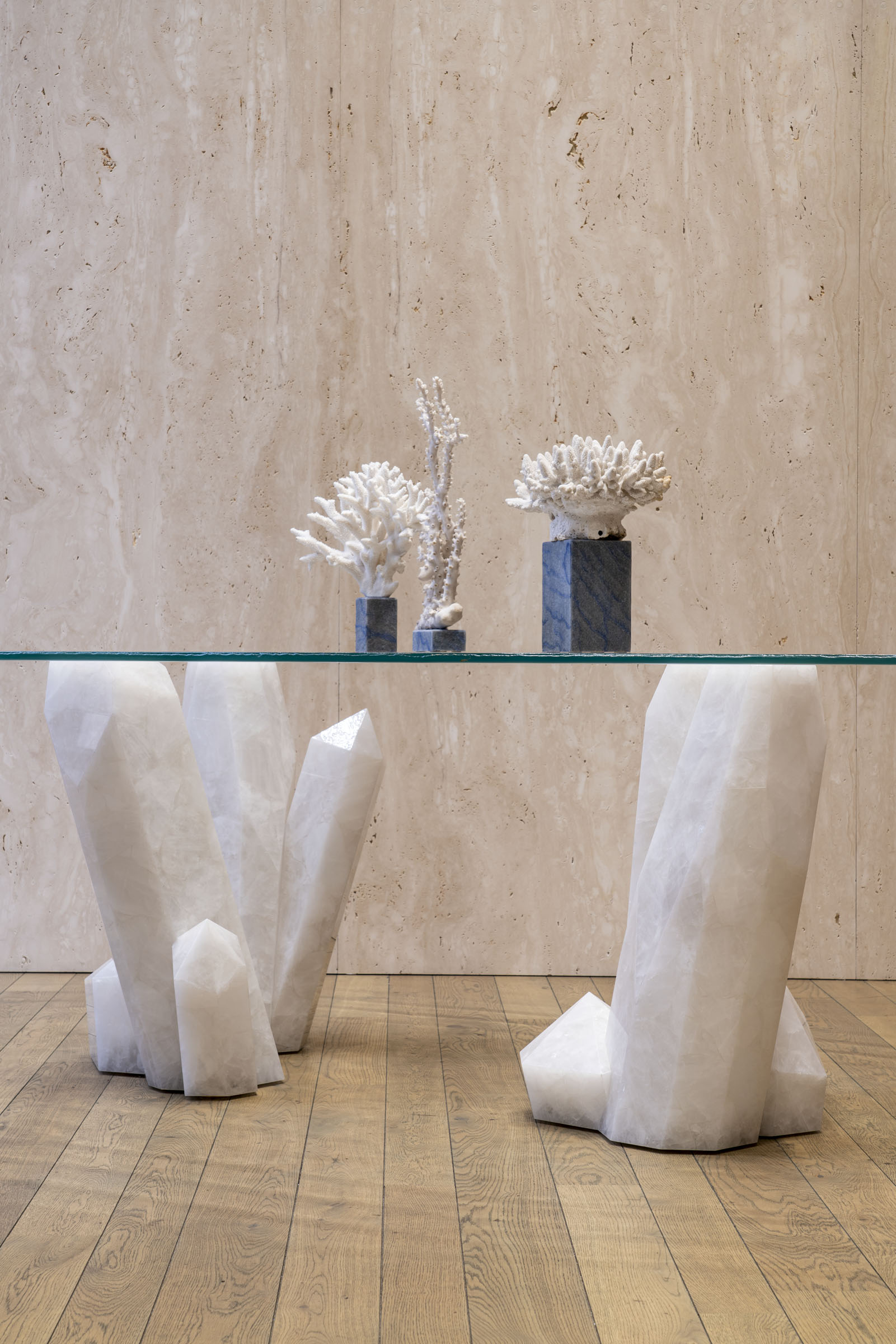 Mass Quarz is a precious masterpiece dining table, highlight of the new Geodies Collection designed by Patricia Urquiola for Budri.Prominent elements of this table are the feet inspired by the crystal habitus of quartz; sets of geometric shapes arise like cusps, becoming the base of the dining table. They represent an exceptionally complex work; indeed the white quartz handcrafted segments form quartz crowns in big scale.