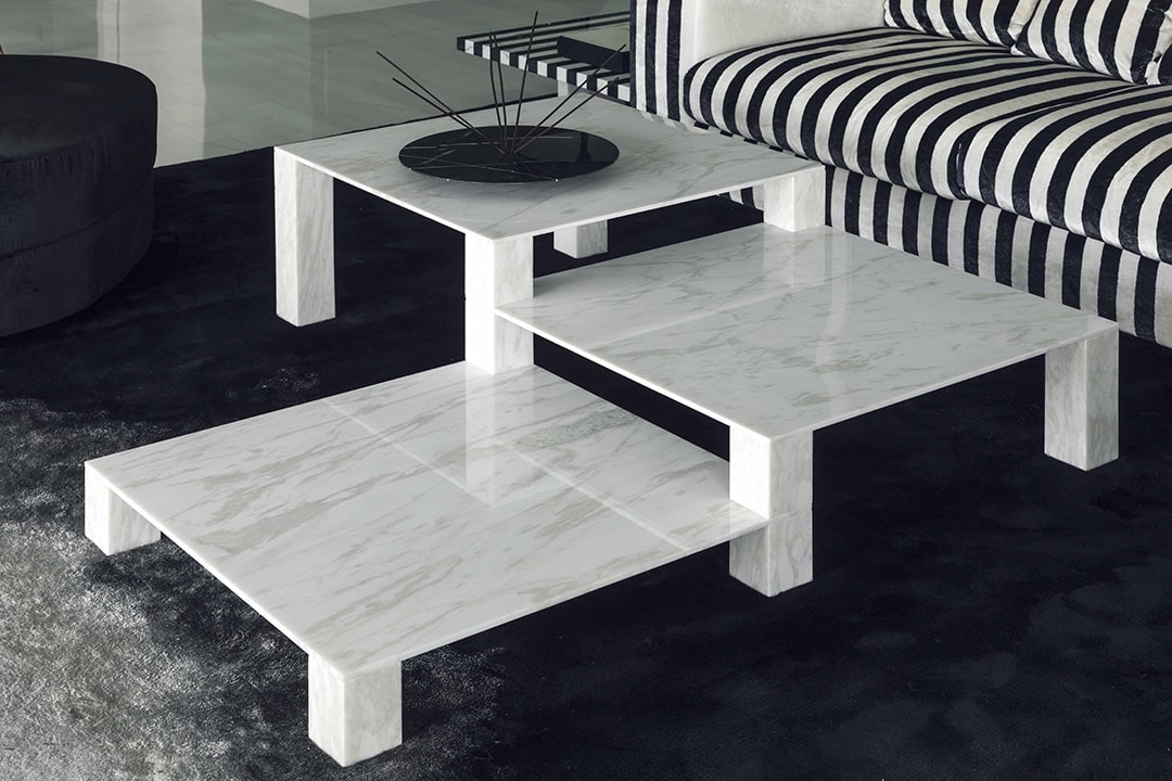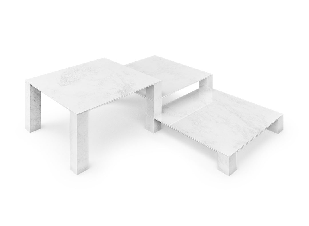 Gwenael NicolasIungo is a coffee table crafted in Calacatta Fox marble, consisting of three different-sized table tops linked together. The combination of three squares set at different heights brings a dynamic quality to the living room. The joint between the table tops and the legs echoes the motif of the Setis console tables.