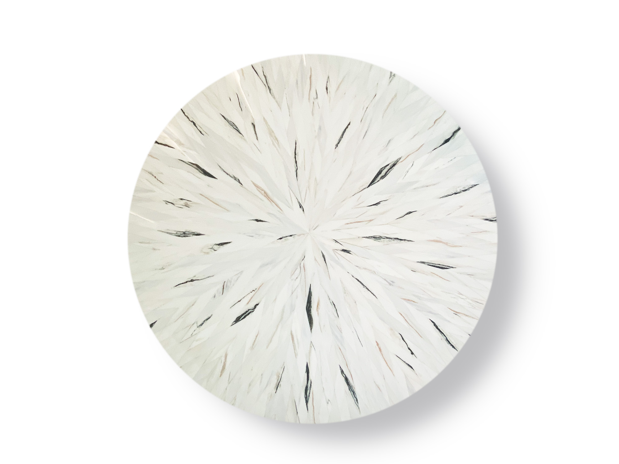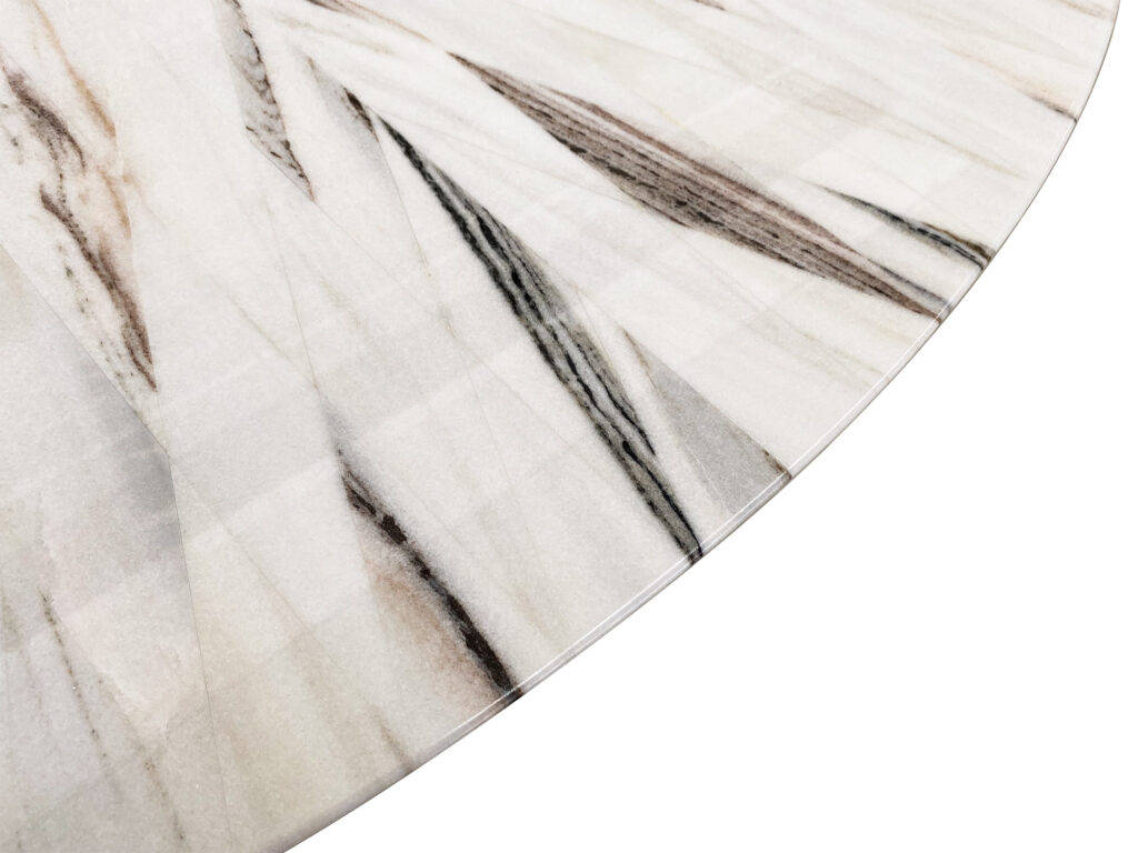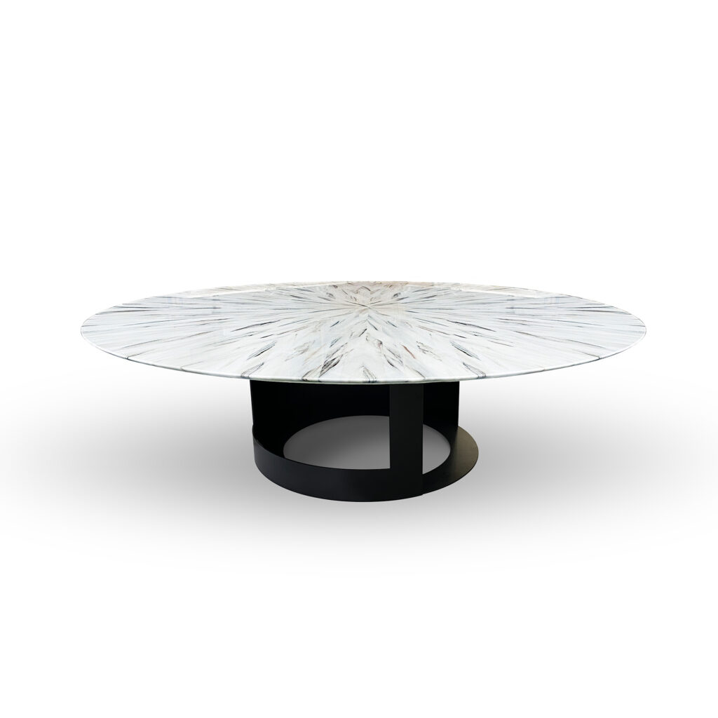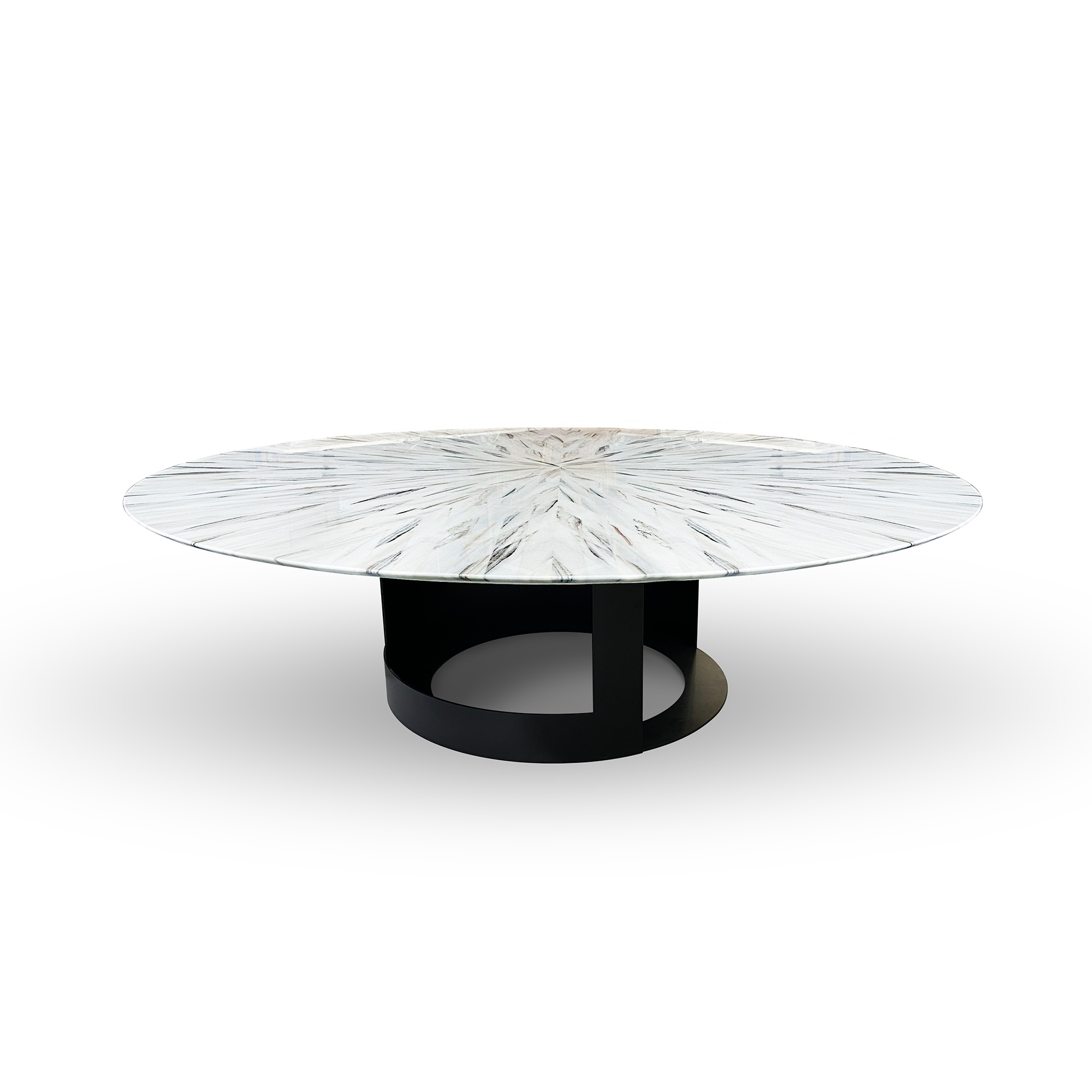 Large and elegant dining table made of Lasa di Covelano marble, characterized by a warm white background and delicate dove gray and black veining. The inlay of the top, composed of concentric rhombuses, forms a pattern with a kaleidoscope effect. The table foot is made of matt black metal. This table, protagonist of the space, can be made, upon request, with a Lazy Susan turntable.