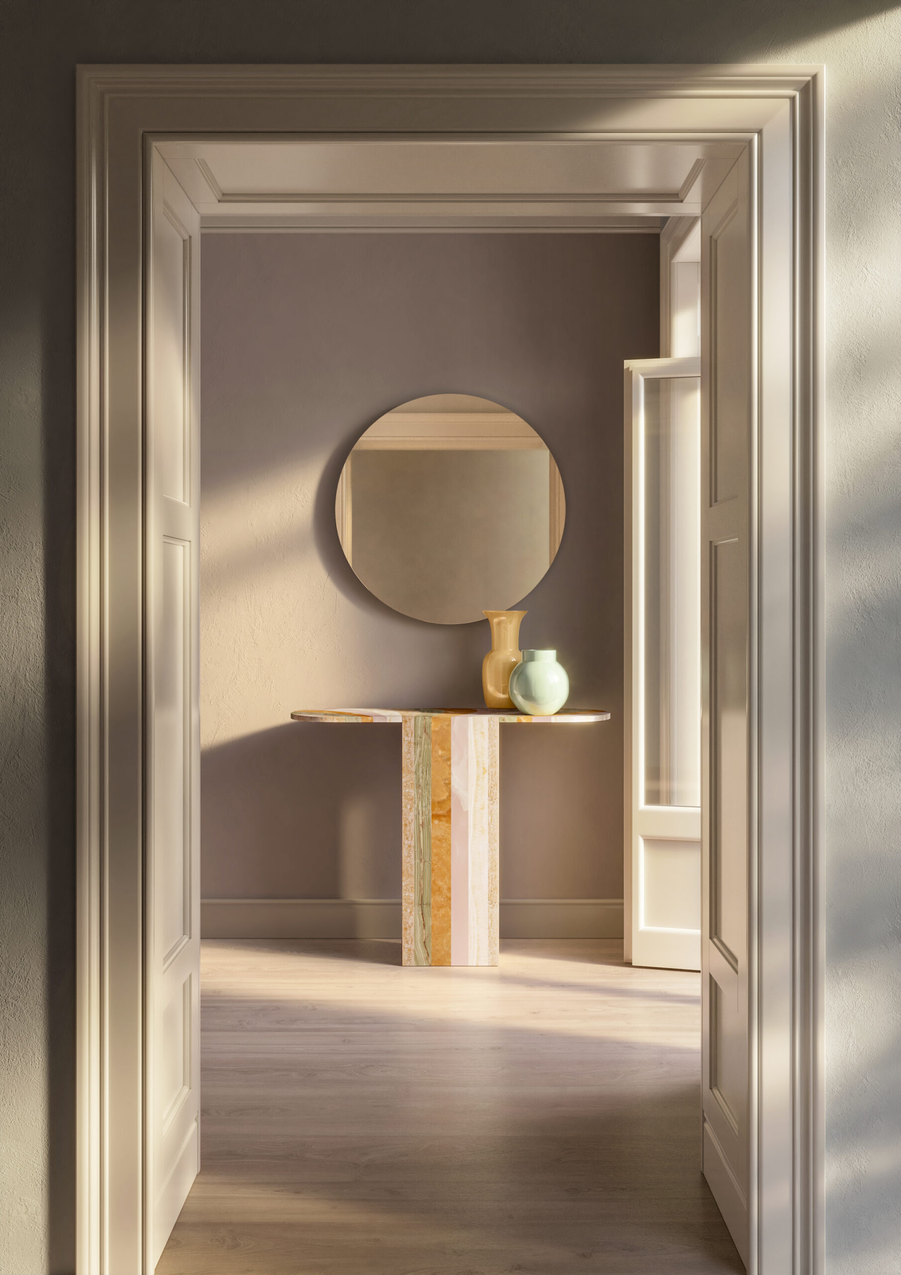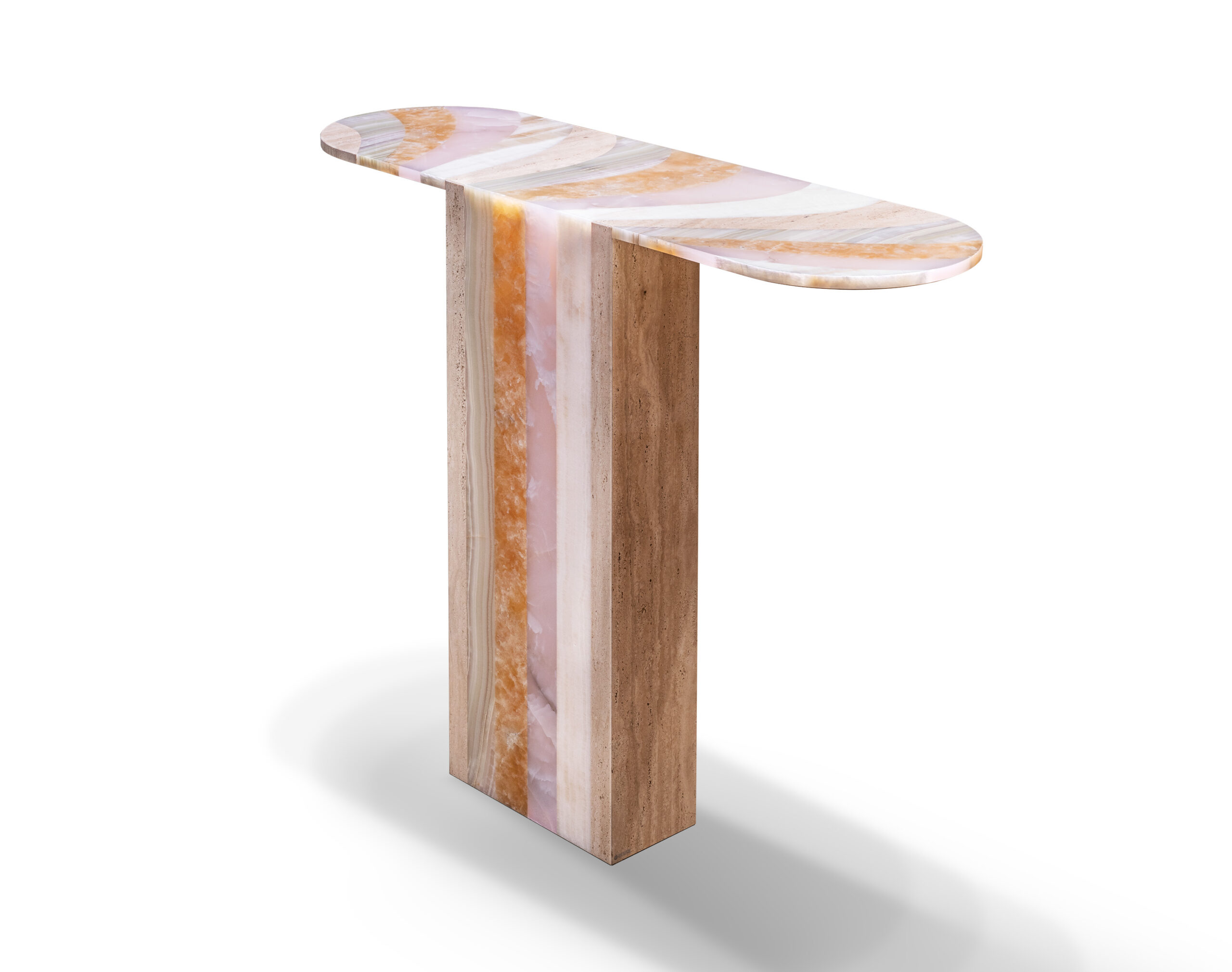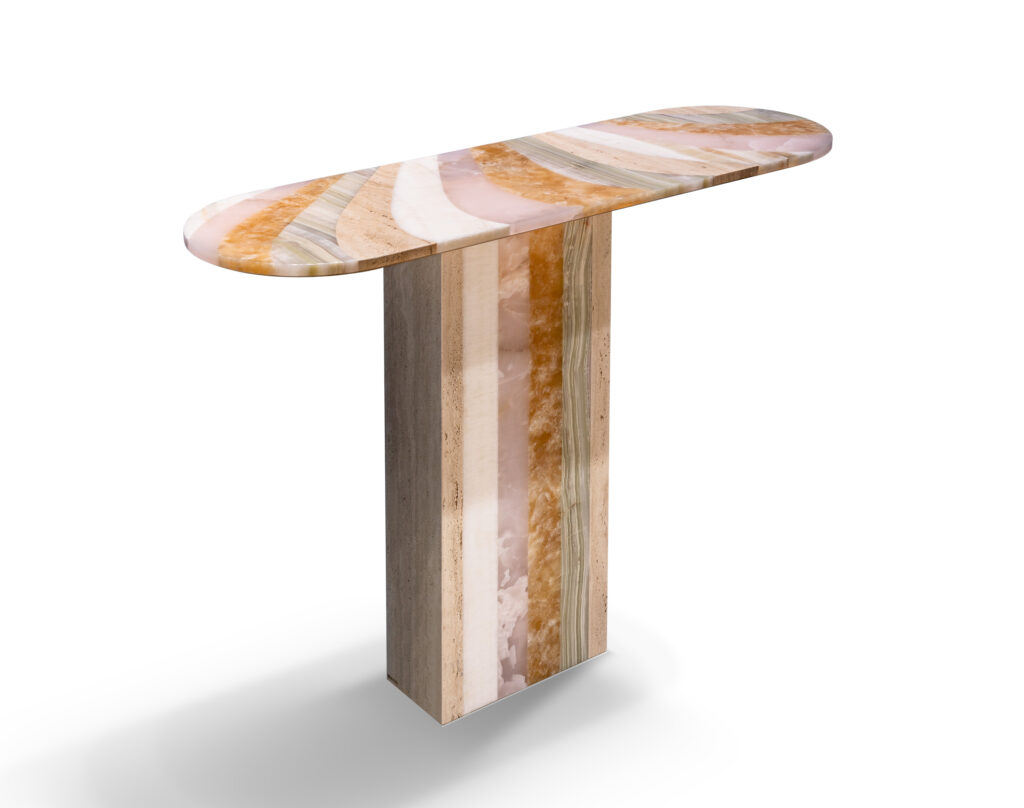 Patricia UrquiolaAquarel edition of the iconic Marea Consolle, characterized by its biscuit-shaped top and graphic continuity with the monolithic leg. Made in Classic Roman Travertine, Pink Onyx, Honey Onyx, Ivory Onyx, Afghan Onyx.