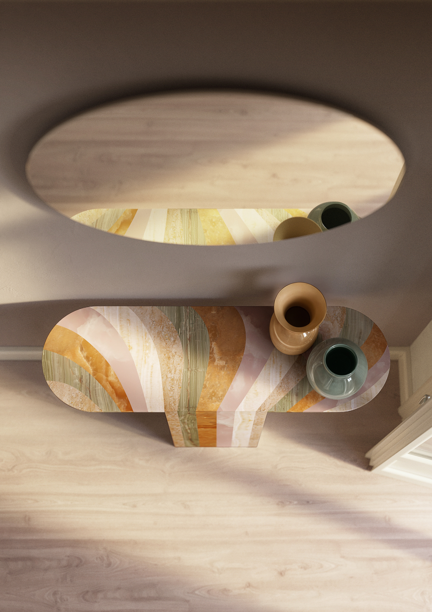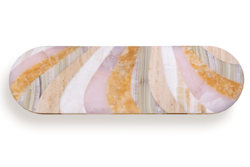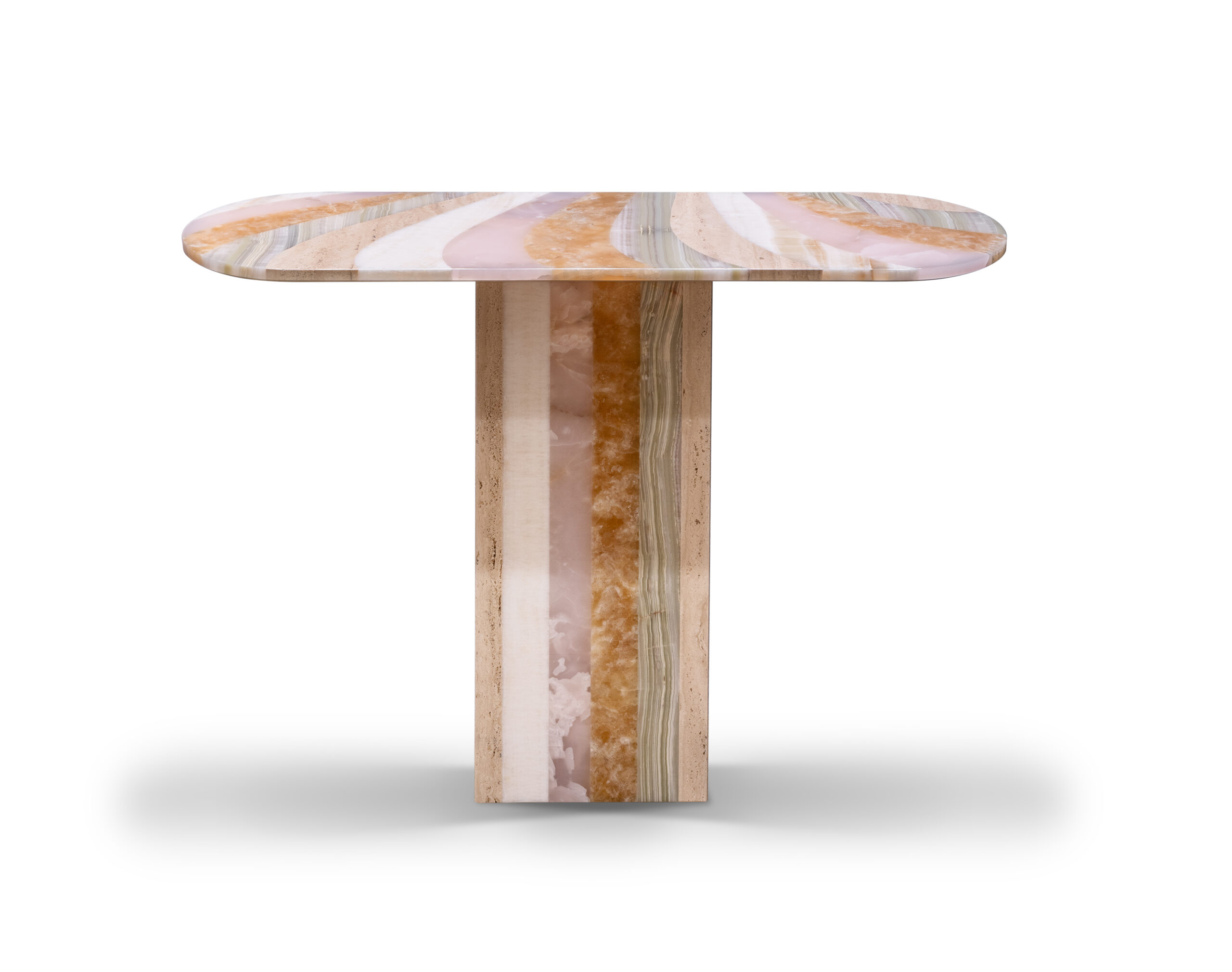 Patricia UrquiolaAquarel edition of the iconic Marea Consolle, characterized by its biscuit-shaped top and graphic continuity with the monolithic leg. Made in Classic Roman Travertine, Pink Onyx, Honey Onyx, Ivory Onyx, Afghan Onyx.