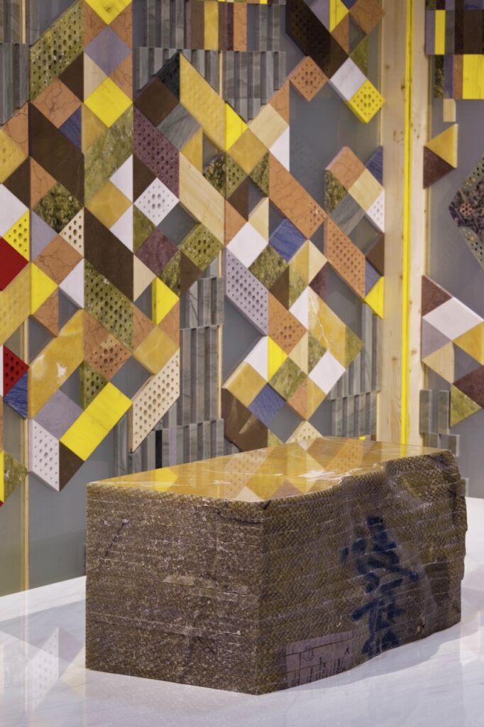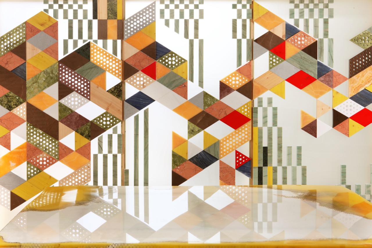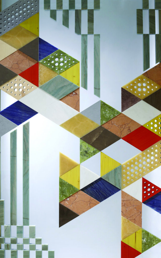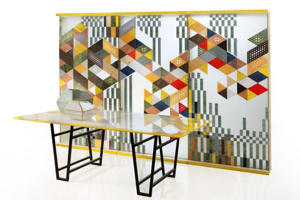 Patricia UrquiolaA treasure-chest of wonders, where inlaid screens and translucent kaleidoscopes of colours and surfaces with marble pixel relief patterns are enclosed in wooden frames. Amazing are the surprising Tartan weaves alternating with delicate lace and embroidery, overturning the usual clichéd ideal of heaviness associated with marble. The original combination of marble inlays with fluorescent-coloured wood and frosted clear glass inserts give the screens transparency and lightness, creating eye-catching effects.