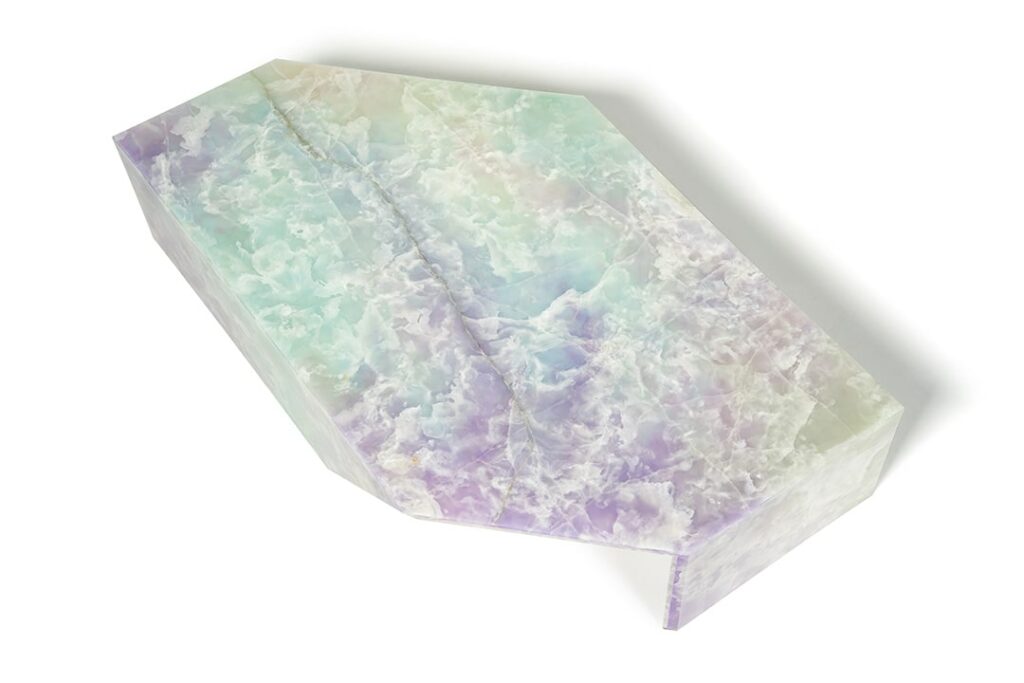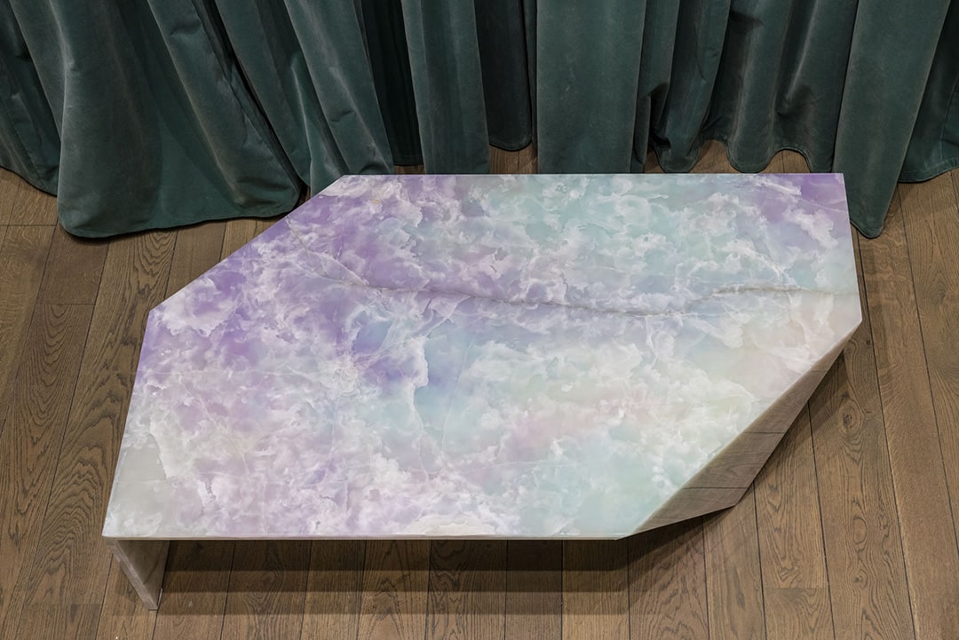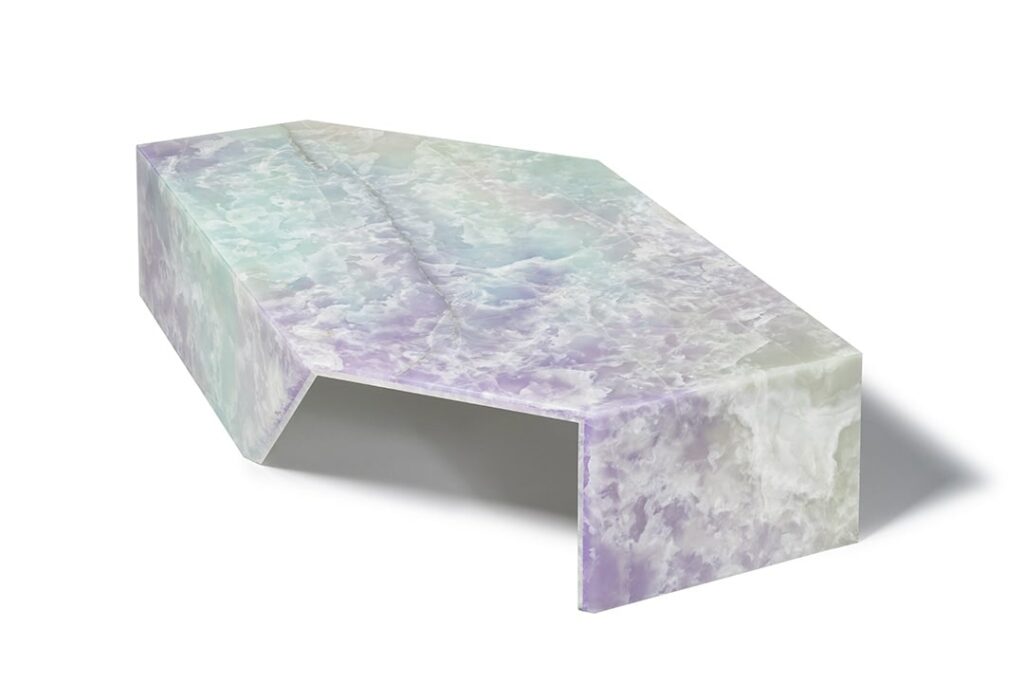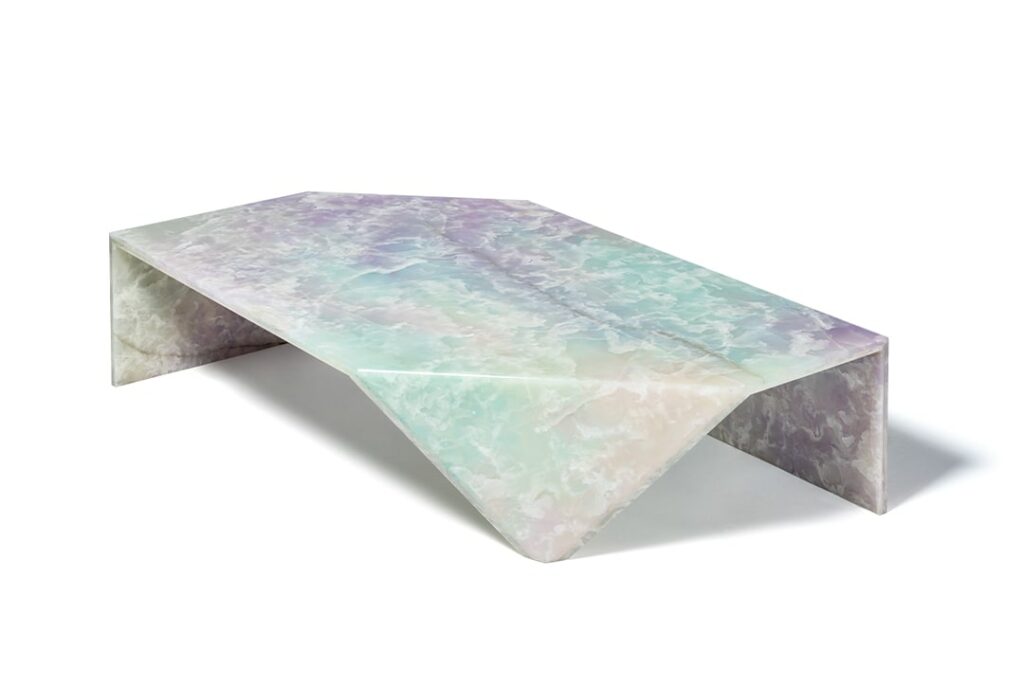 Origami “Amethyst” flaunts sumptuous watercolors in shades of aquamarine green and amethyst. Origami “Amethyst” in White Iranian Onyx with its amazing natural “clouds” is hand watercolored. A surprising and precious “gem “ for elegant interiors.
