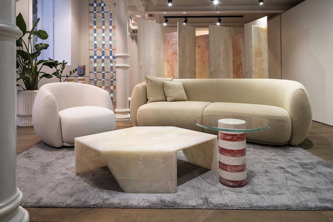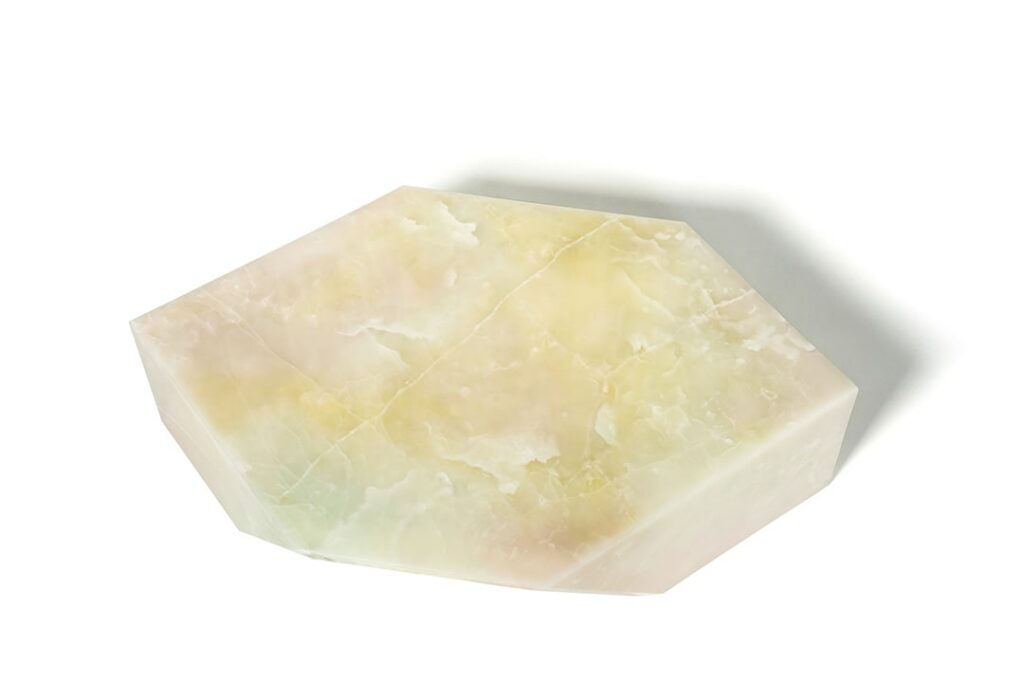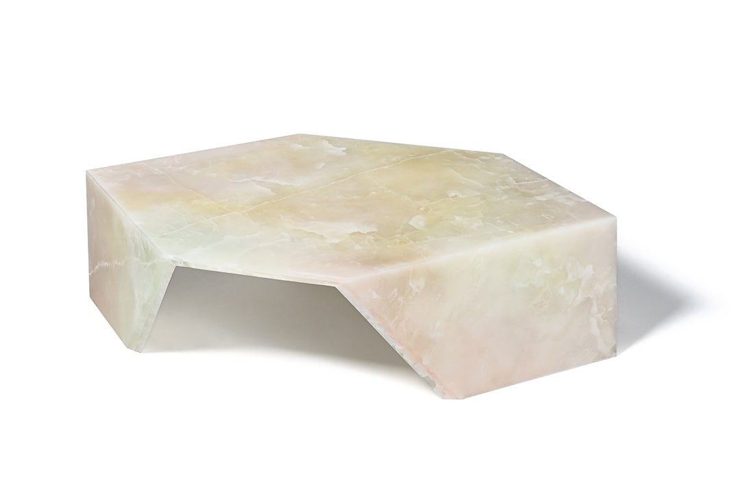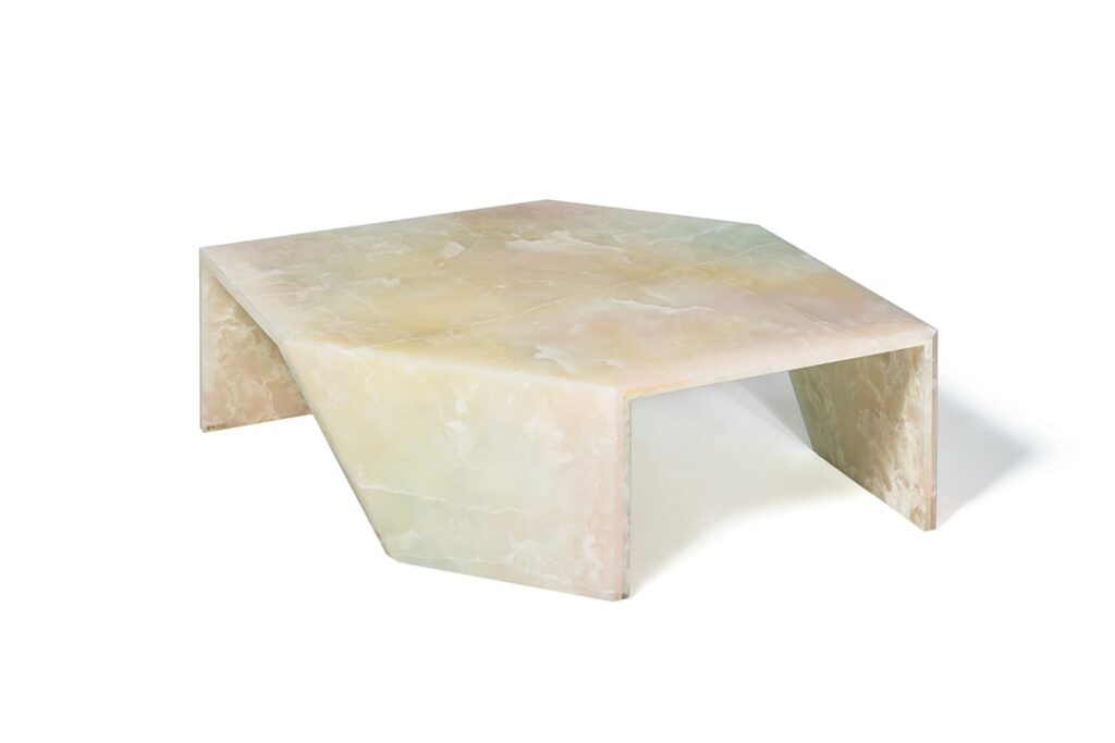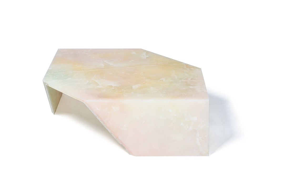 Patricia UrquiolaThe inspiration of Origami "Queen Elizabeth II" comes from an icon of elegance, sobriety and style like Queen Elizabeth II. A table that incorporates some of the nuances used by the court dresses of the sovereign, characterized by personality and class: Origami "Queen Elizabeth II" ennobles every interior. As if marble were paper, the collection of coffee tables is inspired by the ancient Japanese origami: the table top makes a 90° bend becoming the vertical support, in a graphic game of continuity and colour. Origami Coffee Table Aquarel Edition. Made of Onyx Aquarel in pastel shades of Light Pink, Light Blue and Light Green.