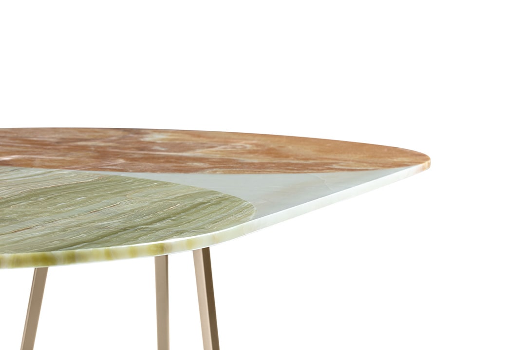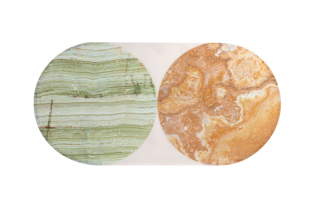 Maarten De CeulaerOval shaped living table, background in Iranian White Onyx, circles in Honey Onyx and Afghan Onyx. Table feet in satin and brushed golden metal.