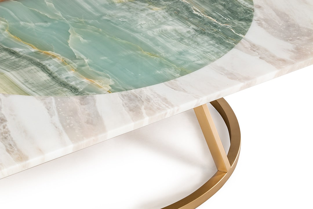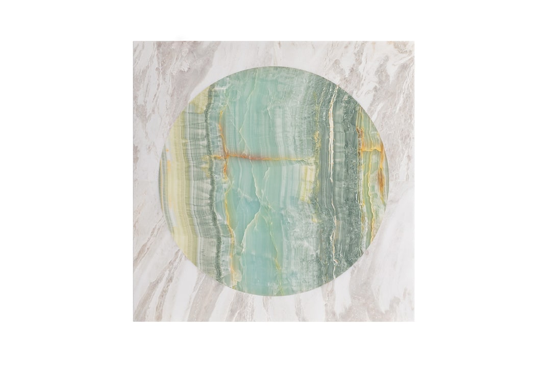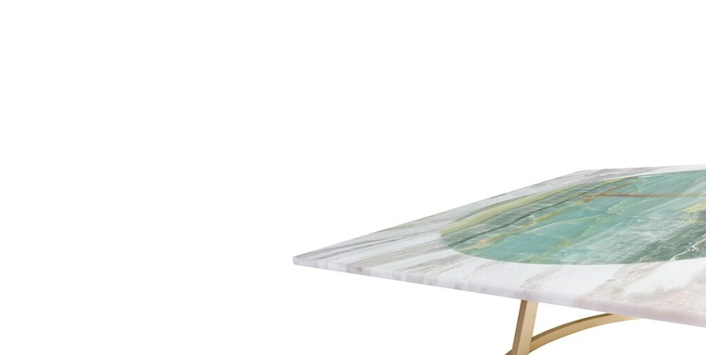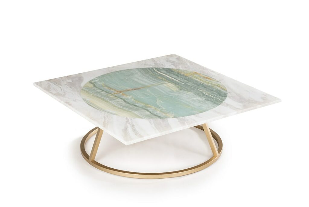 Maarten De CeulaerSquare low coffee table, background in Bianco Nuvola marble, inner circle in Azul Sky marble. Table feet in satin and brushed golden metal.