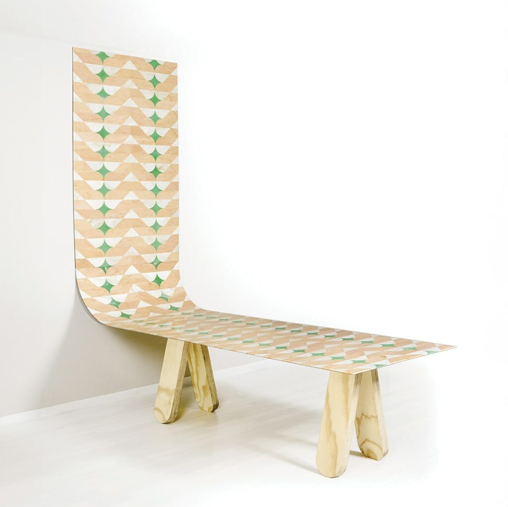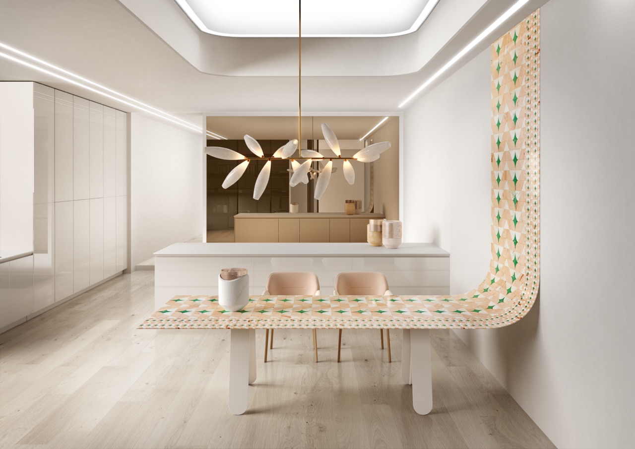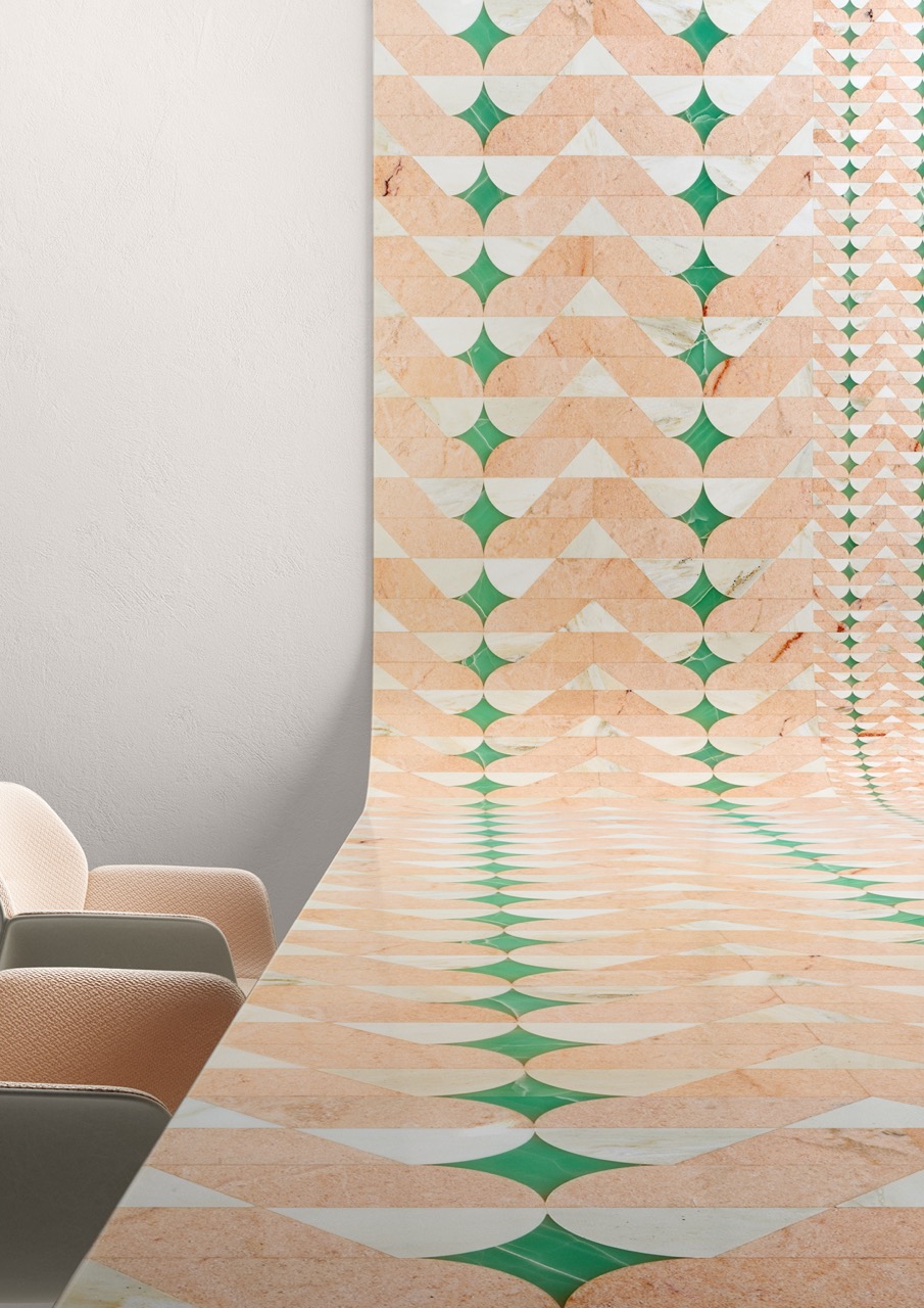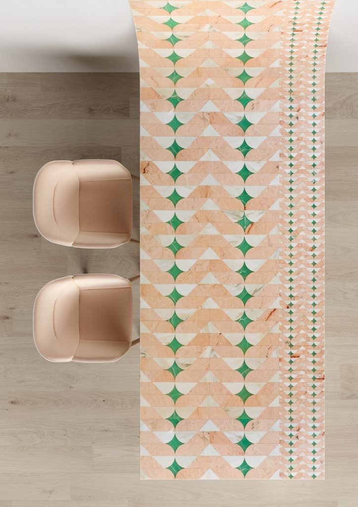 Patricia UrquiolaAmelie, comprising wall inlay, curve and table in Rosa del Portogallo Salmon, Rosa del Portogallo Estremoz, Green Aqaurel Onyx. Macropattern with slim thickness of 0,8 cm.