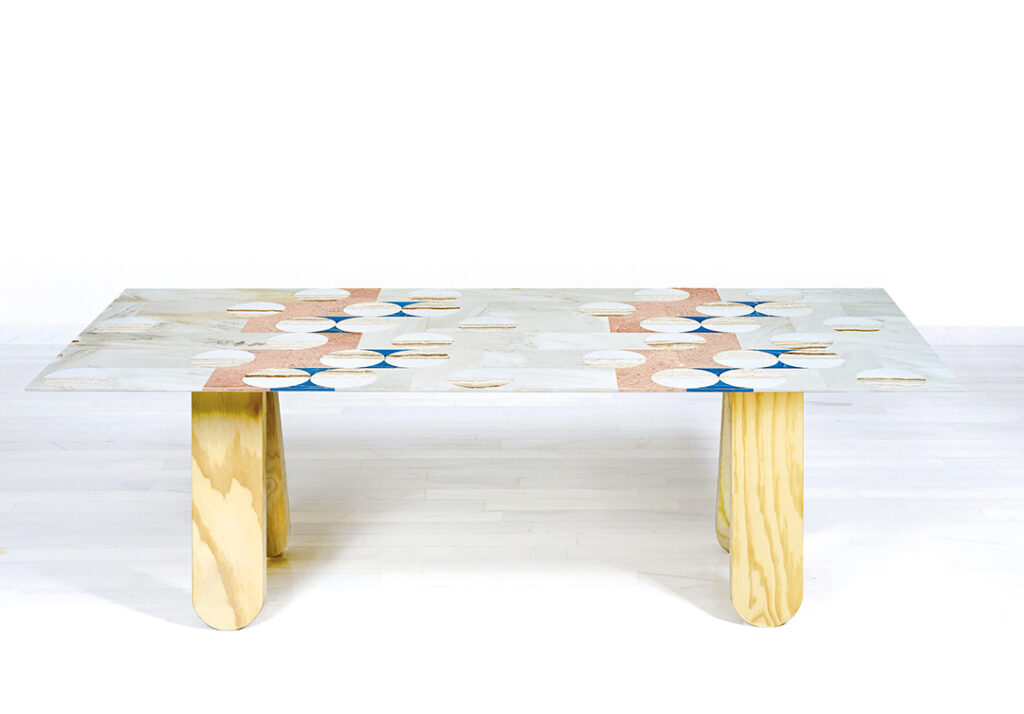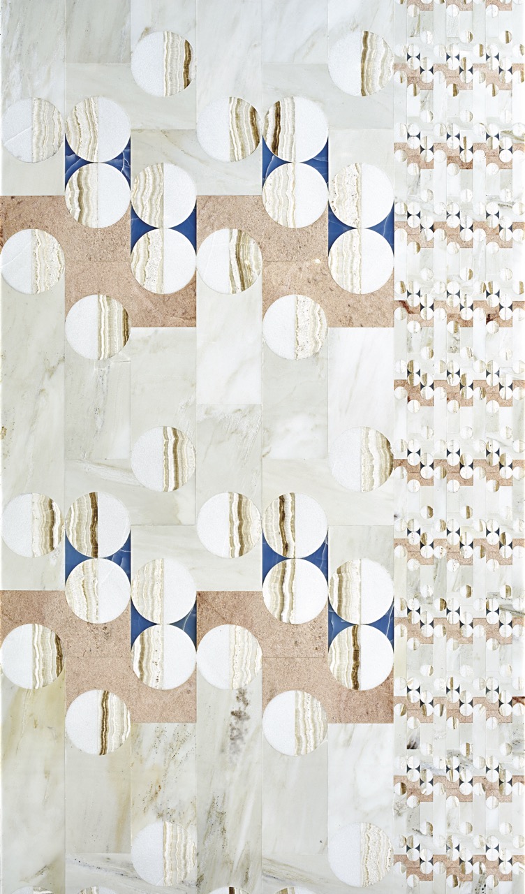 Living room table with inlaid top in Calacatta, Bianco Lasa Covelano, Rosa del Portogallo Salmone, Onice Avorio, Onice Blu Aquarel. Table legs in Chilean wood. Available in two sizes:
