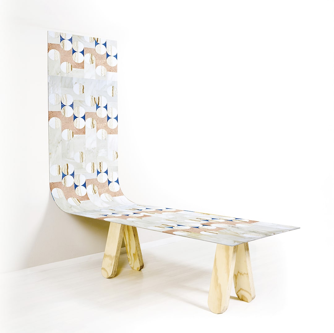 Patricia UrquiolaBallon “wallpaper”, comprises inlaid wall covering, curved element, table top. With its slim thickness of only 0,8 cm, the pattern finds its application on existing floors or wall coverings. The inlay becomes a work of art, the key feature of the interior design scheme.