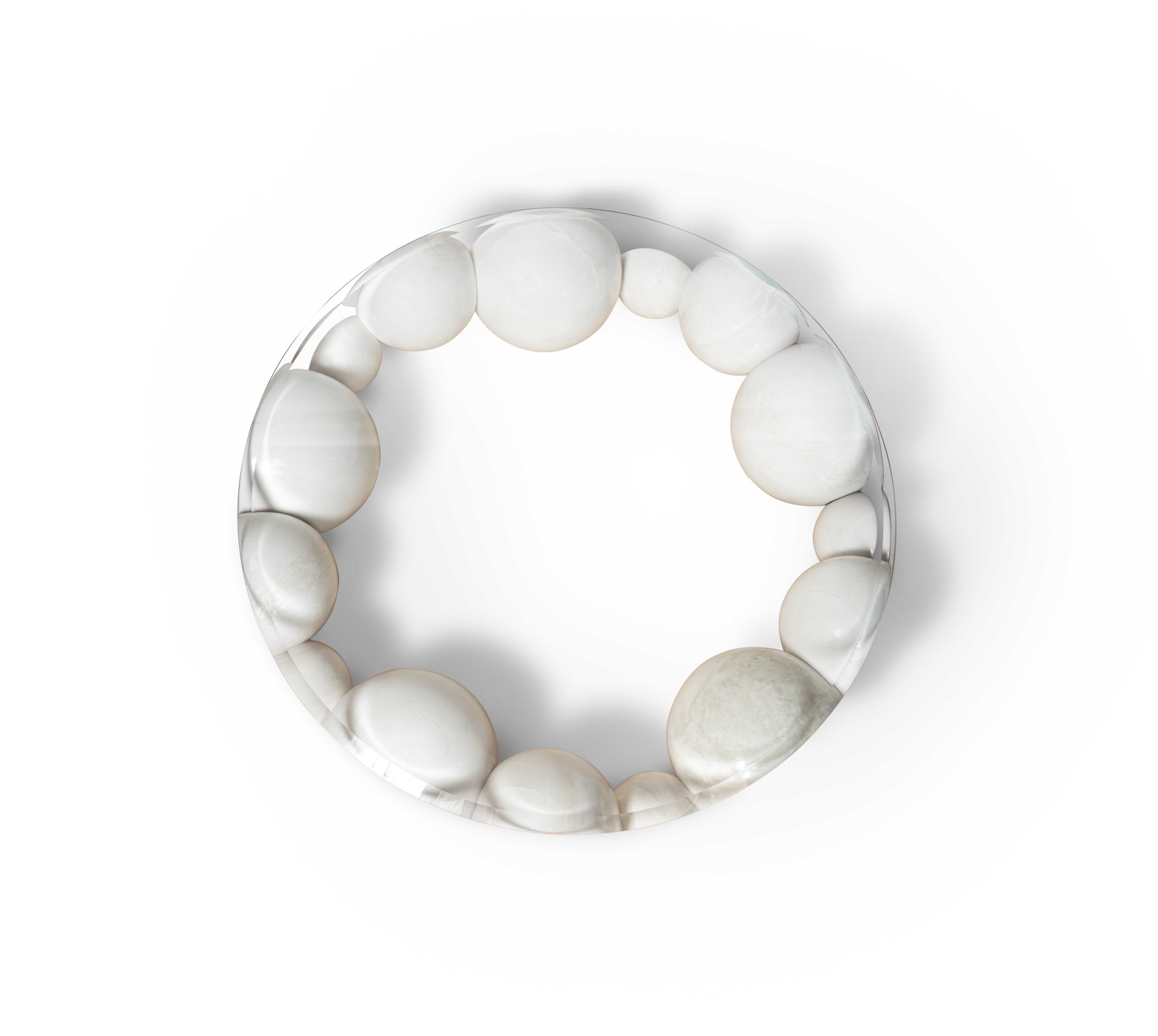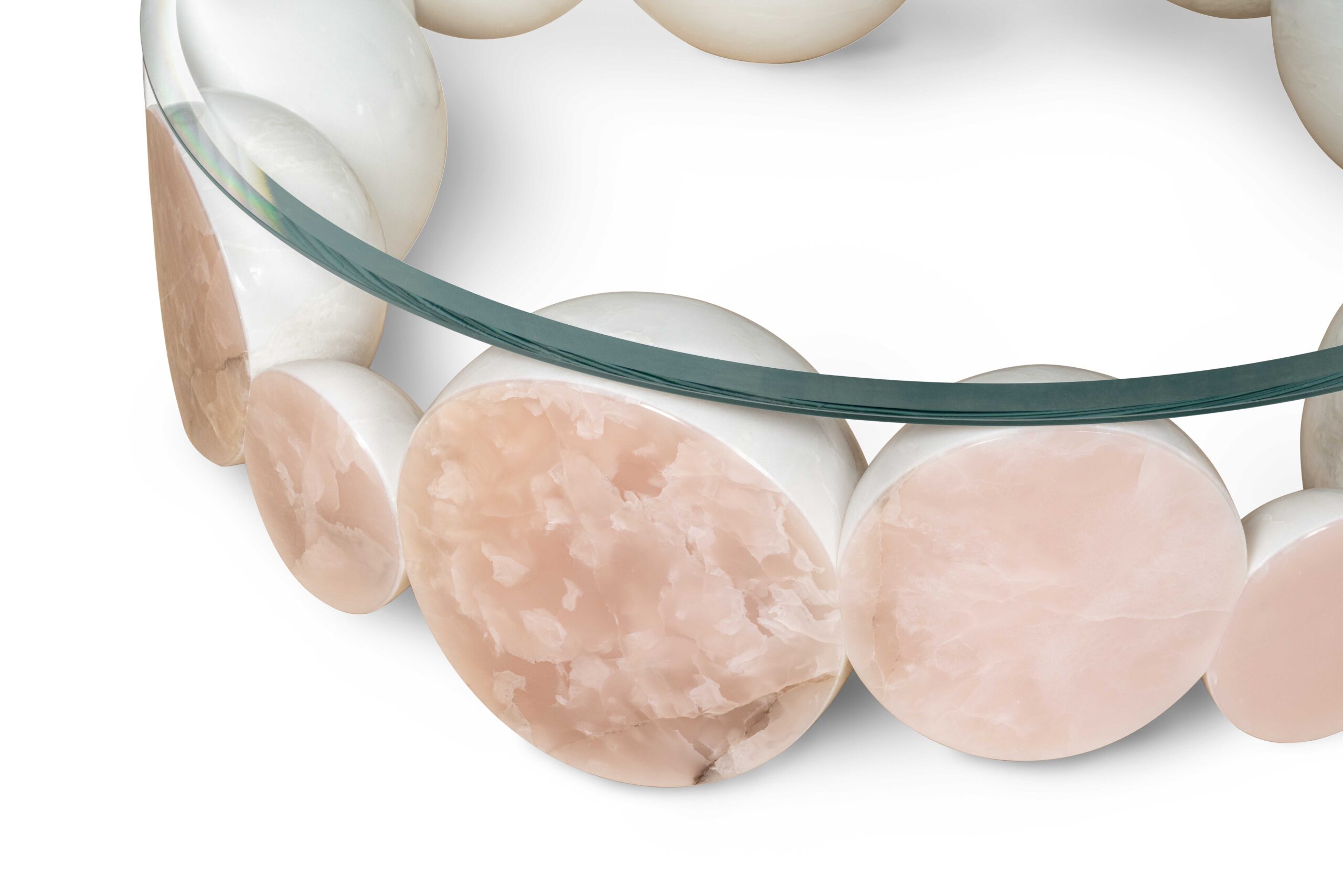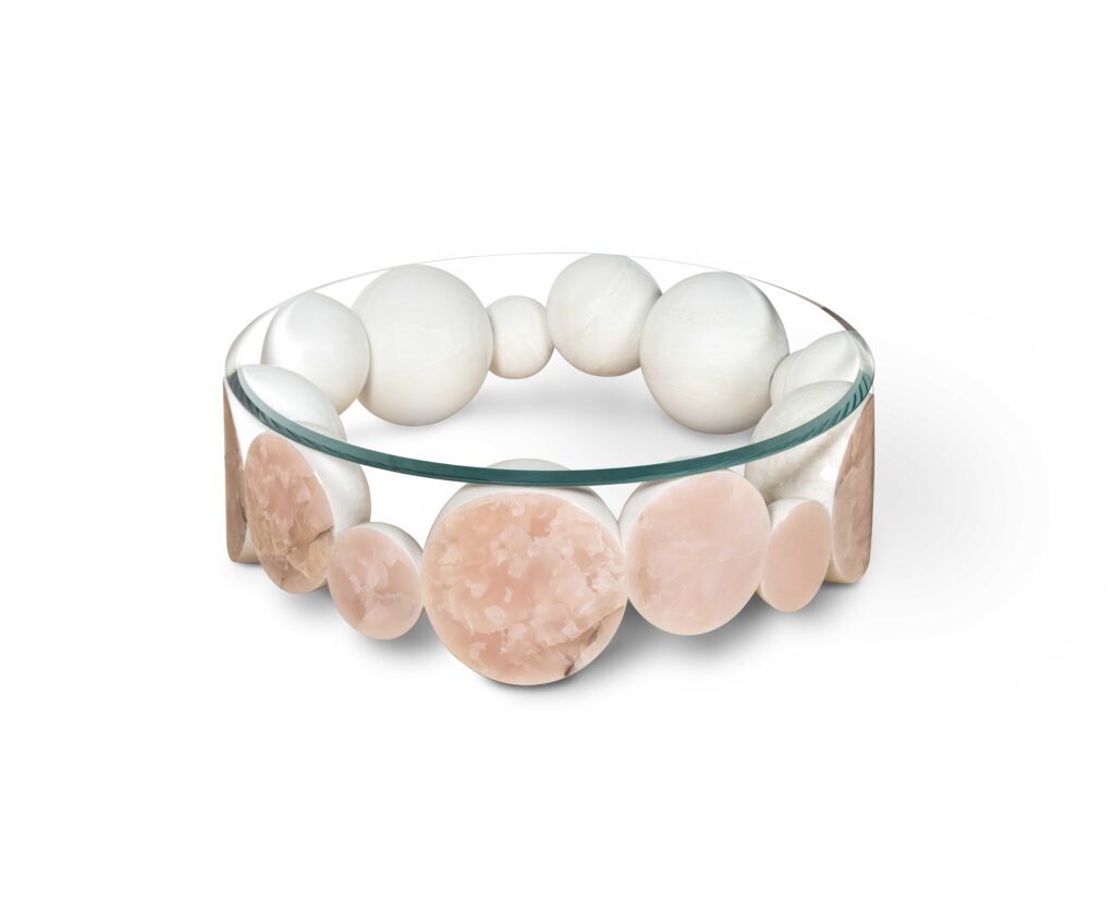 Eric Carlson – CarbondalePrecious Coffee Table, inspired by the iconic cultured pearl bracelet. The fourteen, unique pearls that compose it are made of blocks of White Namibia marble, joined together. The front of the pearls is made of Pink Onyx, to give further value to the table. The extra-clear glass top reveals the pearl bracelet in its entirety. PERLES Coffee Table is the flagship of the collection. Perles Coffee Table is the centerpiece of the collection. Highly complex, it embodies artisanal mastery and refined materials.