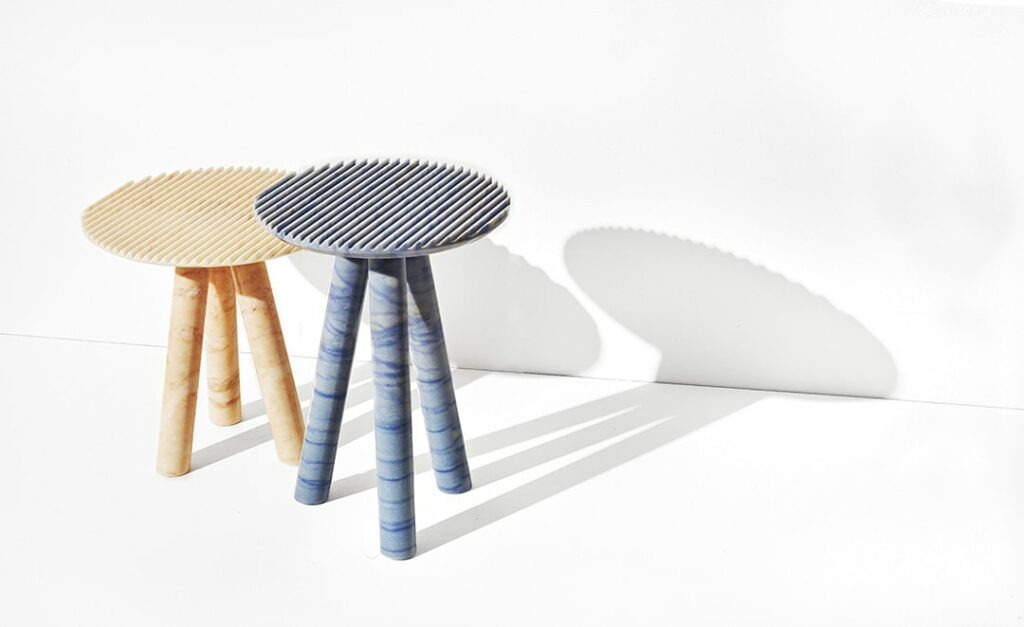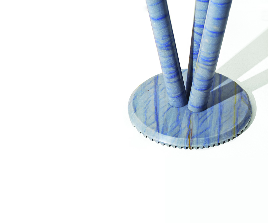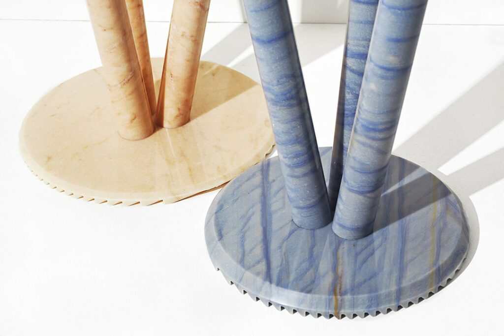 Patricia UrquiolaCoffee Tables available in Rosa Portogallo, Azul Macauba and Calacatta. The ridged-texture tops have slanted, bevelled edge. The tubular legs underline the geometric forms and focus on the marble’s natural vein patterns.