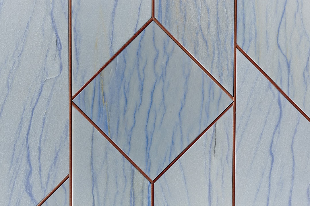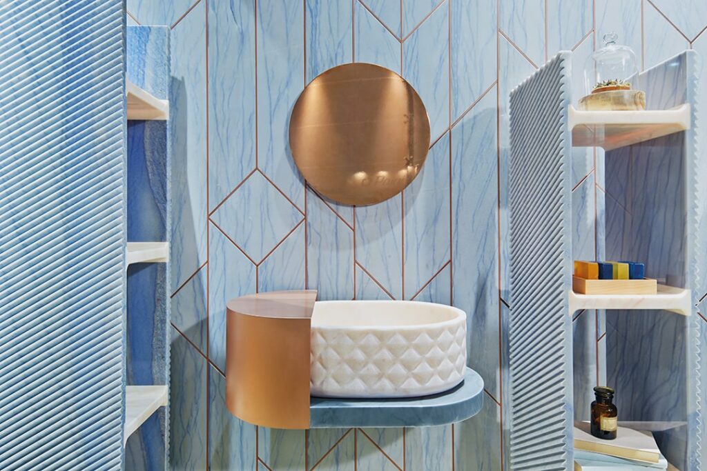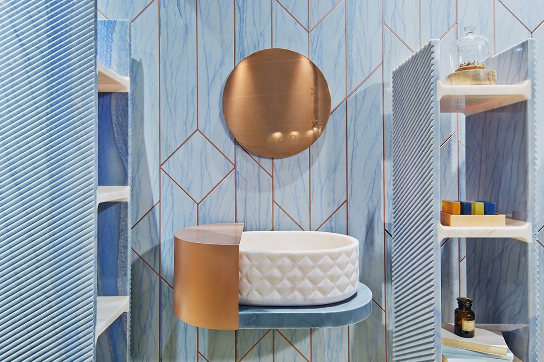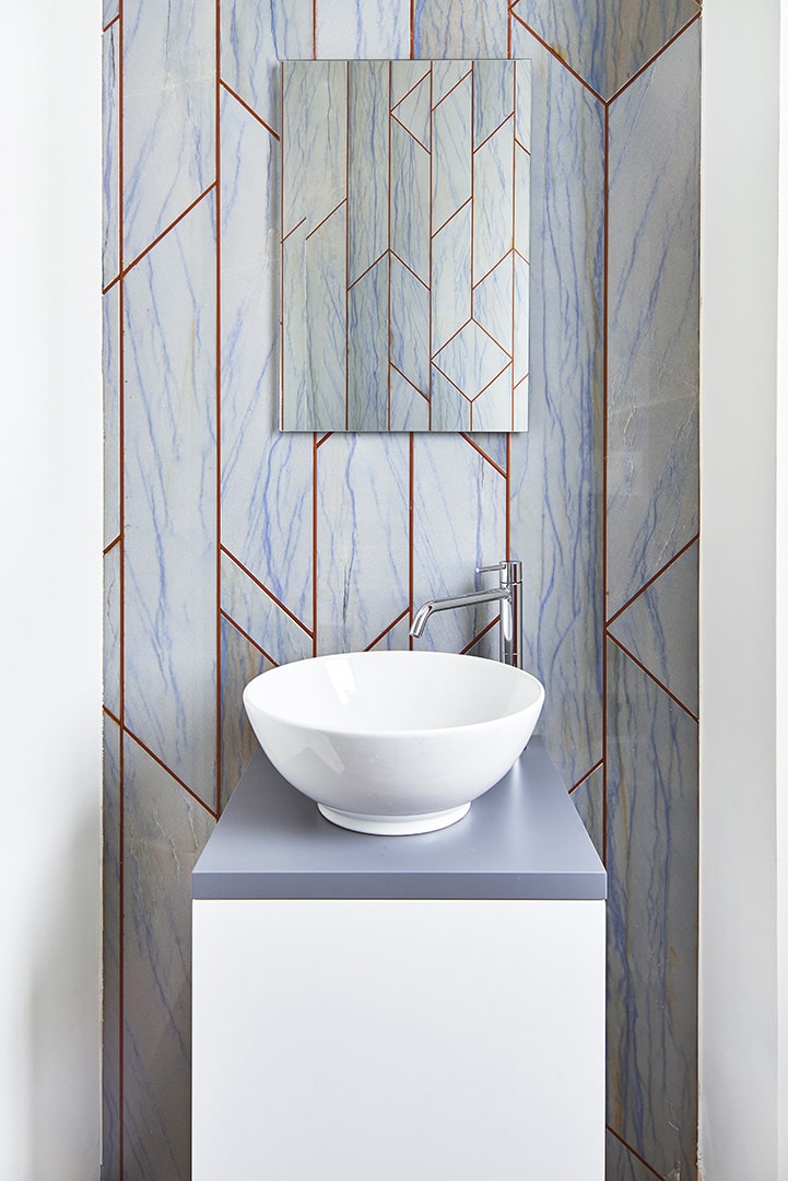 Patricia UrquiolaModular marble inlay in Brazilian Azul Macauba stone and strips of copper-coloured metal that underline its midnight blue vein patterns.
