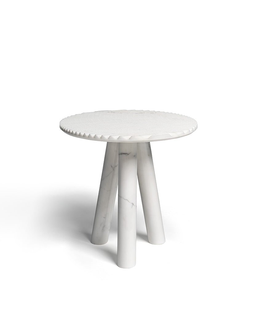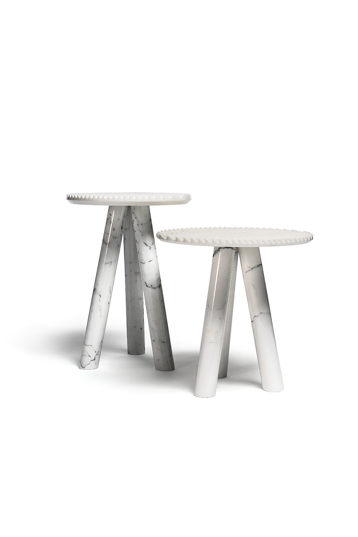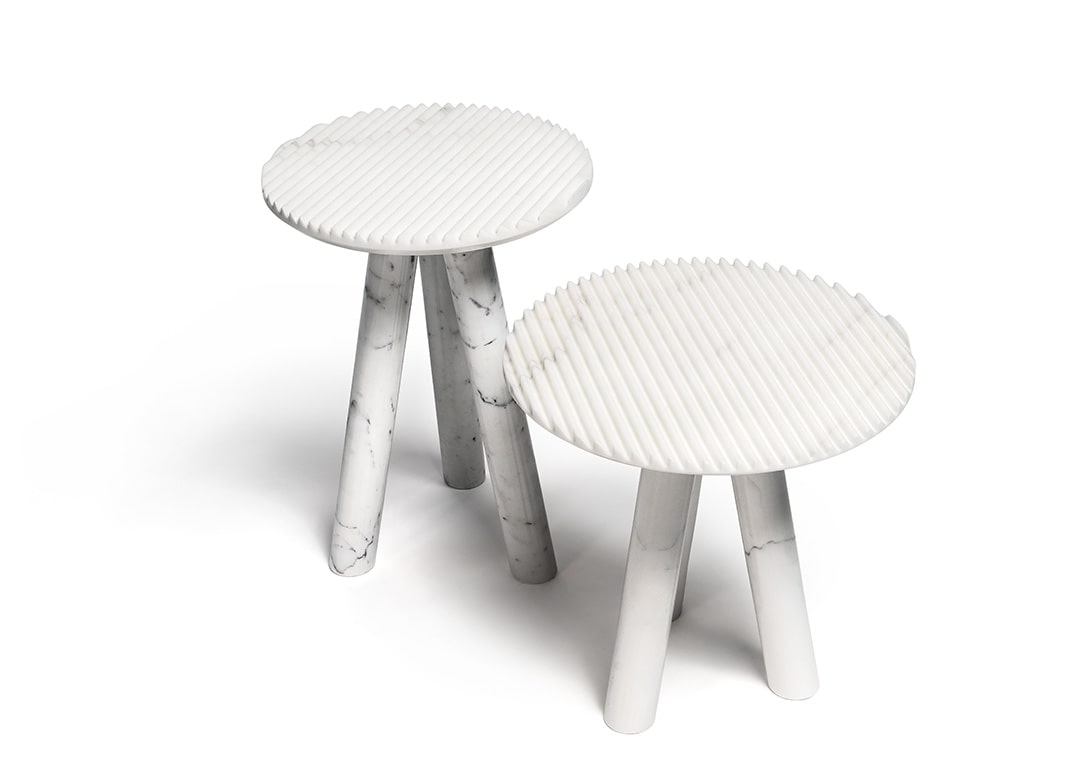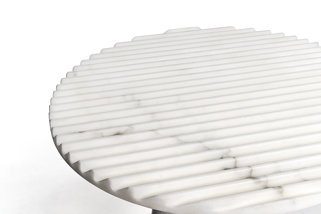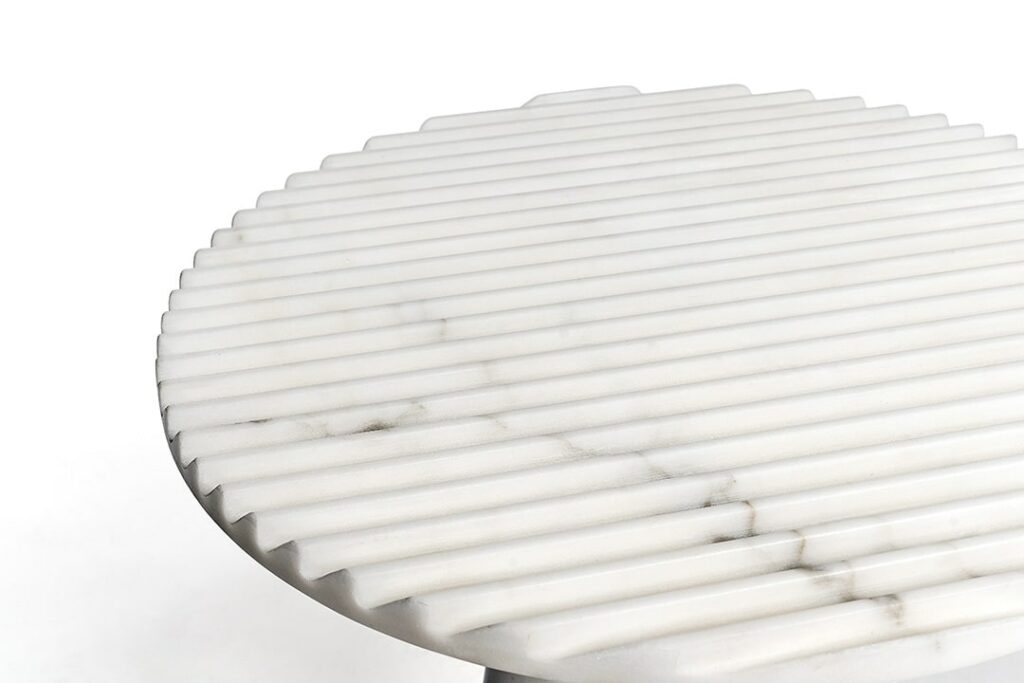 Patricia UrquiolaRabbet coffee tables in Calacatta marble. The ridged-texture tops have slanted, bevelled edge. The tubular legs underline the geometric forms and focus on the marble’s natural vein patterns. The tables are available in two different sizes and can be purchased individually.